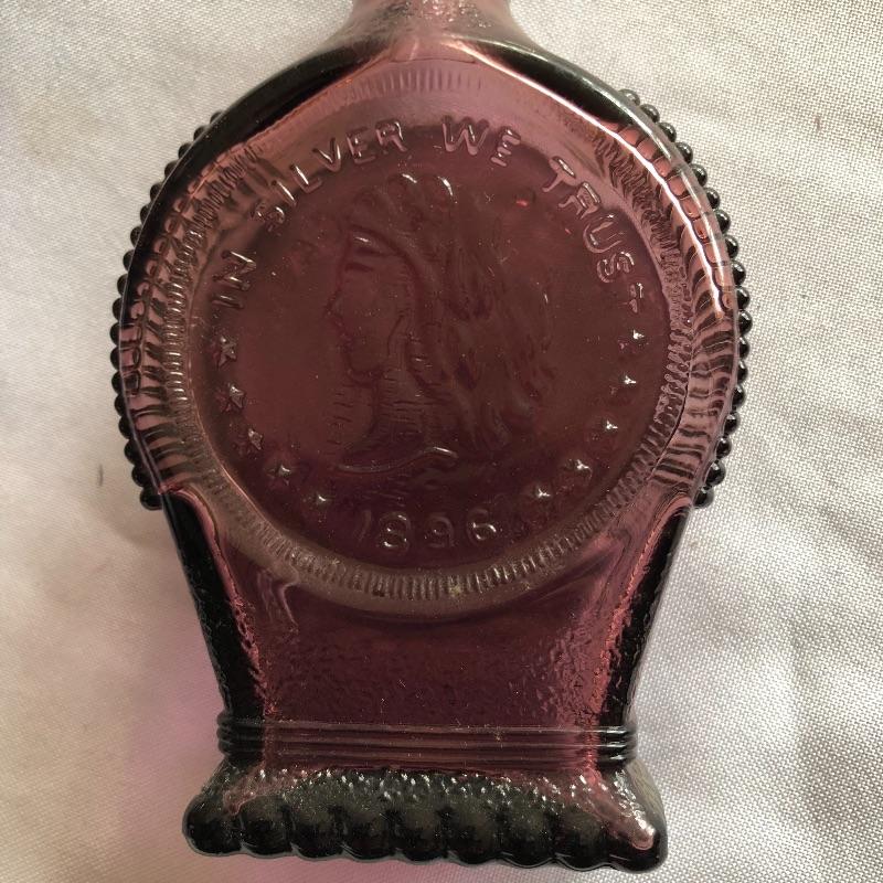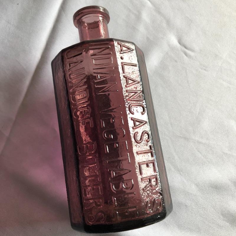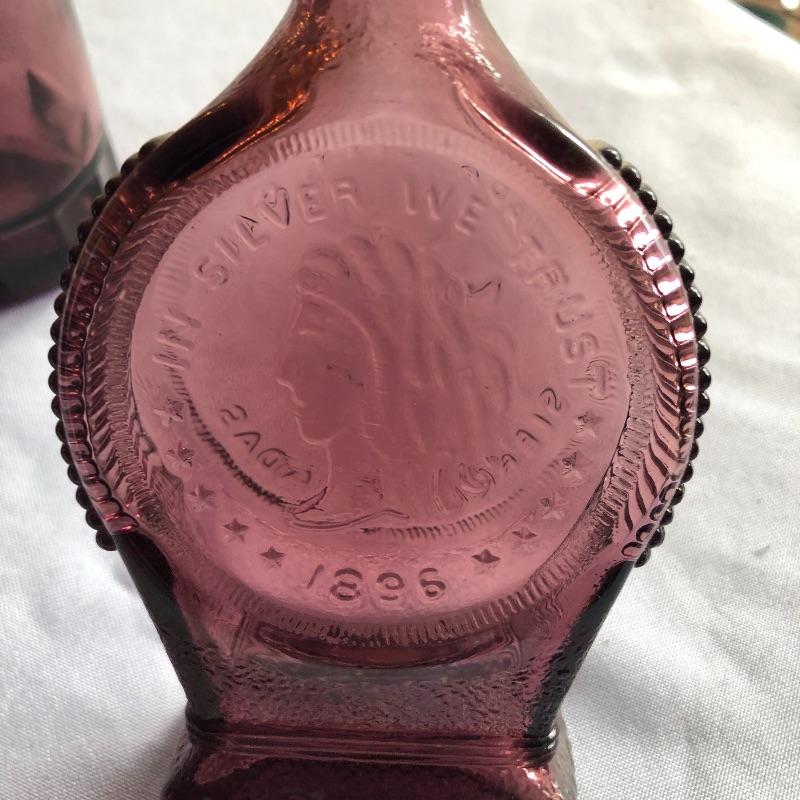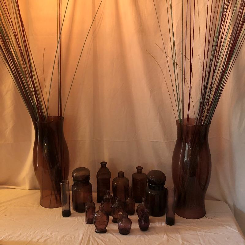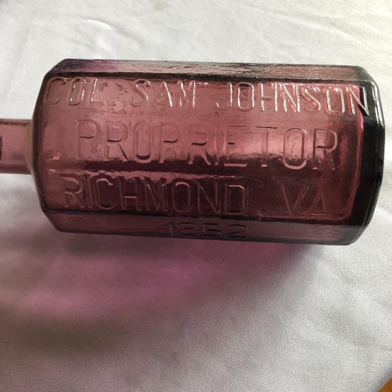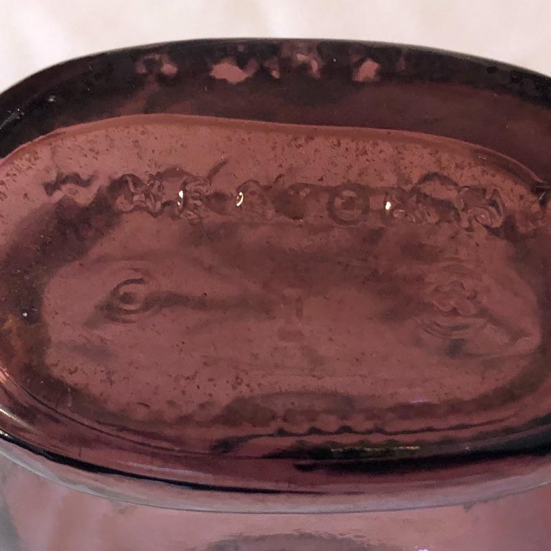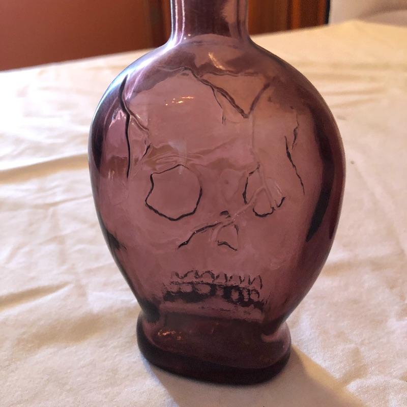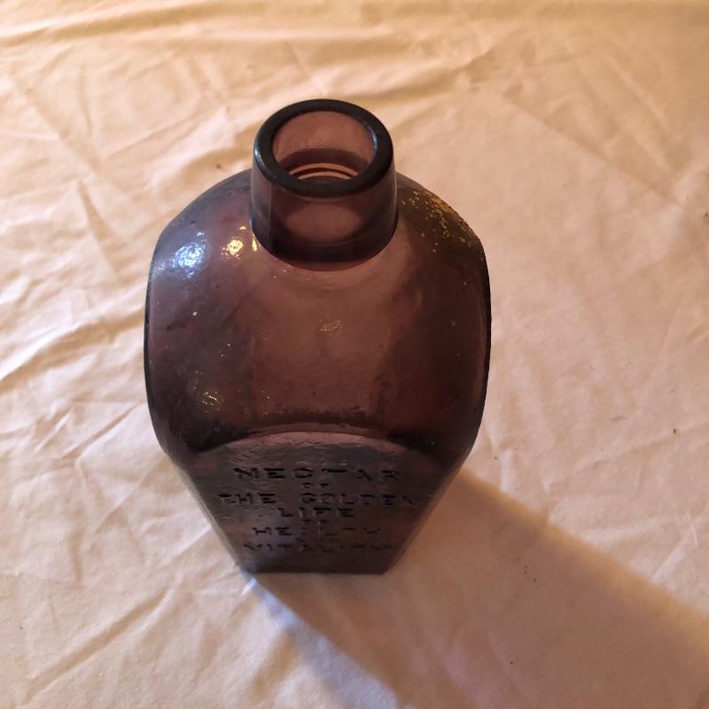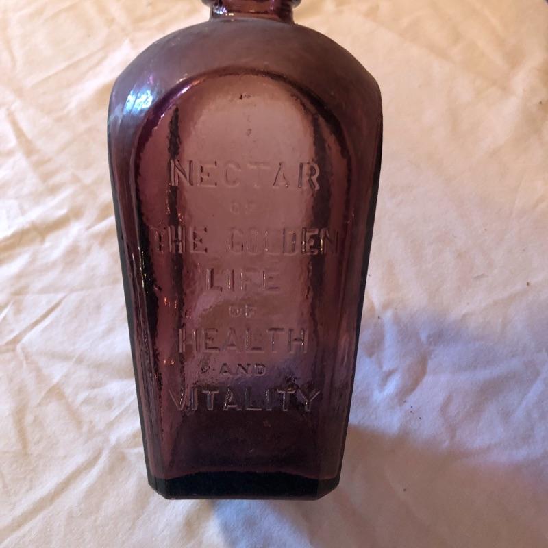 This lot includes two hurricane shades, two narrow flower vases, two purple containers with lids and eleven purple bottles. The fish shaped bottle reads, “Children’s Delight.” The skull bottle appears to read, “H O W 71 and “W Heaton NJ” on the bottom. Next photographed bottle reads, “King’s Patent Balsam of Life.” Oval bottle reads, “In Sliver We Trust 1896.” The larger bottle reads, “Nectar of The Golden Life of Health And Vitality.” The last two bottles read, “Herring’s Bitters and “Col. Sam Johnson Proprietor Richmond, Va 1852.” Shipping Available!