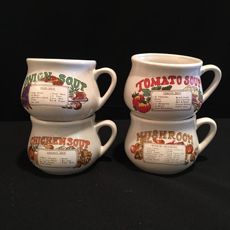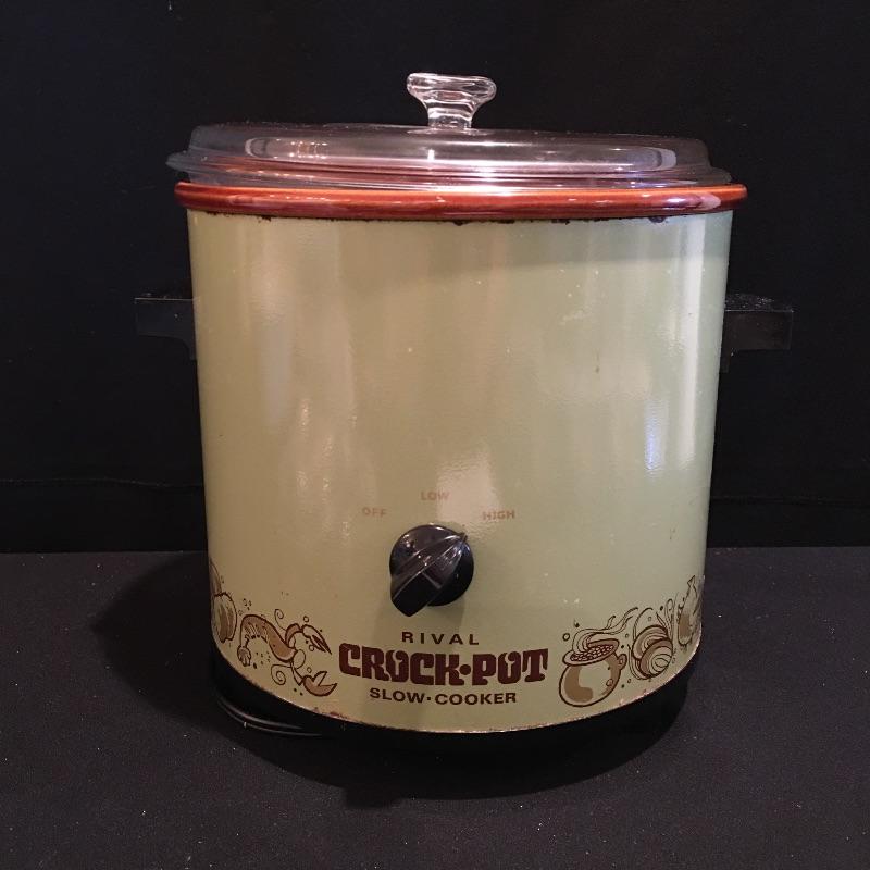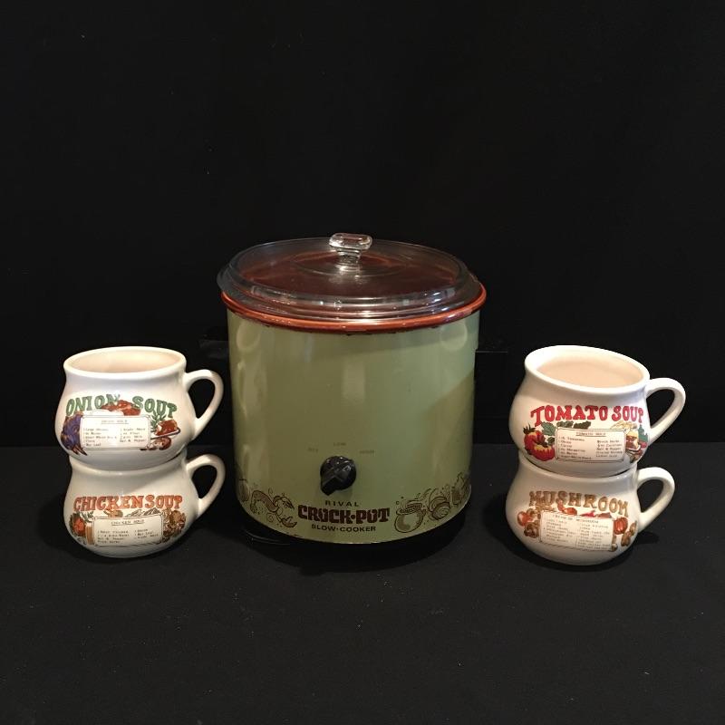 Go retro with this avocado colored Rival Crock Pot and four soup mugs with recipes on them. Crock Pot measures 9”D x 9.5” tall and turned on when tested.