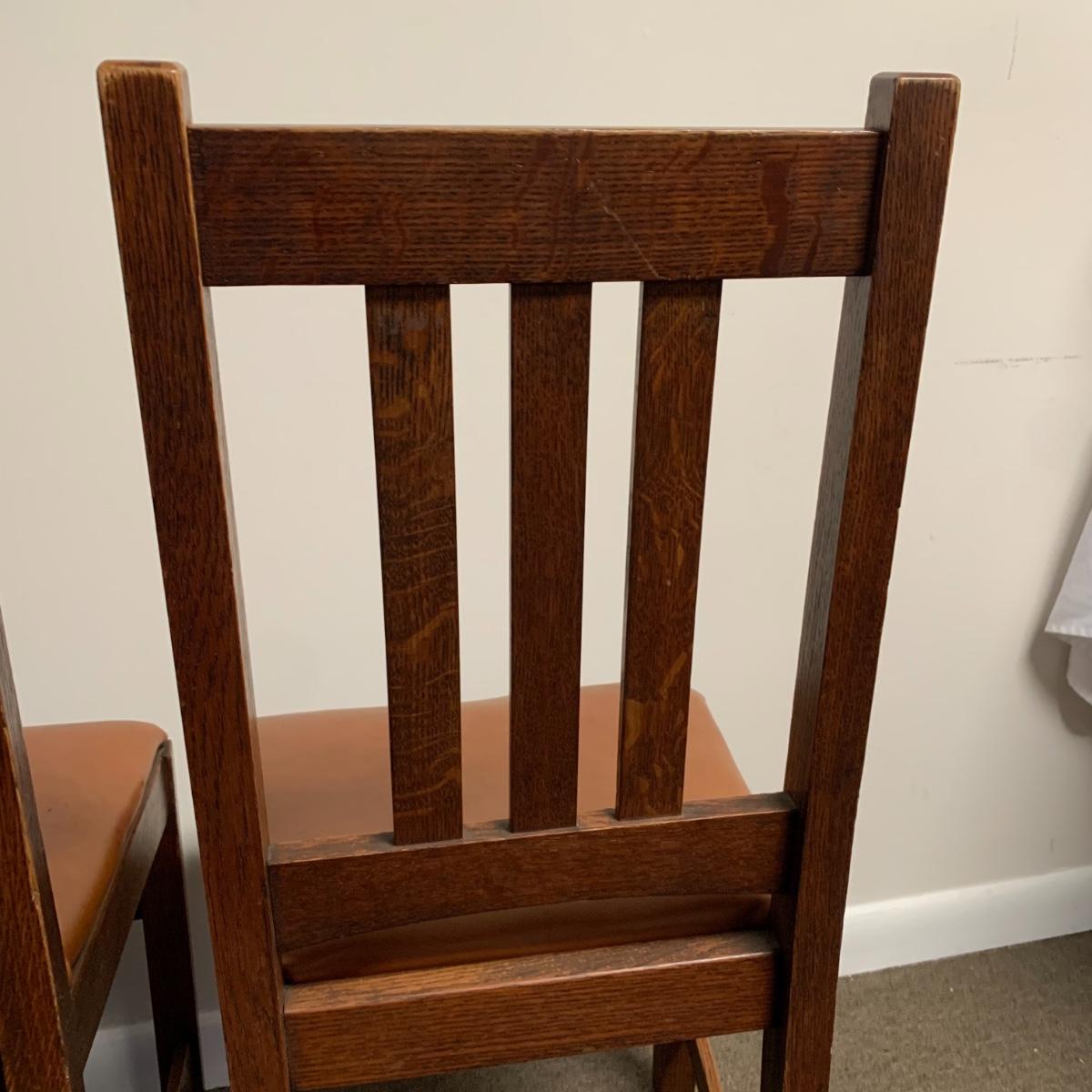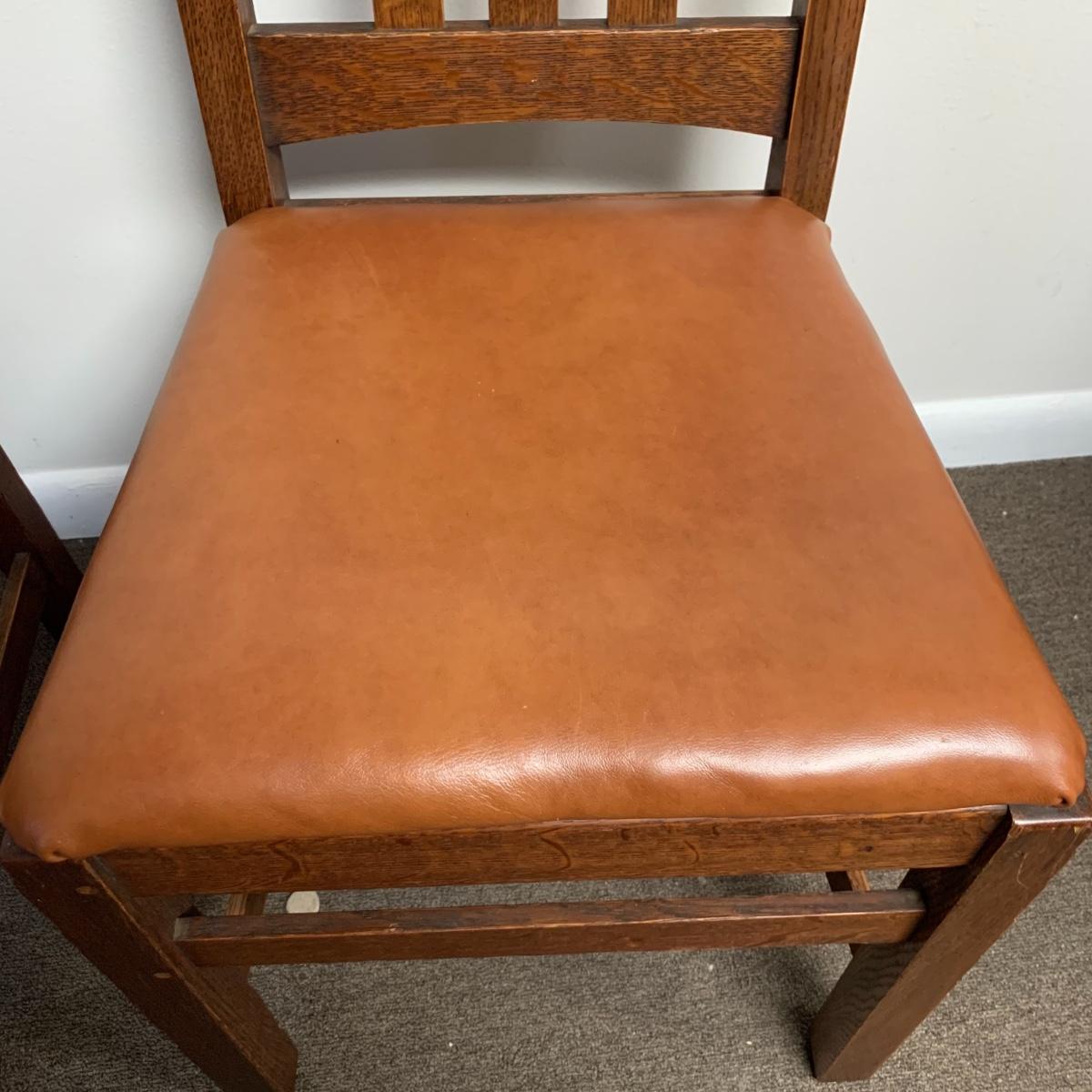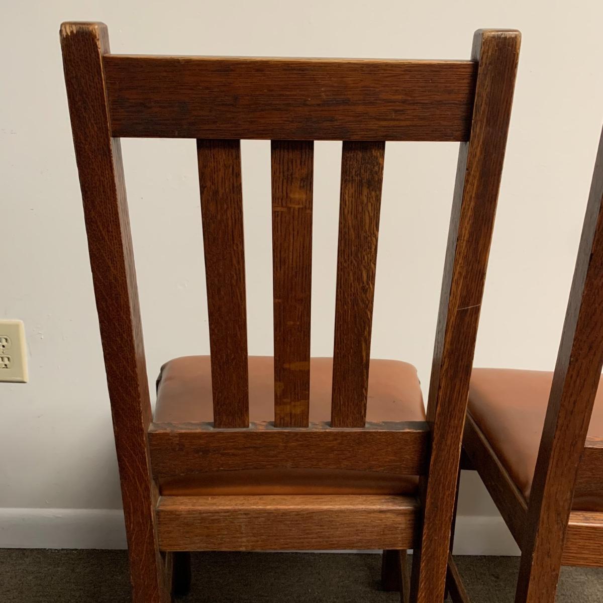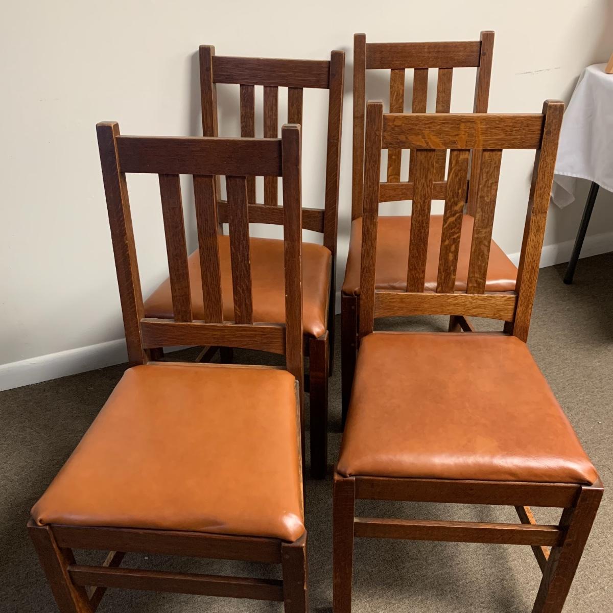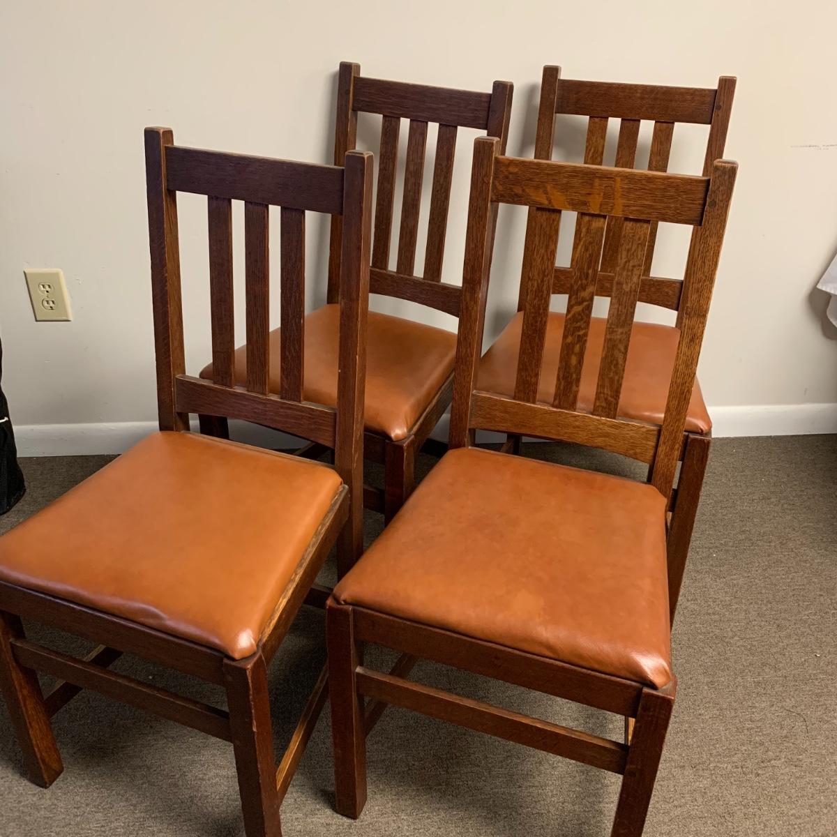 This lot includes a set of 4 mission style chairs. The chairs are made of a sturdy darker wood and have leather seat pads. There is a stamp on the inside of the bottom of the chair but unsure what the stamp says. Possible Charles P. Limbert chairs? Can’t verify. The chairs have some slight marks on the them (see photos). They measure about 16in x 14in x 37in. Shipping is not available through our UPS partners but you are welcome to coordinate your own shipping to be picked up during our pick up hours.