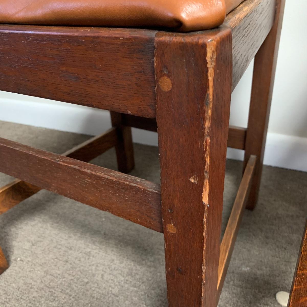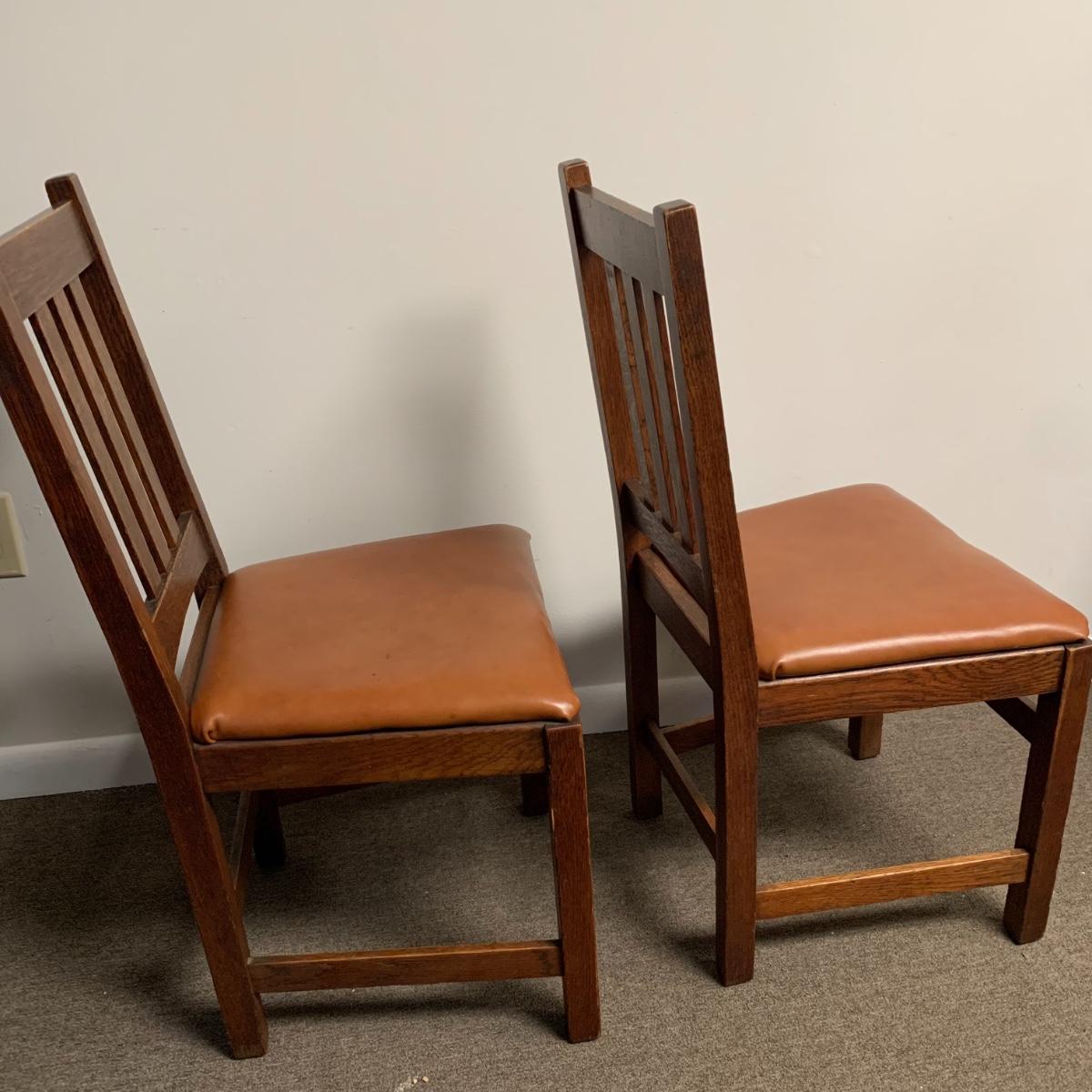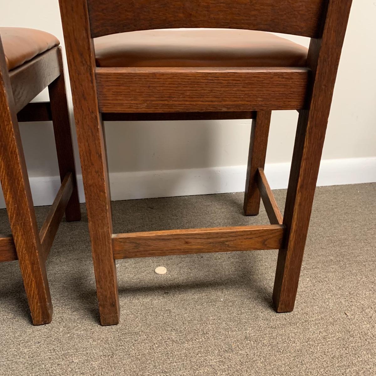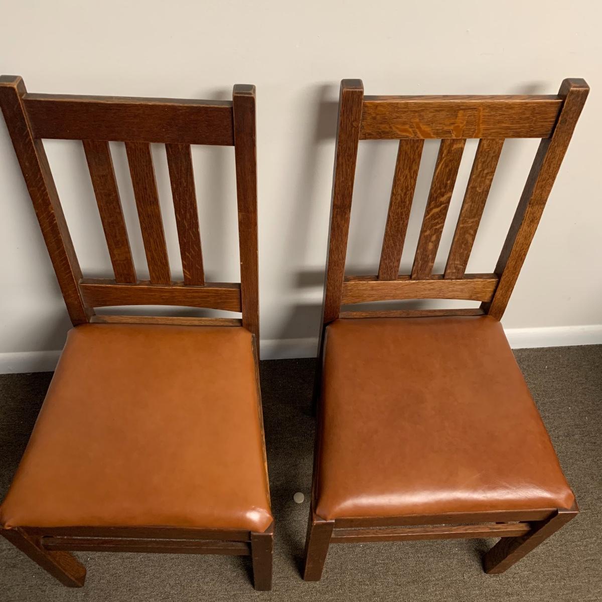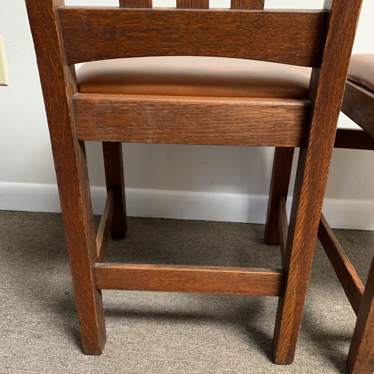 This lot includes a set of 4 mission style chairs. The chairs are made of a sturdy darker wood and have leather seat pads. There is a stamp on the inside of the bottom of the chair but unsure what the stamp says. Possible Charles P. Limbert chairs? Can’t verify. The chairs have some slight marks on the them (see photos). They measure about 16in x 14in x 37in. Shipping is not available through our UPS partners but you are welcome to coordinate your own shipping to be picked up during our pick up hours.