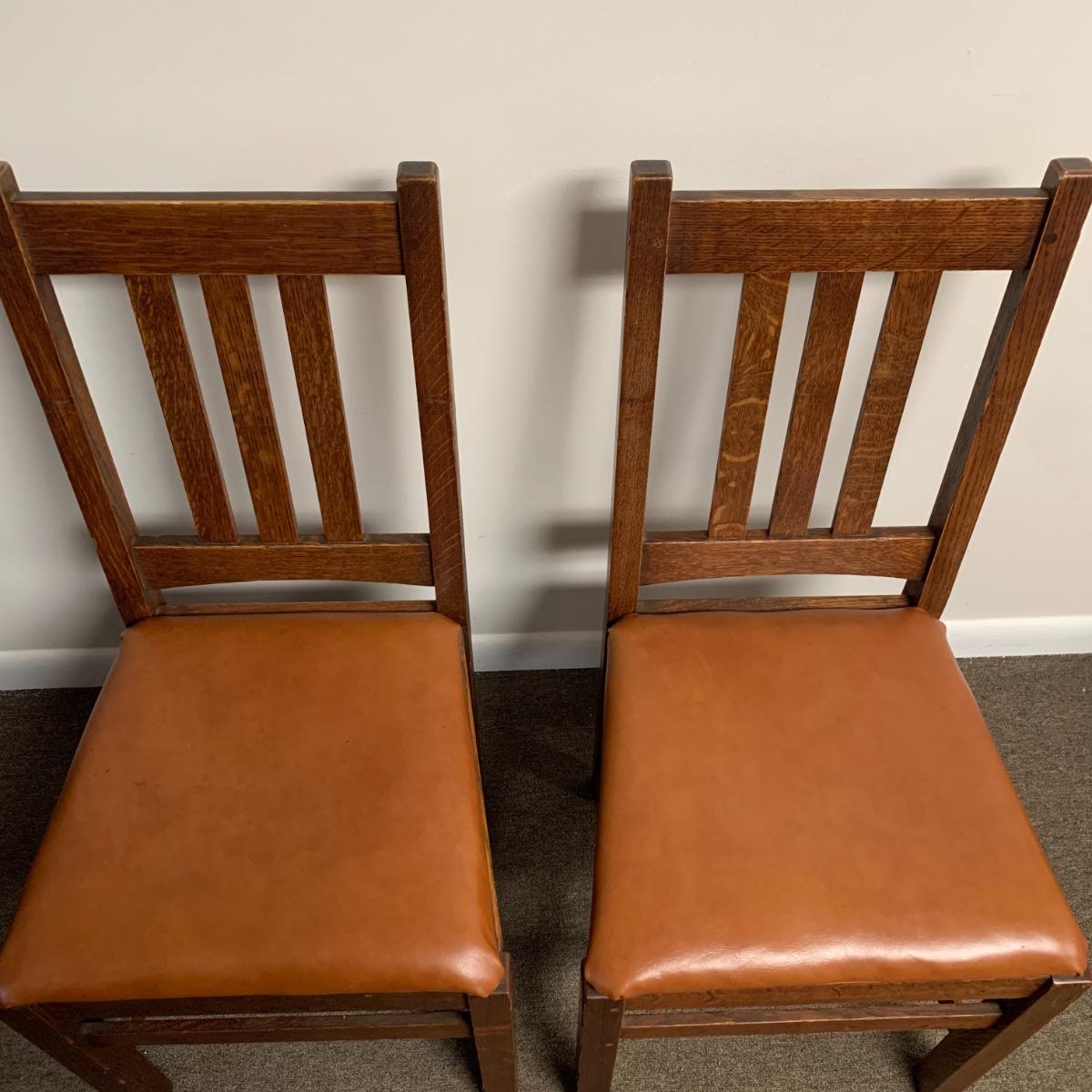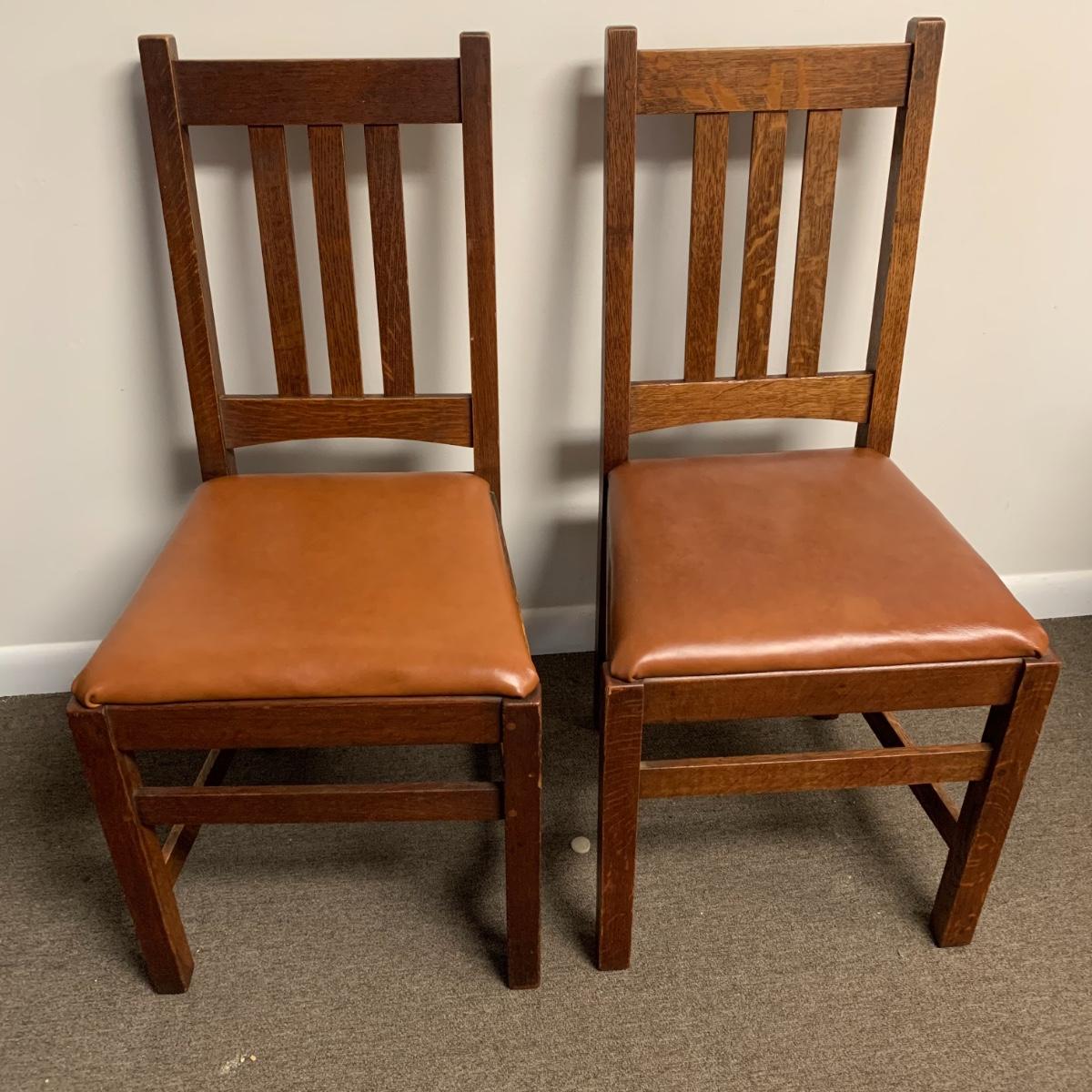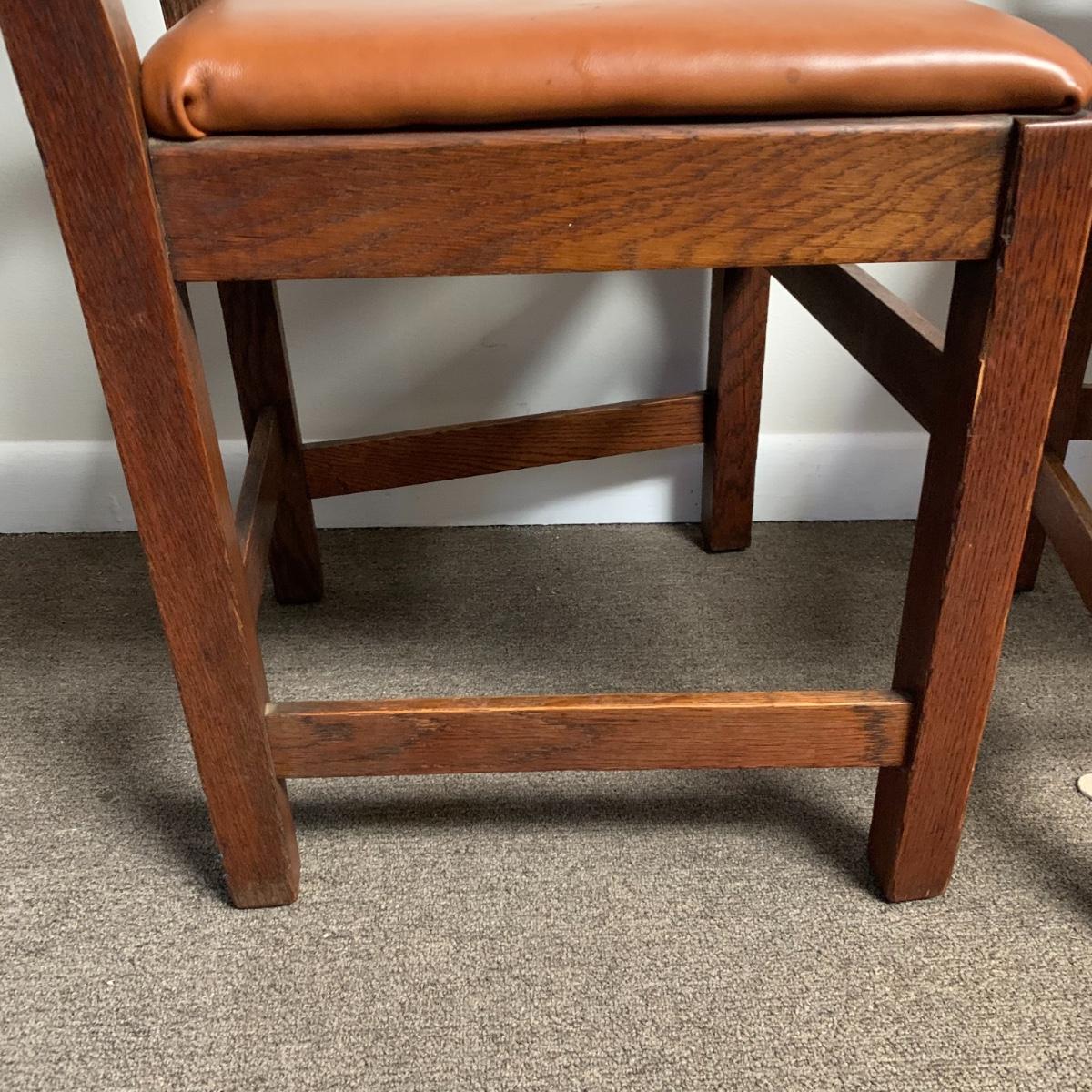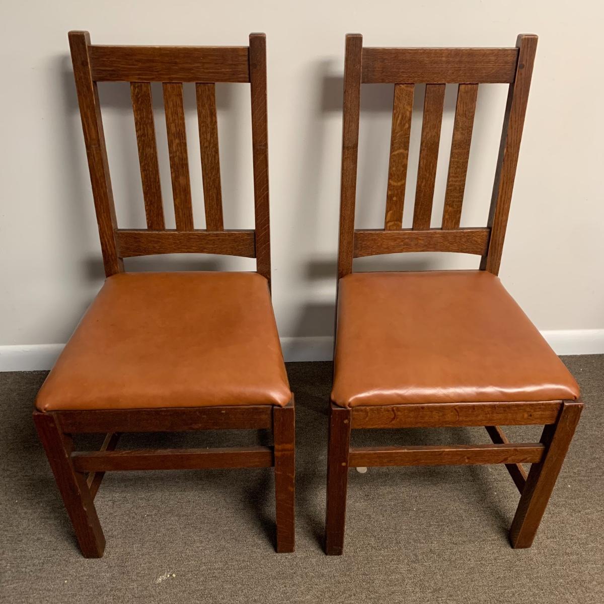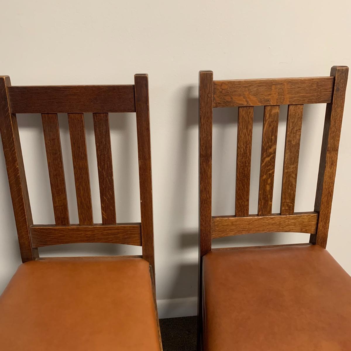 This lot includes a set of 4 mission style chairs. The chairs are made of a sturdy darker wood and have leather seat pads. There is a stamp on the inside of the bottom of the chair but unsure what the stamp says. Possible Charles P. Limbert chairs? Can’t verify. The chairs have some slight marks on the them (see photos). They measure about 16in x 14in x 37in. Shipping is not available through our UPS partners but you are welcome to coordinate your own shipping to be picked up during our pick up hours.