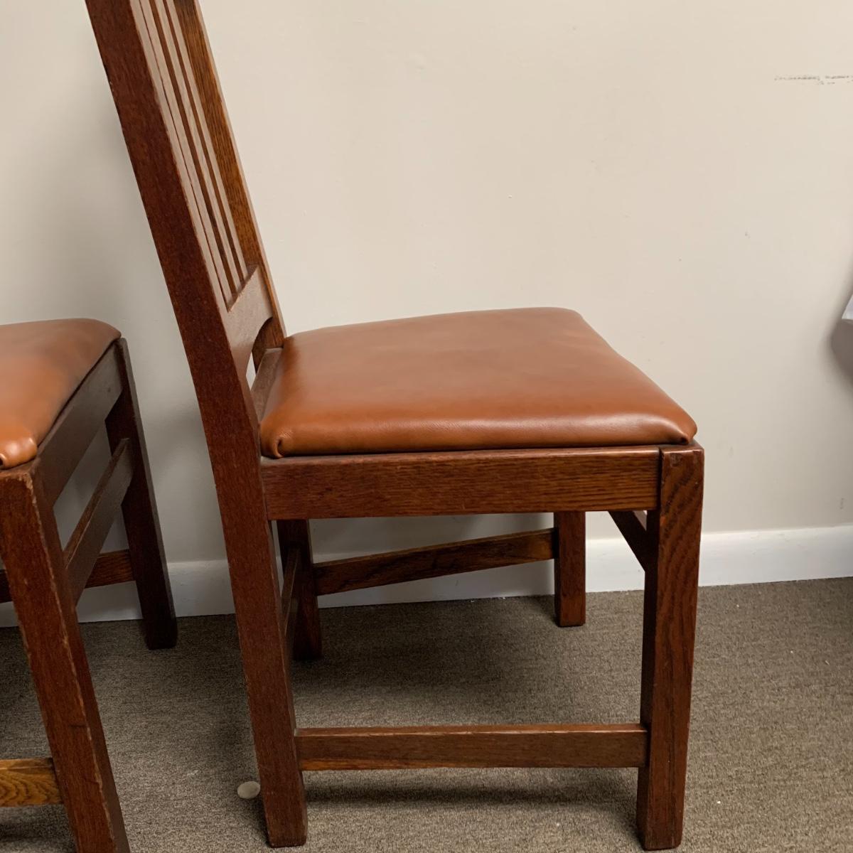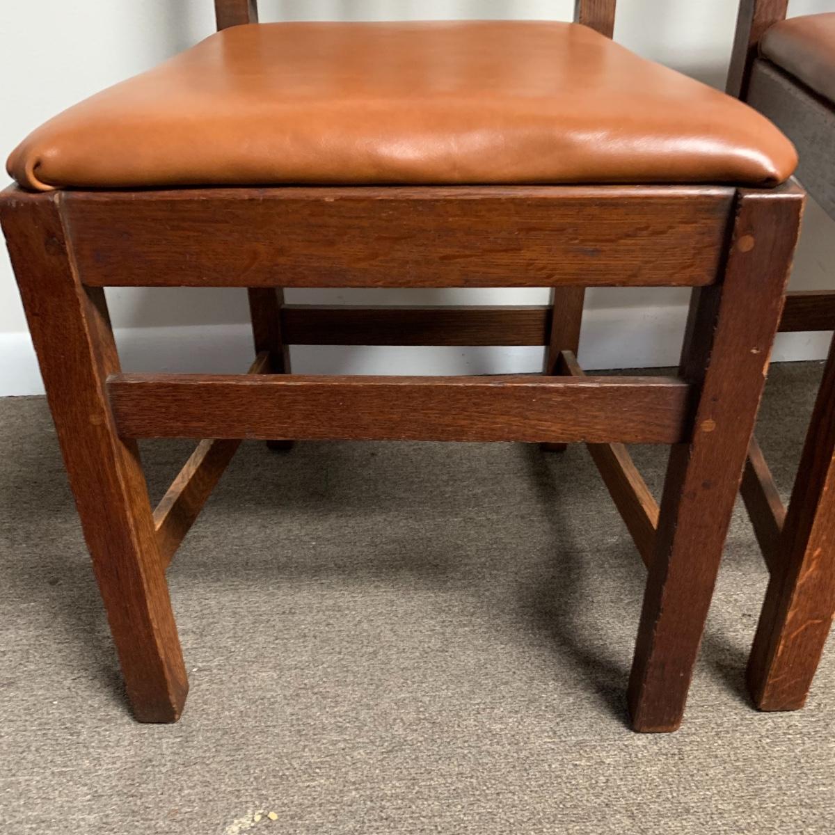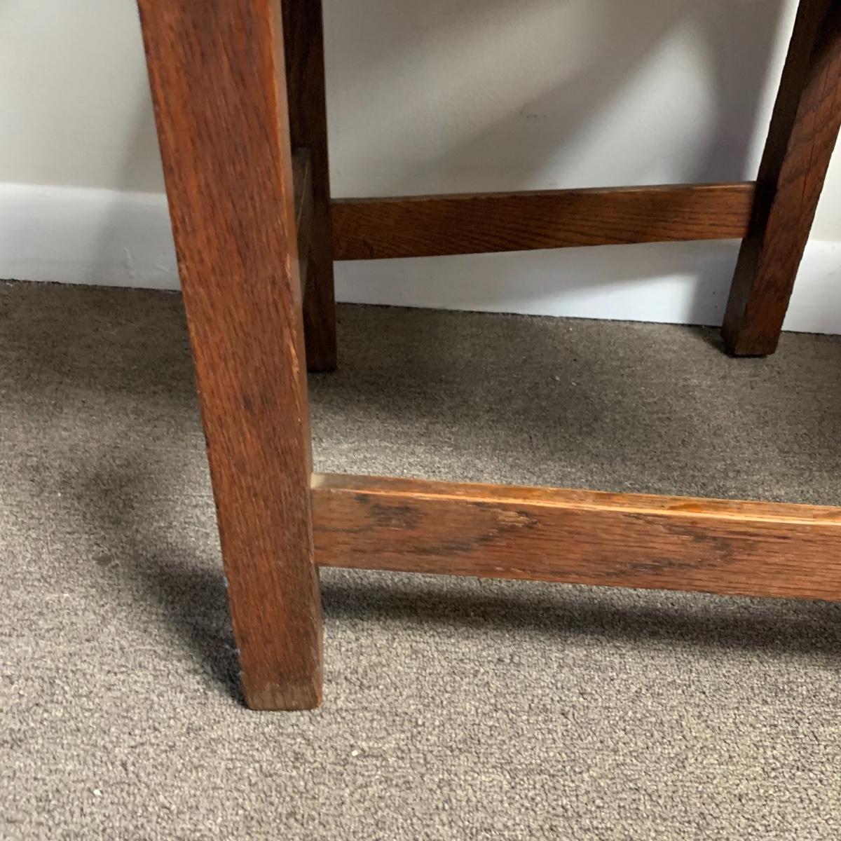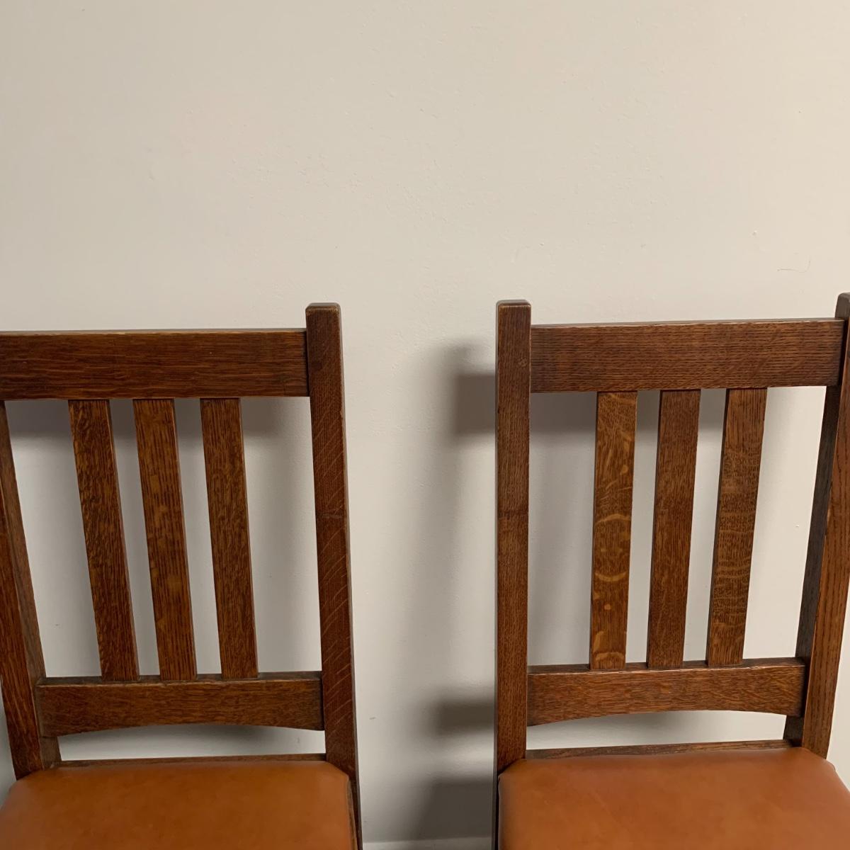 This lot includes a set of 4 mission style chairs. The chairs are made of a sturdy darker wood and have leather seat pads. There is a stamp on the inside of the bottom of the chair but unsure what the stamp says. Possible Charles P. Limbert chairs? Can’t verify. The chairs have some slight marks on the them (see photos). They measure about 16in x 14in x 37in. Shipping is not available through our UPS partners but you are welcome to coordinate your own shipping to be picked up during our pick up hours.