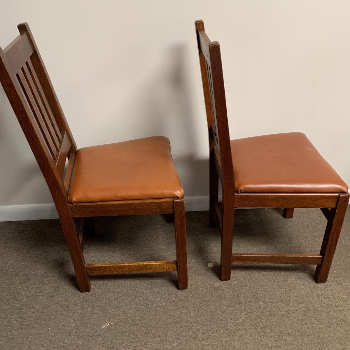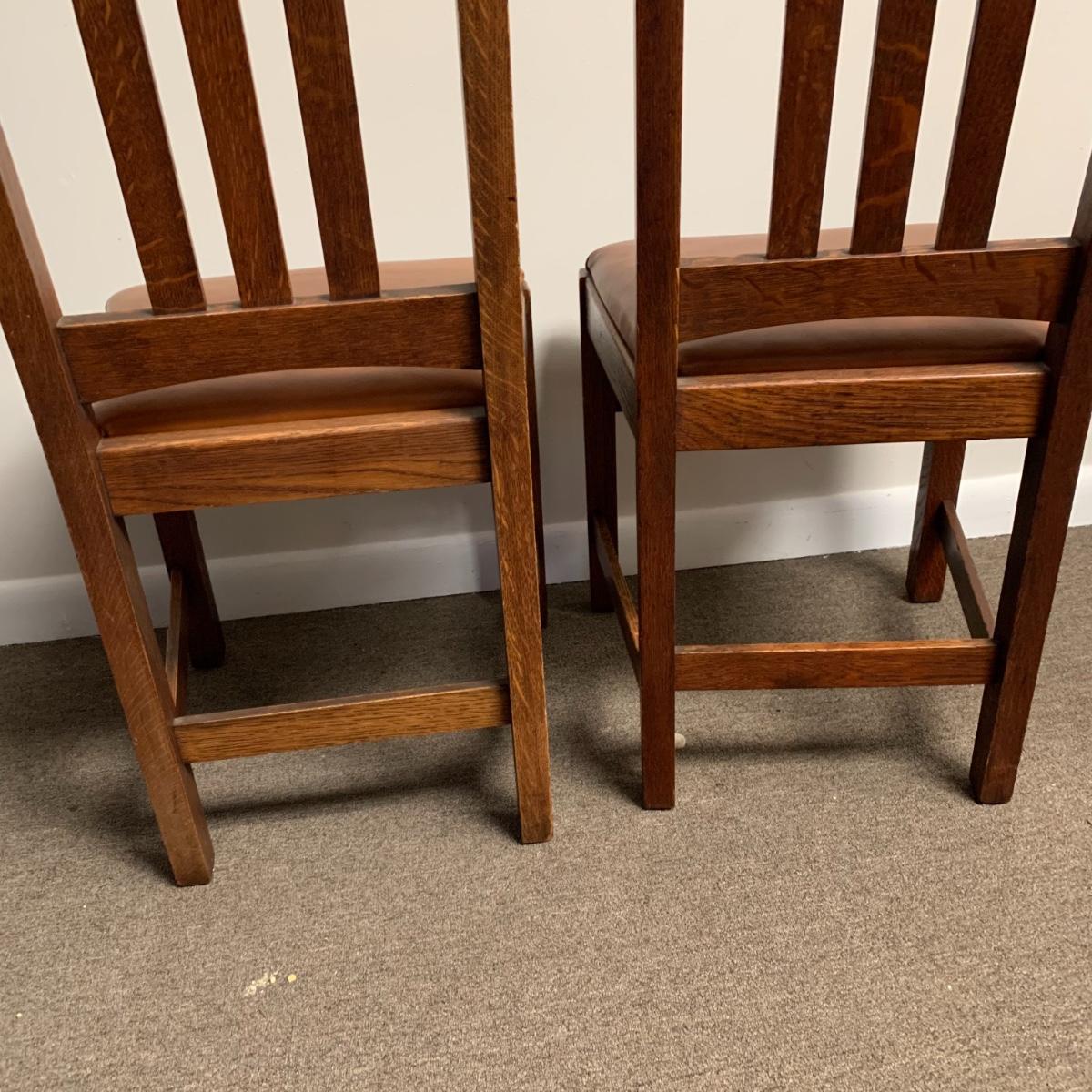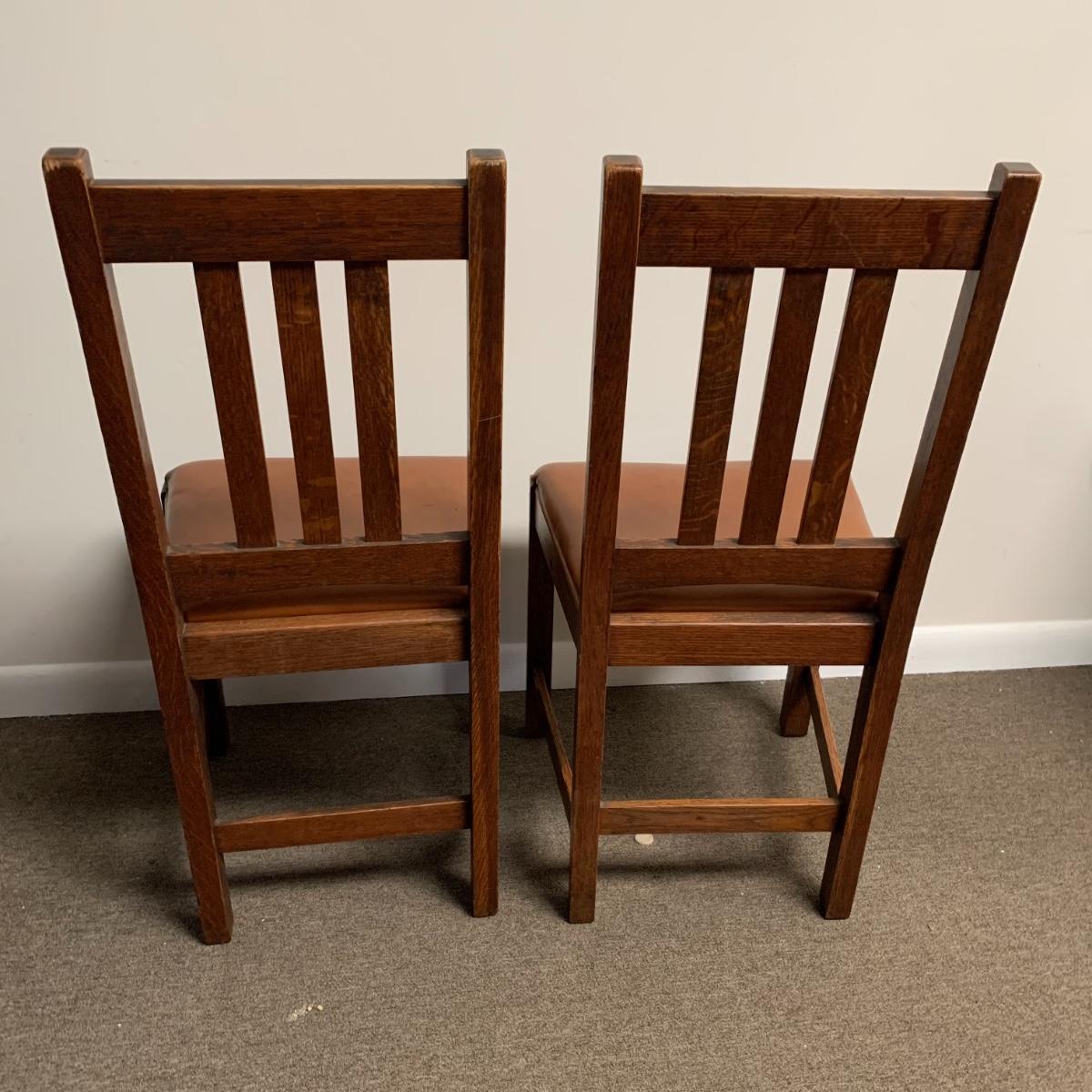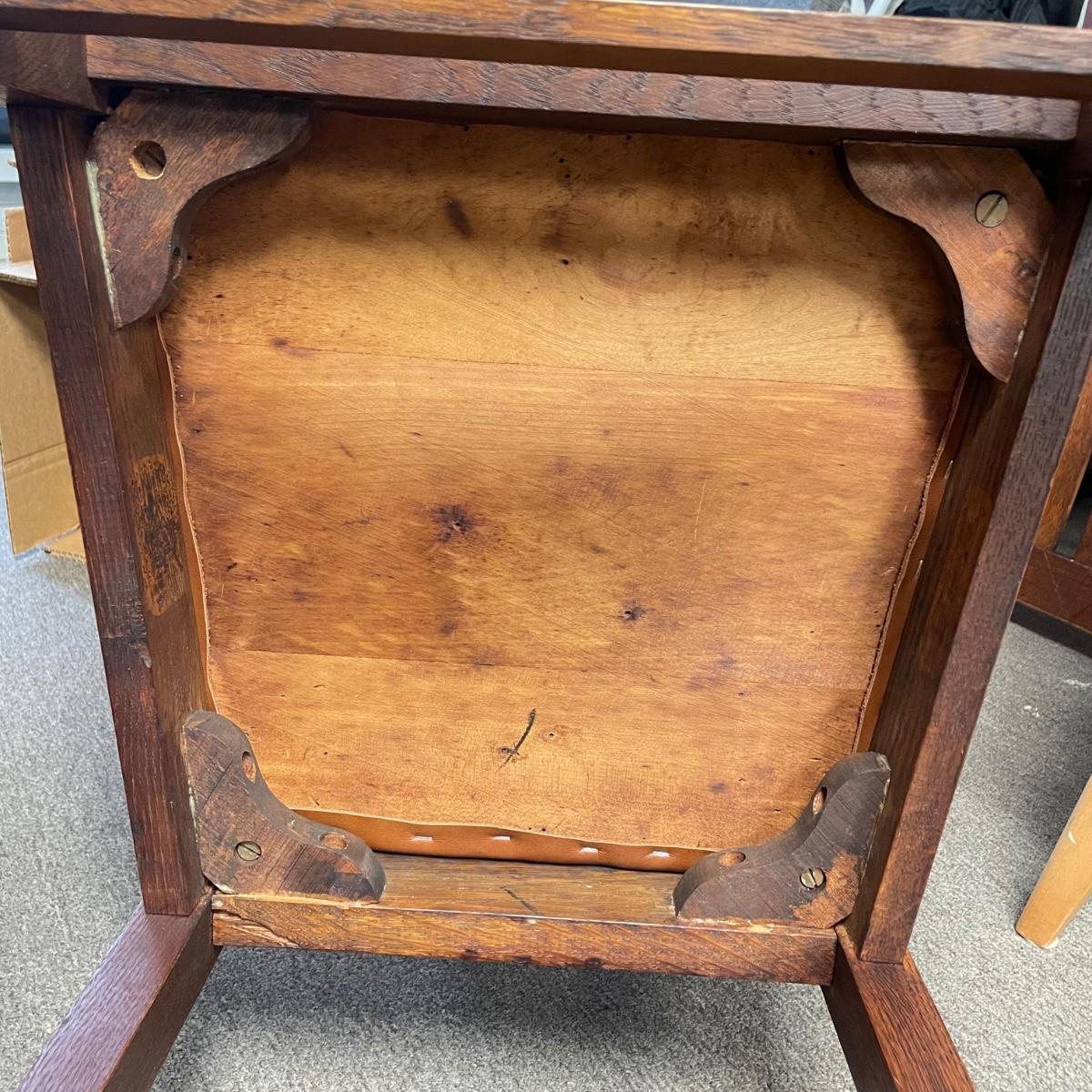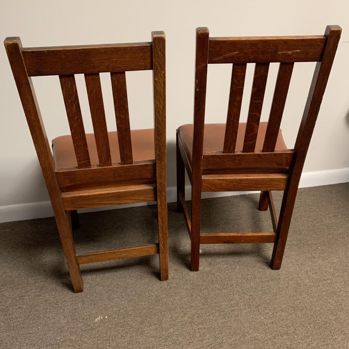 This lot includes a set of 4 mission style chairs. The chairs are made of a sturdy darker wood and have leather seat pads. There is a stamp on the inside of the bottom of the chair but unsure what the stamp says. Possible Charles P. Limbert chairs? Can’t verify. The chairs have some slight marks on the them (see photos). They measure about 16in x 14in x 37in. Shipping is not available through our UPS partners but you are welcome to coordinate your own shipping to be picked up during our pick up hours.