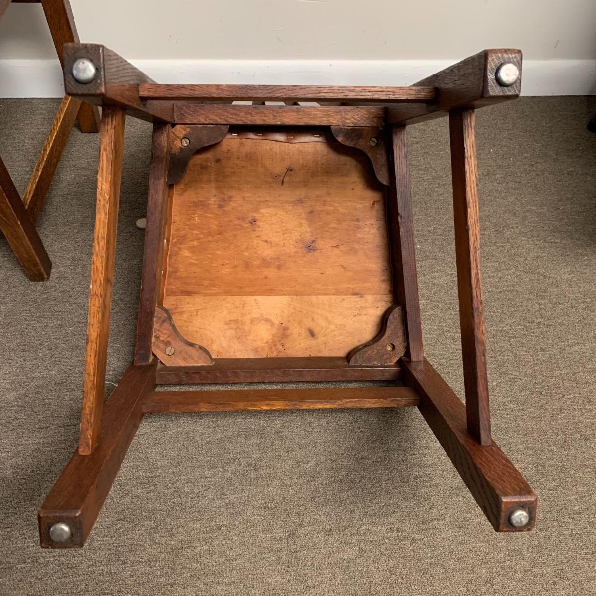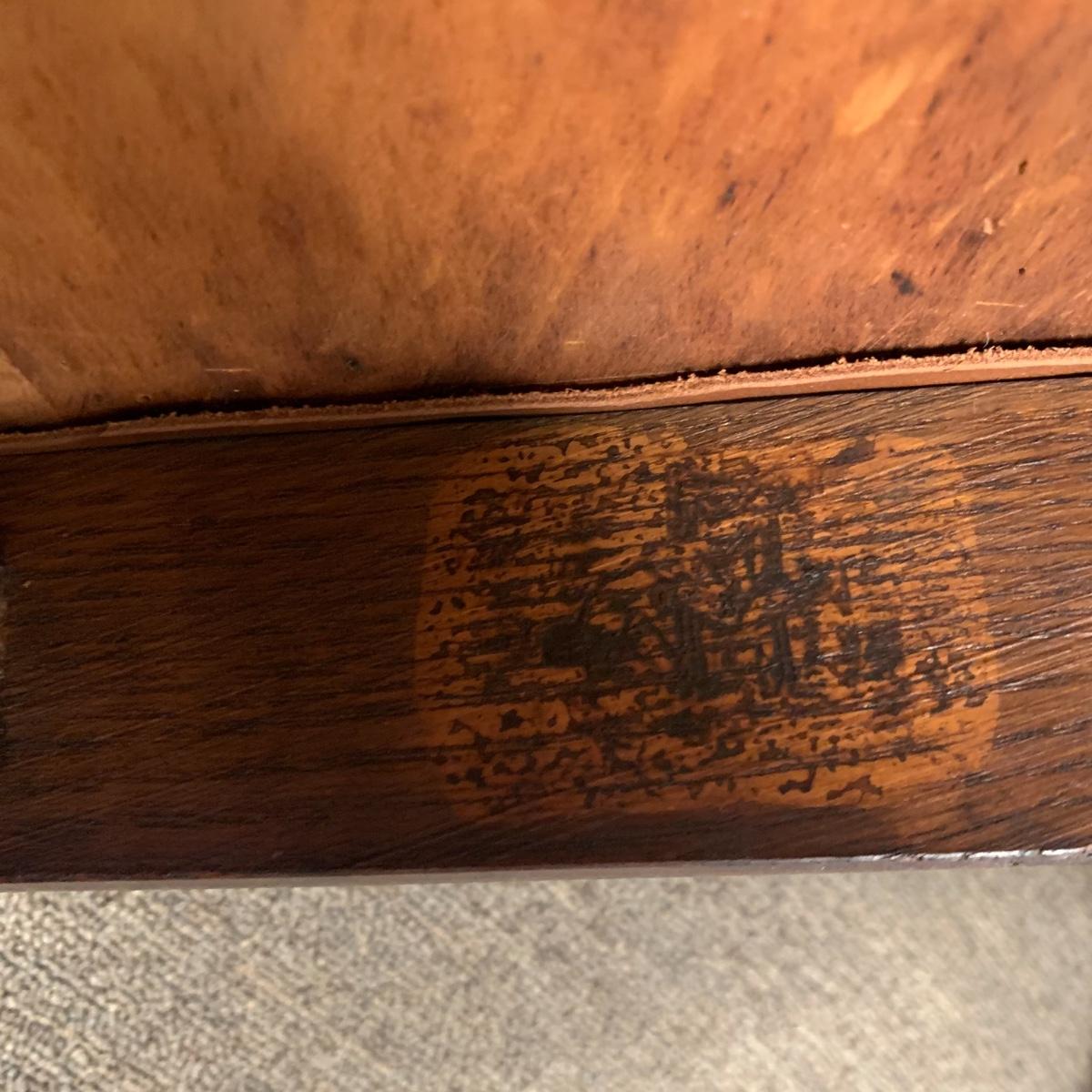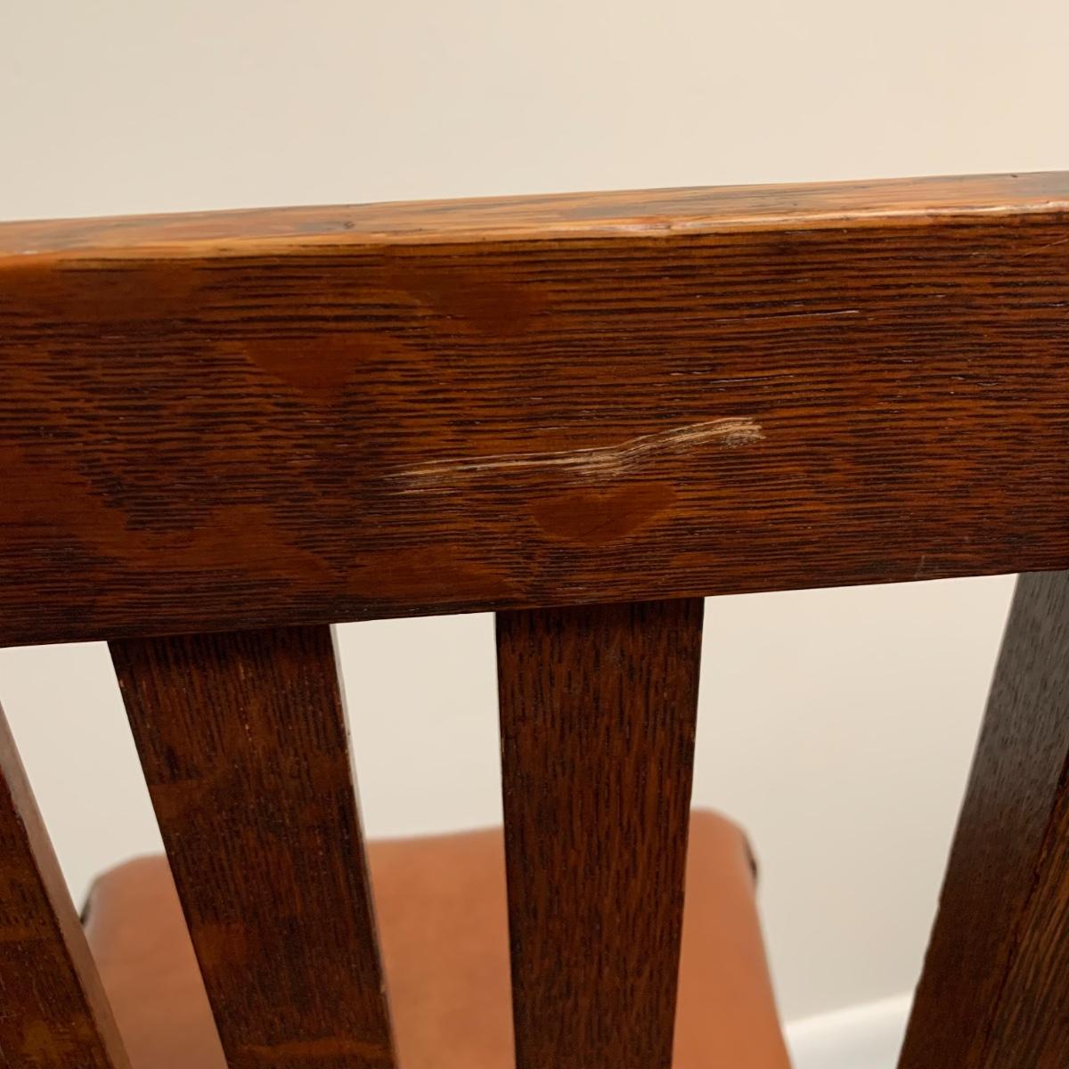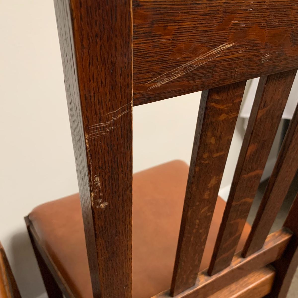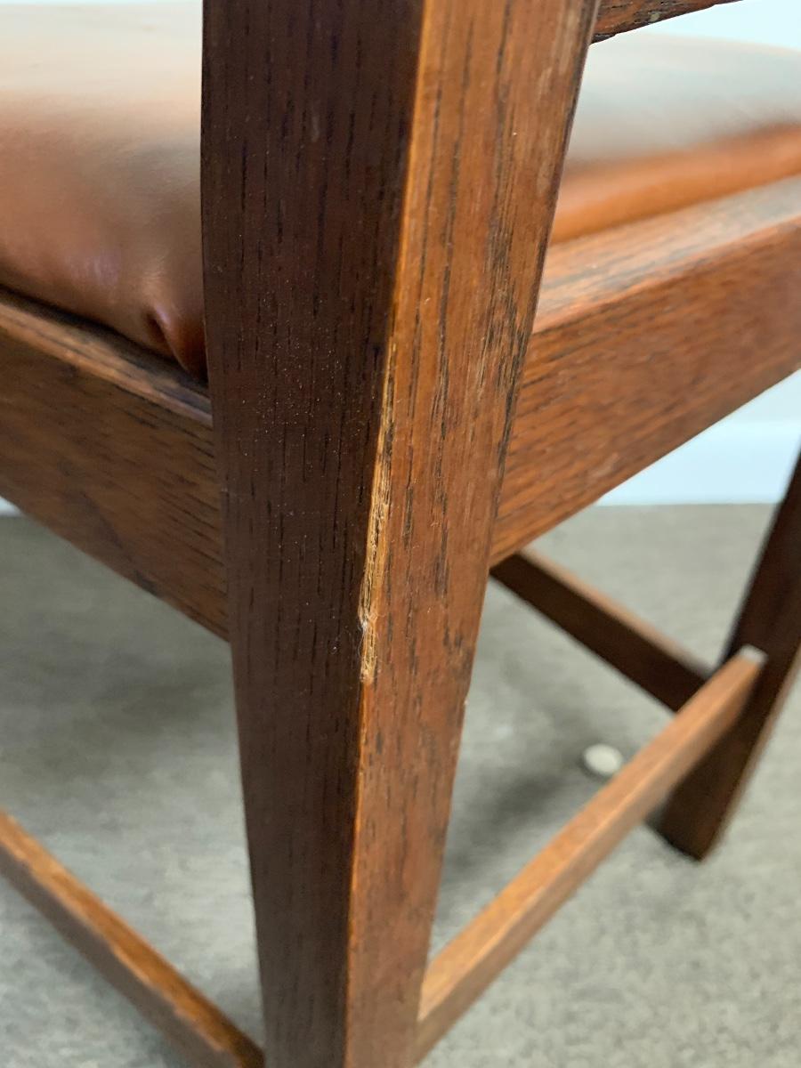 This lot includes a set of 4 mission style chairs. The chairs are made of a sturdy darker wood and have leather seat pads. There is a stamp on the inside of the bottom of the chair but unsure what the stamp says. Possible Charles P. Limbert chairs? Can’t verify. The chairs have some slight marks on the them (see photos). They measure about 16in x 14in x 37in. Shipping is not available through our UPS partners but you are welcome to coordinate your own shipping to be picked up during our pick up hours.