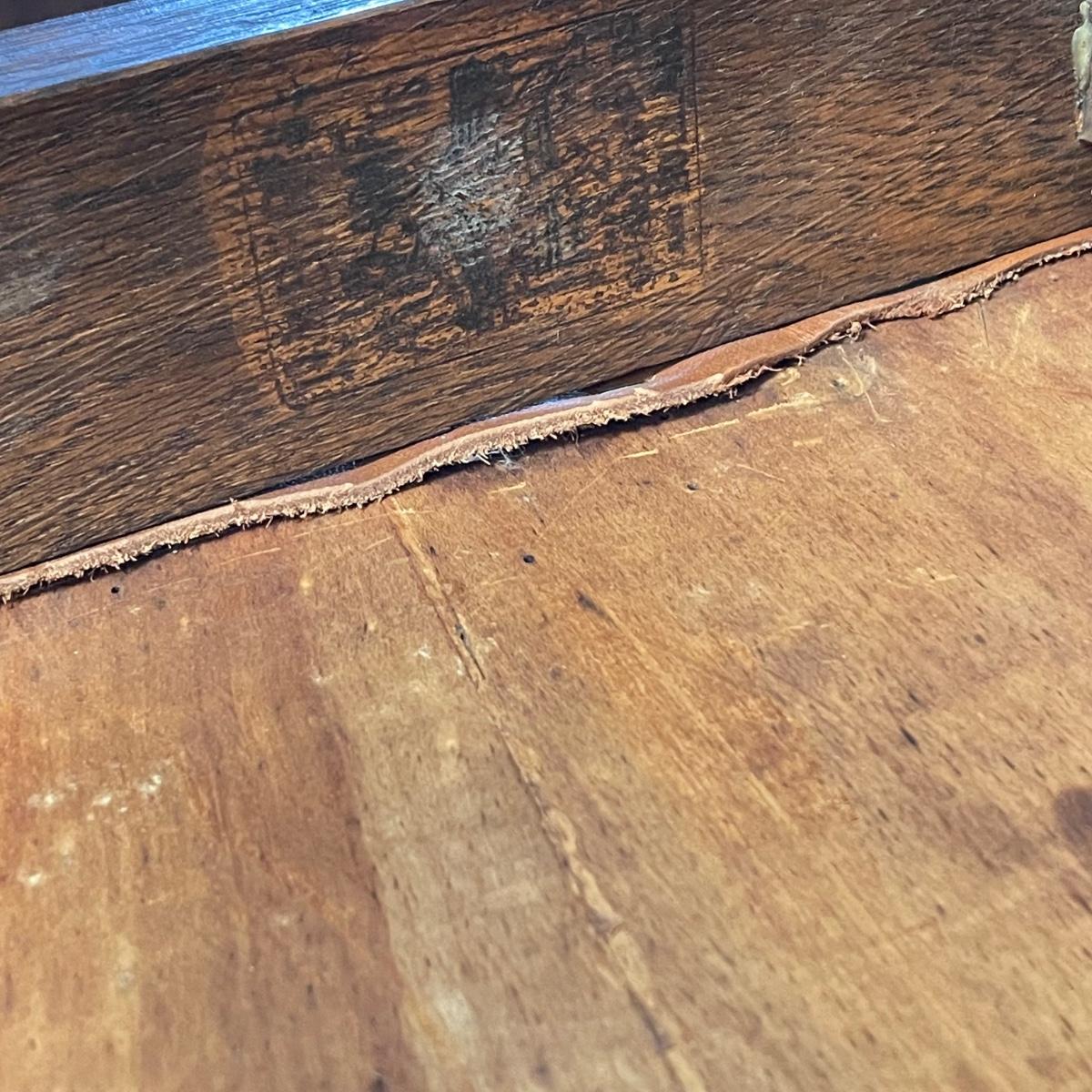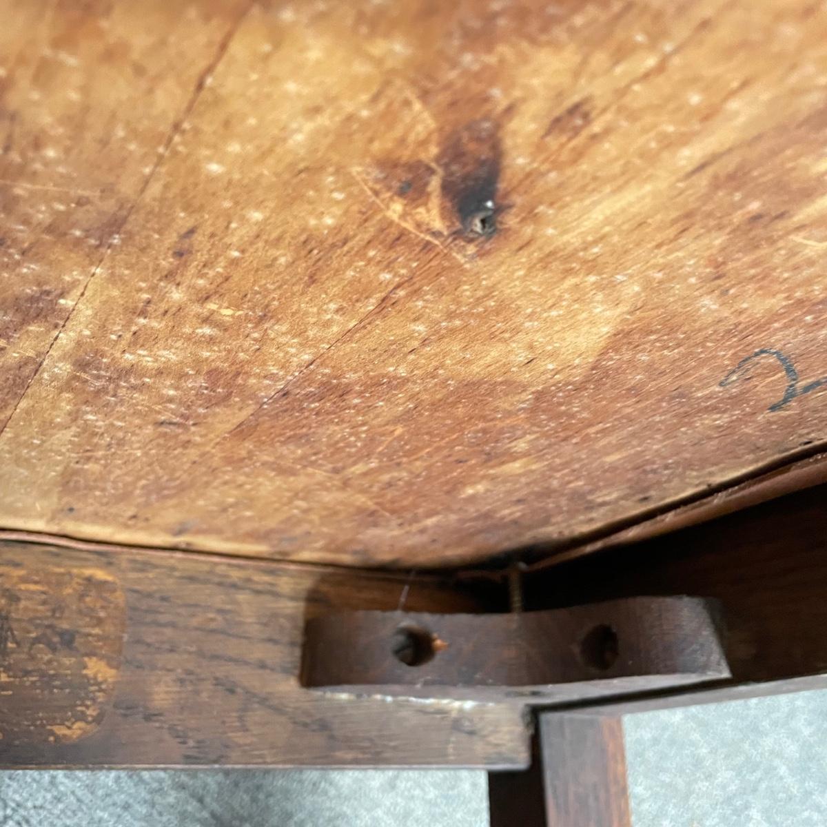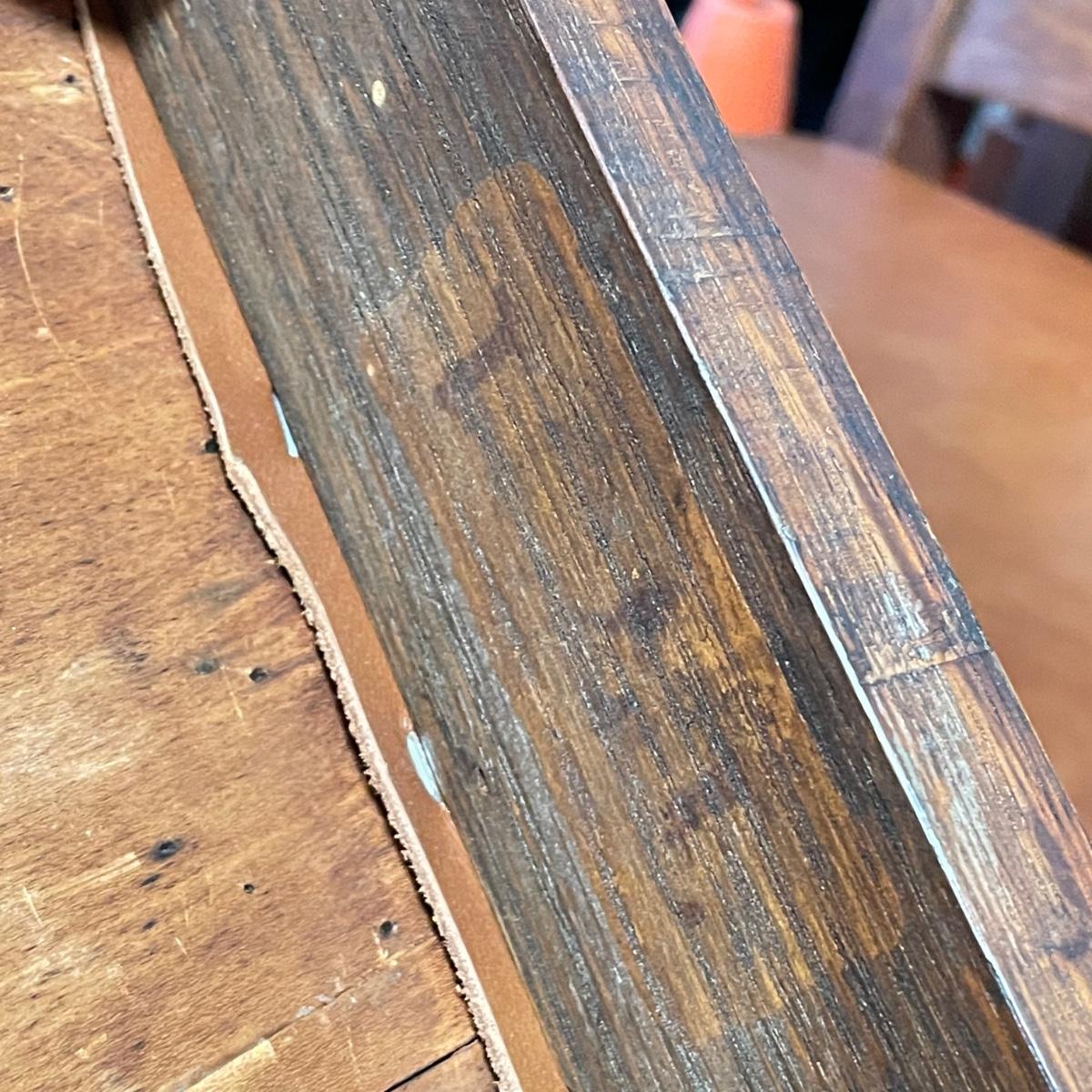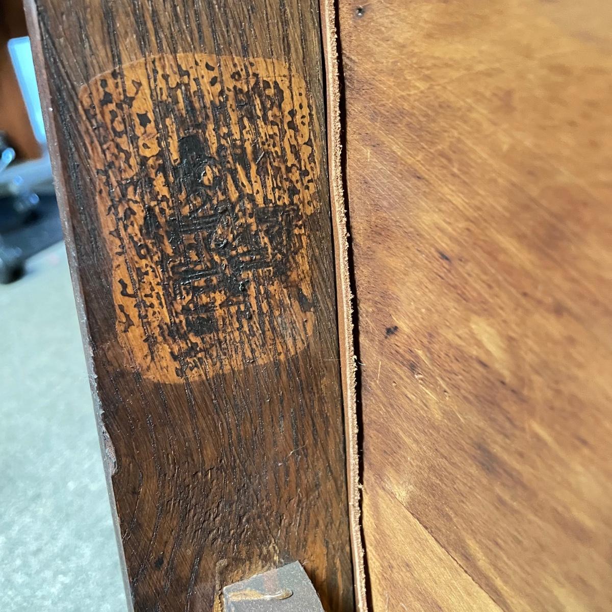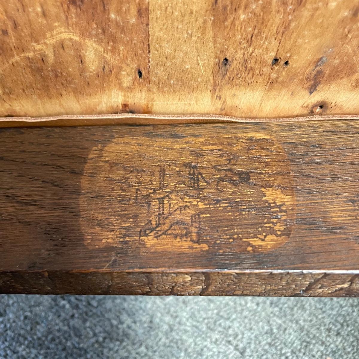 This lot includes a set of 4 mission style chairs. The chairs are made of a sturdy darker wood and have leather seat pads. There is a stamp on the inside of the bottom of the chair but unsure what the stamp says. Possible Charles P. Limbert chairs? Can’t verify. The chairs have some slight marks on the them (see photos). They measure about 16in x 14in x 37in. Shipping is not available through our UPS partners but you are welcome to coordinate your own shipping to be picked up during our pick up hours.