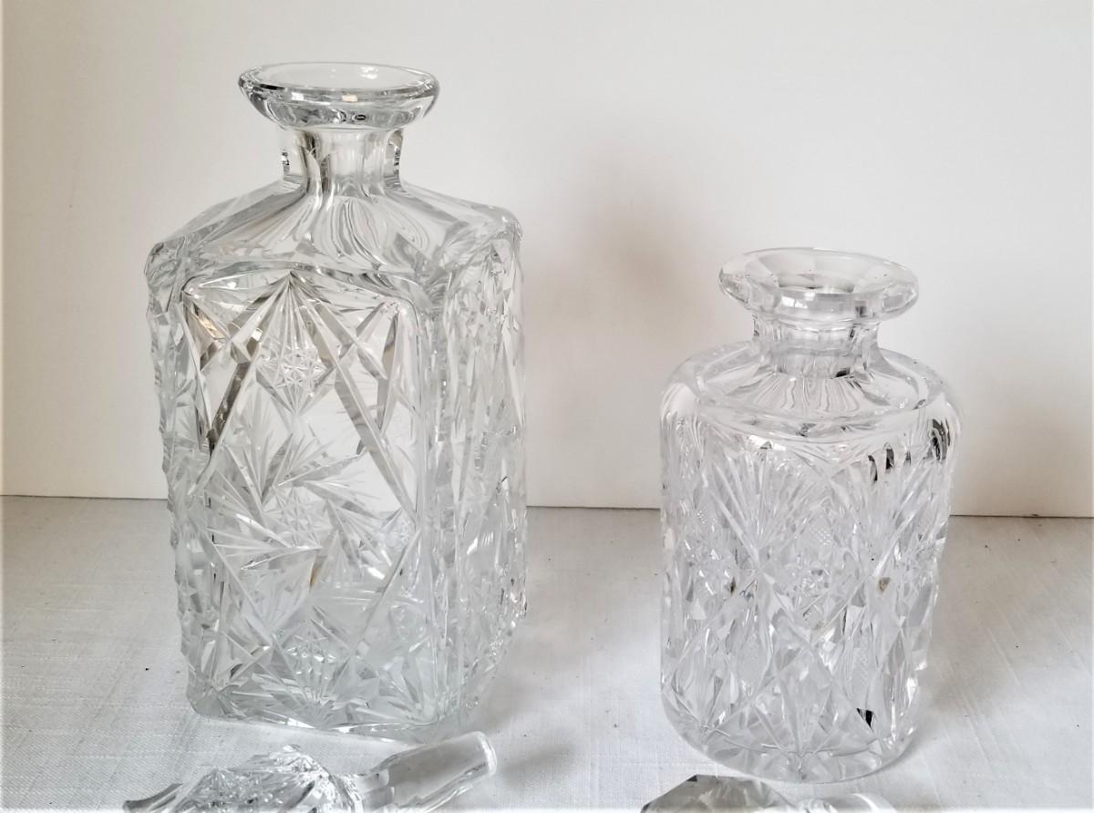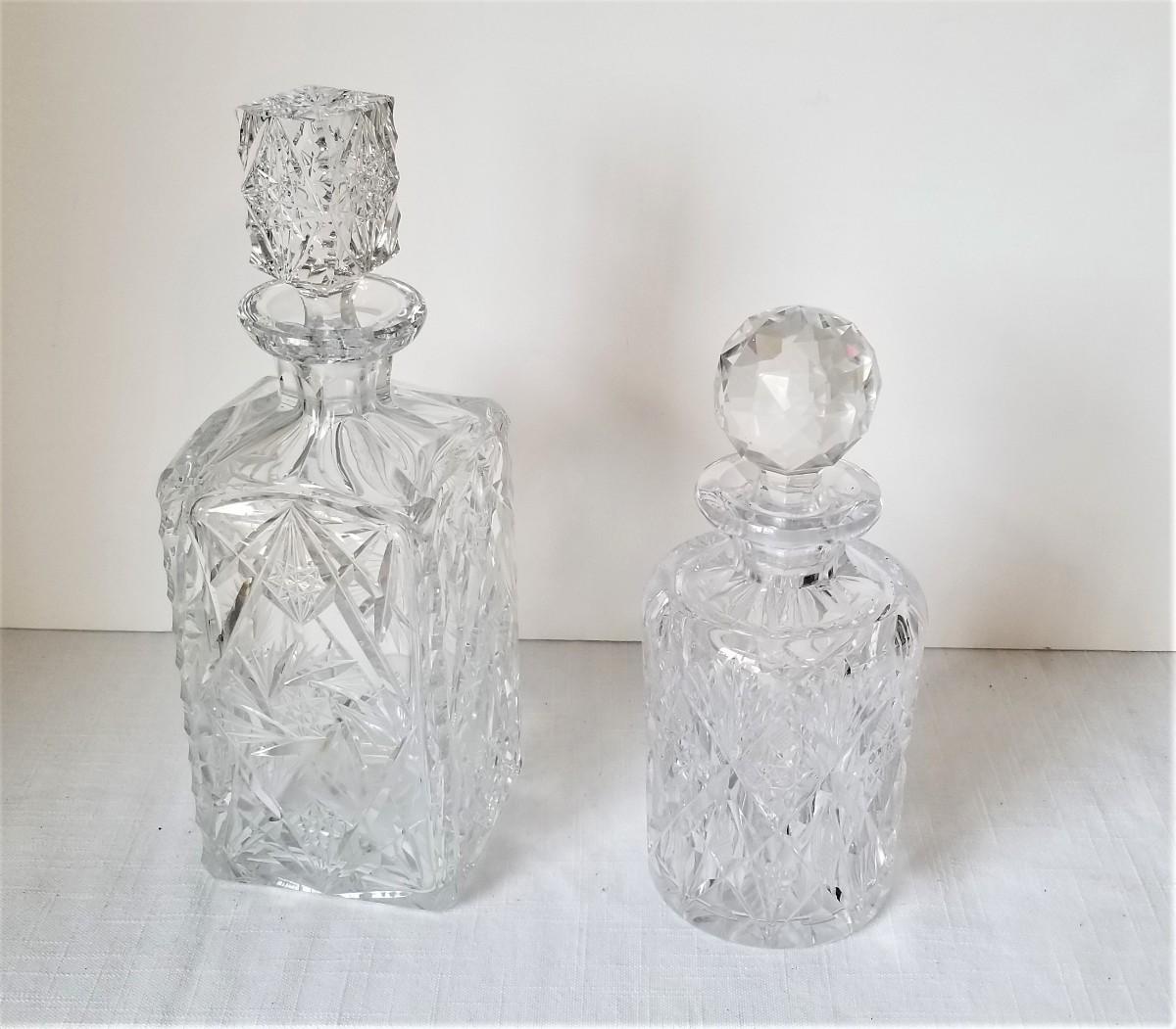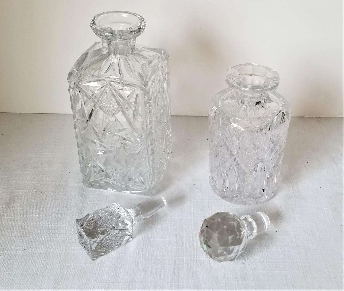 Two vintage lead crystal decanters - good antique condition. One 10.5" tall, the other 8" tall. Both have ground glass stoppers.
