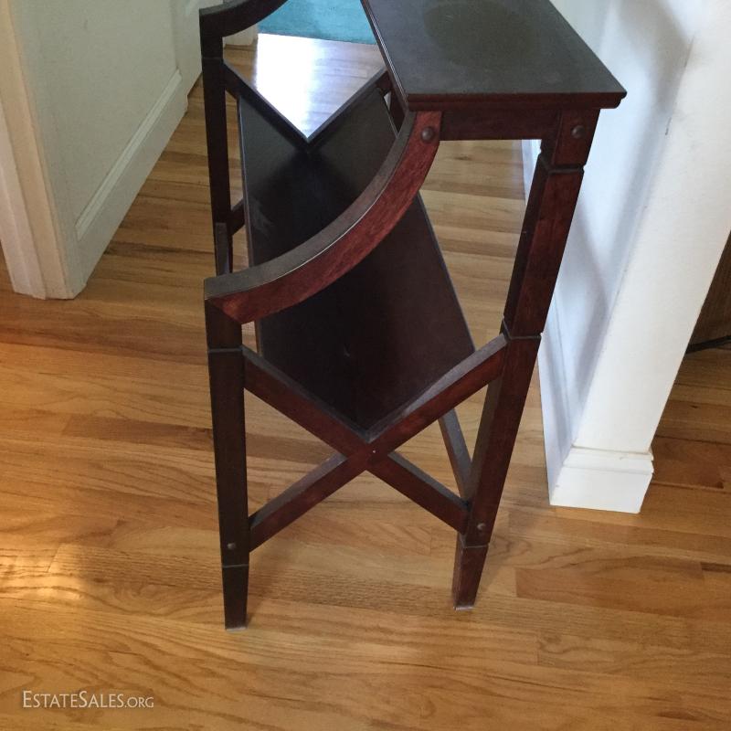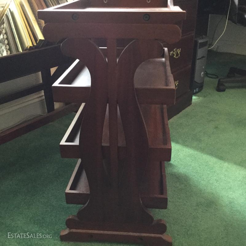 Slanted bookshelf 33" wide by 33 ½” tall by 15” deep at widest point.