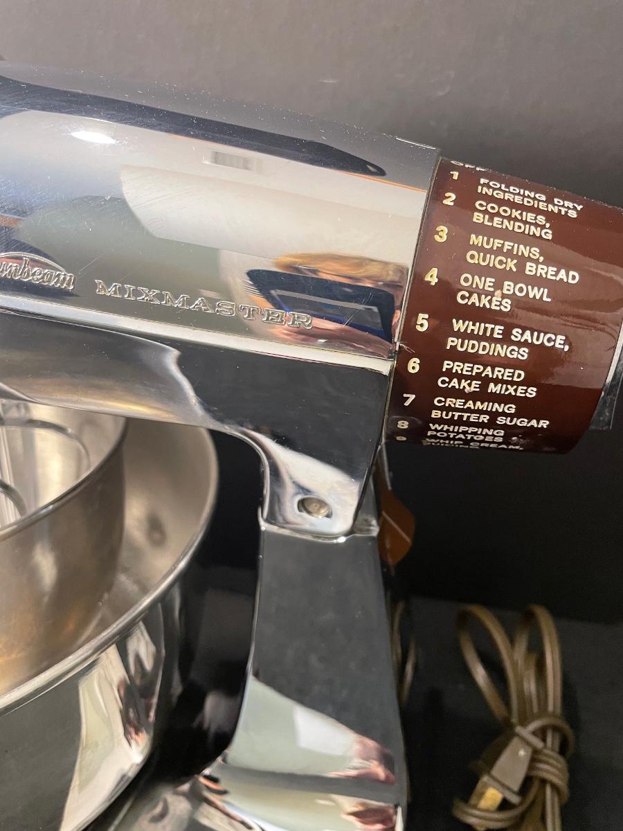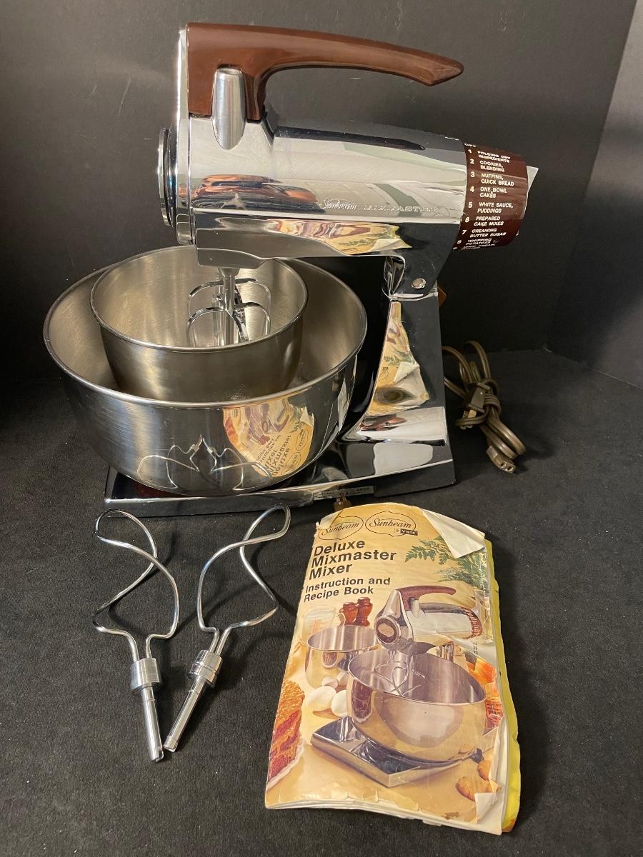 Sunbeam Deluxe Mixmaster mixer. Includes 2 stainless steel mixing bowls, bowl-fit beaters, dough hooks and instruction manual.