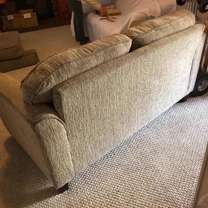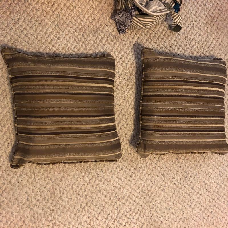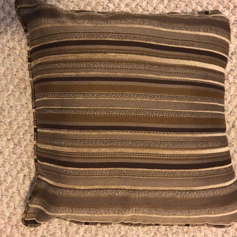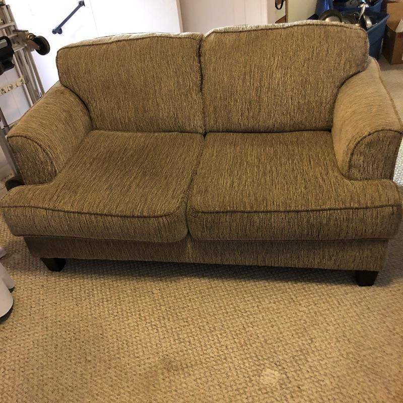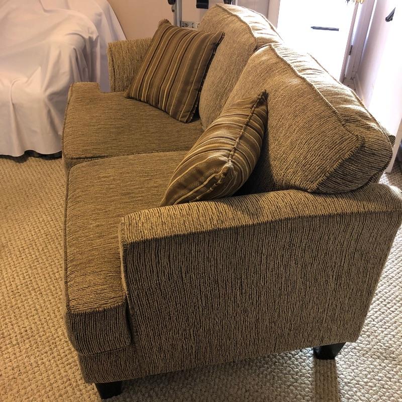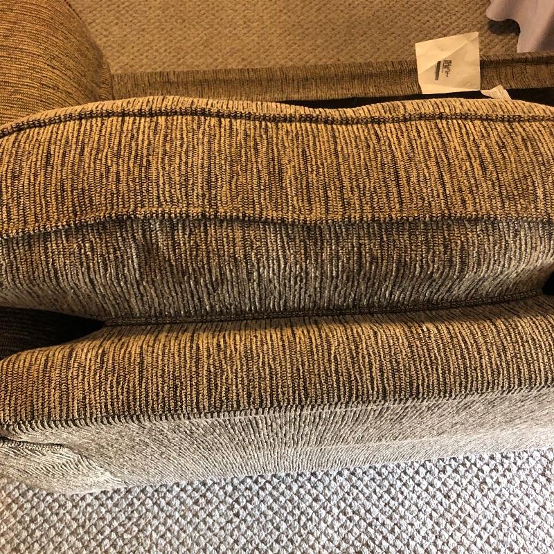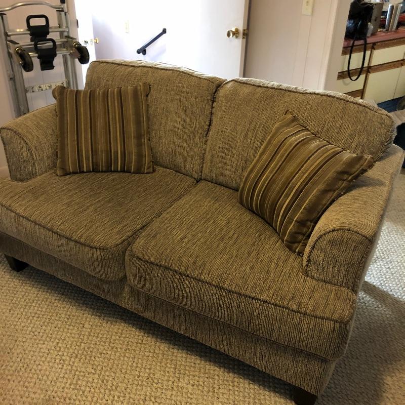 Extremely comfortable and soft, this loveseat is a mixture of brown and tan colors in a super soft fabric with two striped accent pillows. This handsome sofa will look good in any space!