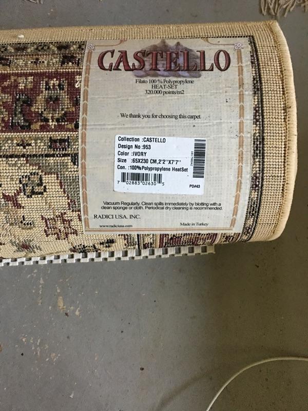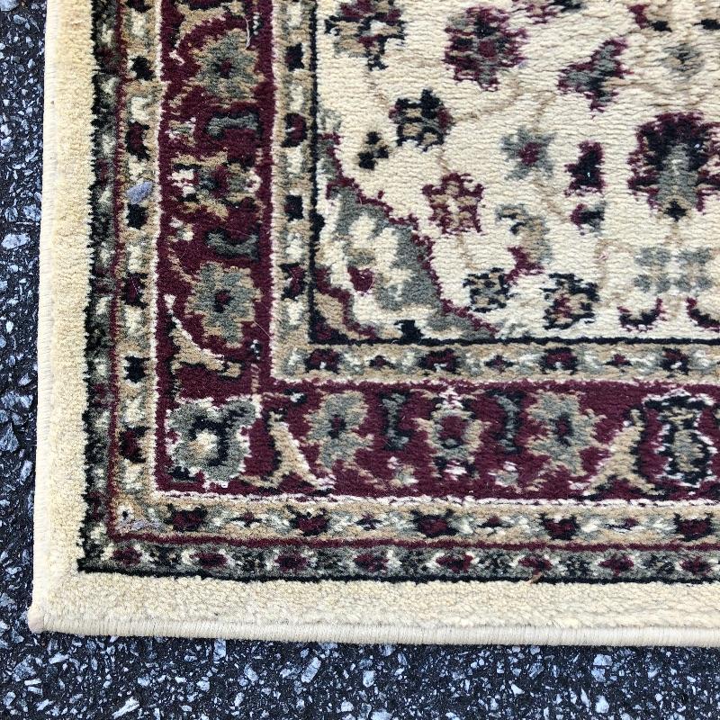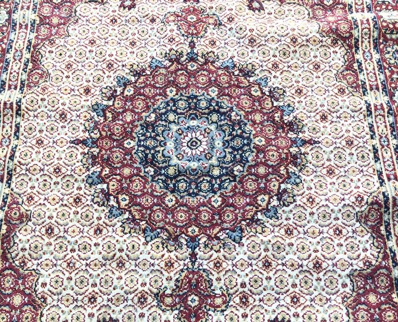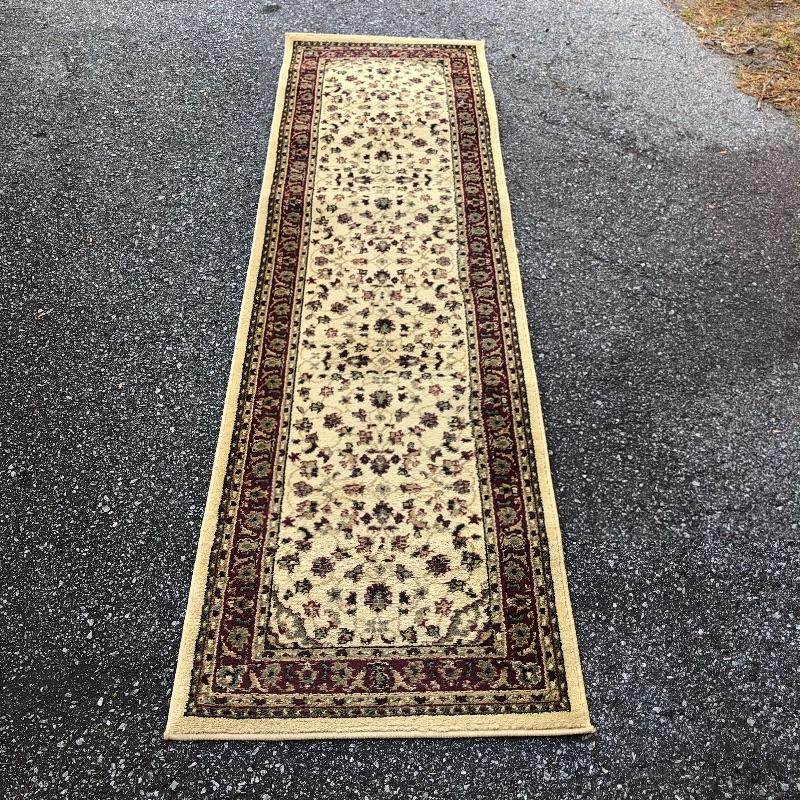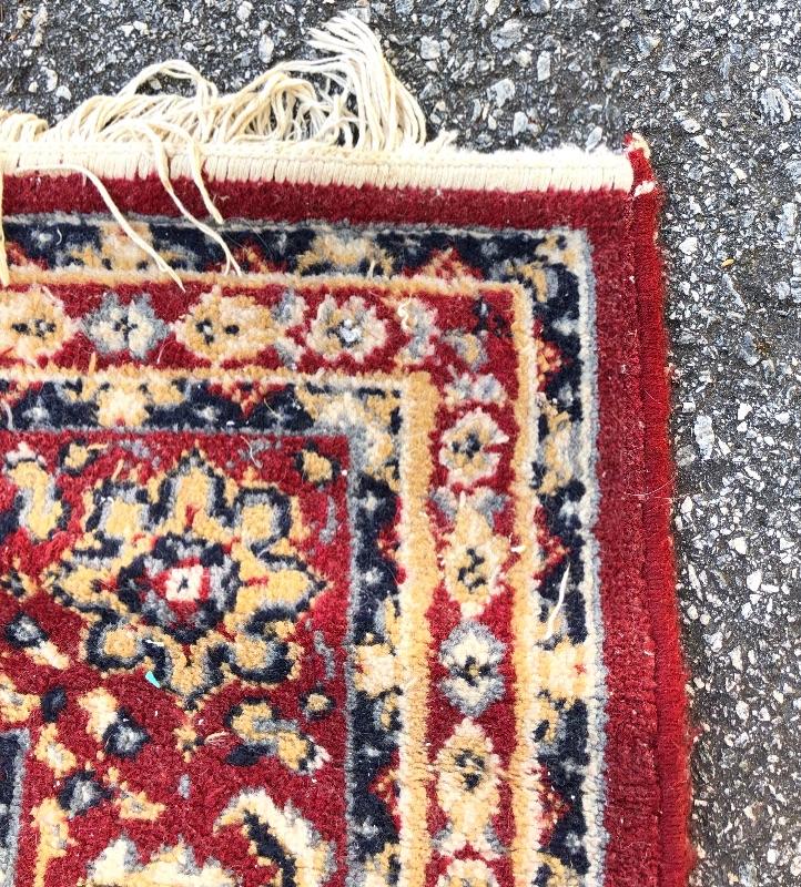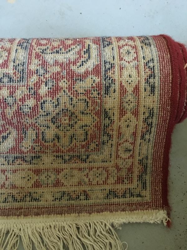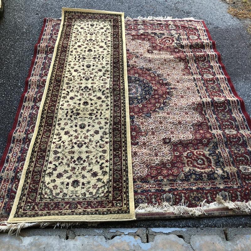 Two nice woven rugs. The larger of the two measures 66” x 88” and has an attractive dark red background. It does have some pieces of fringe missing, see images. The runner rug comes with a no-slip backing cut to size.