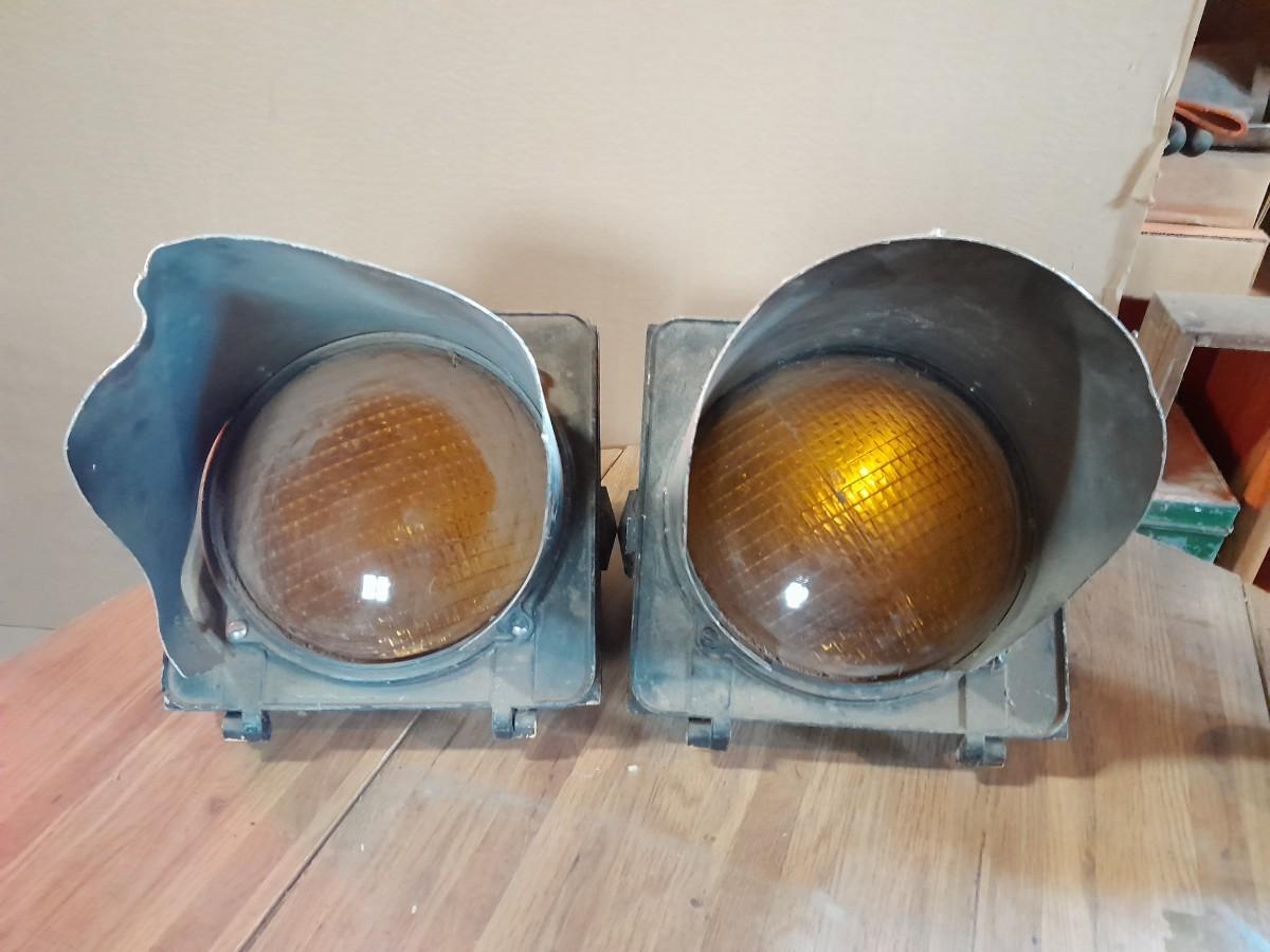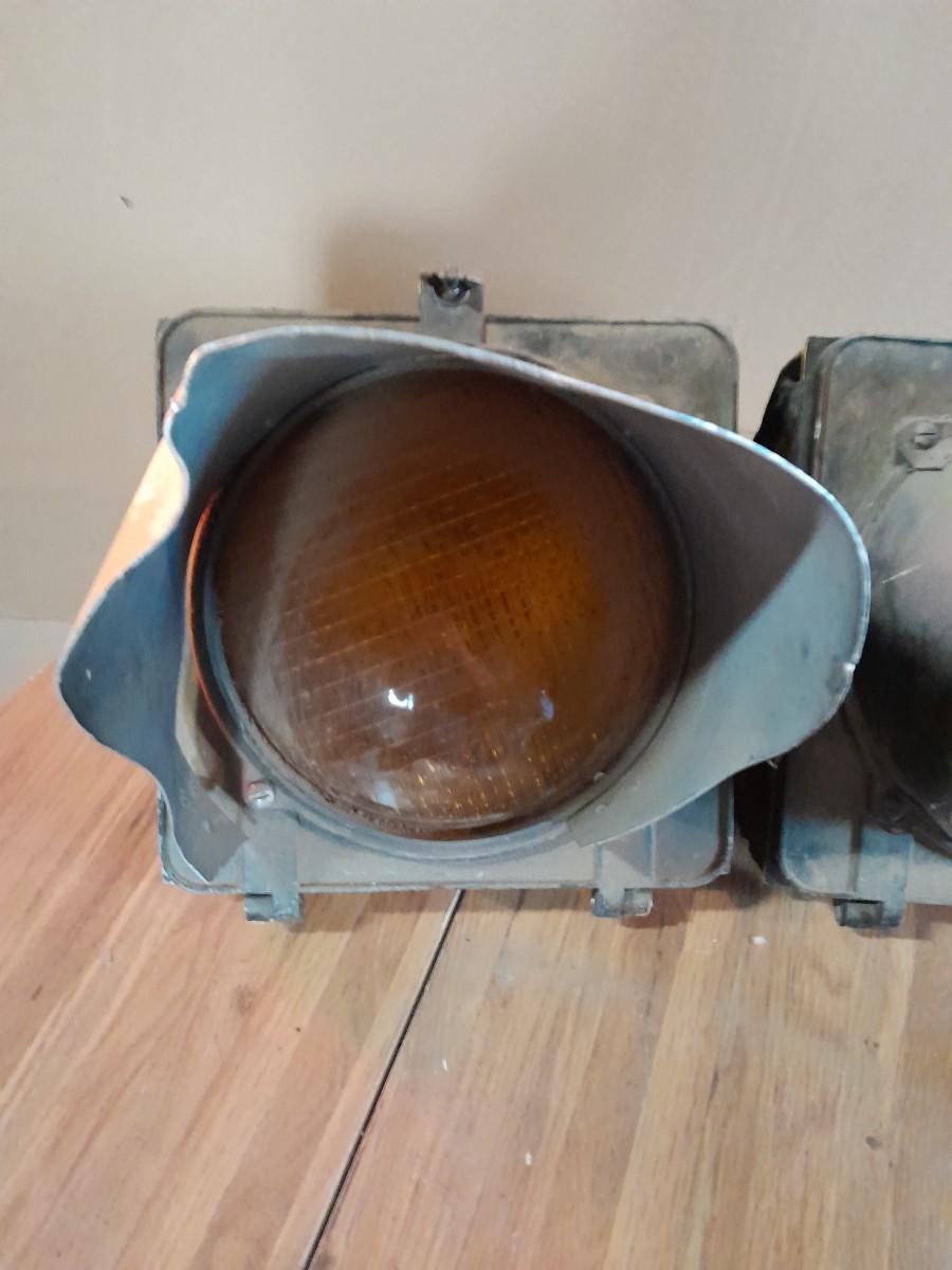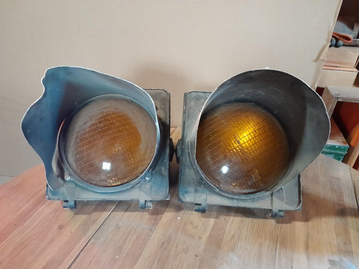 TWO YELLOW STOP LIGHT LIGHTS, THESE ARE NON-FUNCTIONING, ELECTRIC STOP LIGHT YELLOW LIGHTS FOR DISPLAY OR REPAIR. (One has a bent shield)