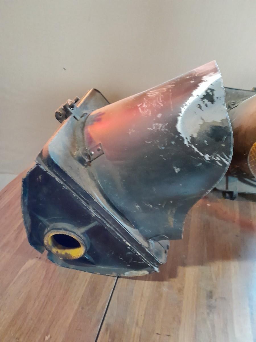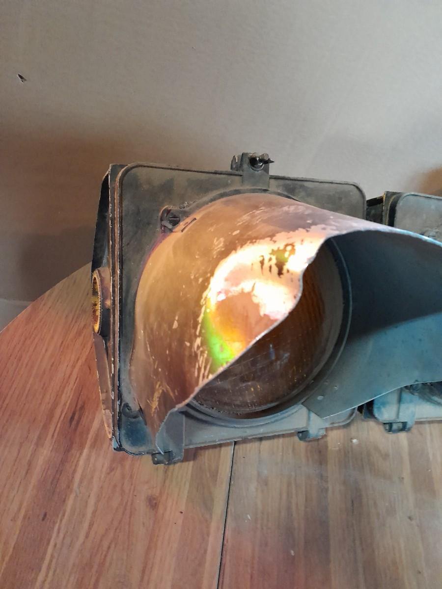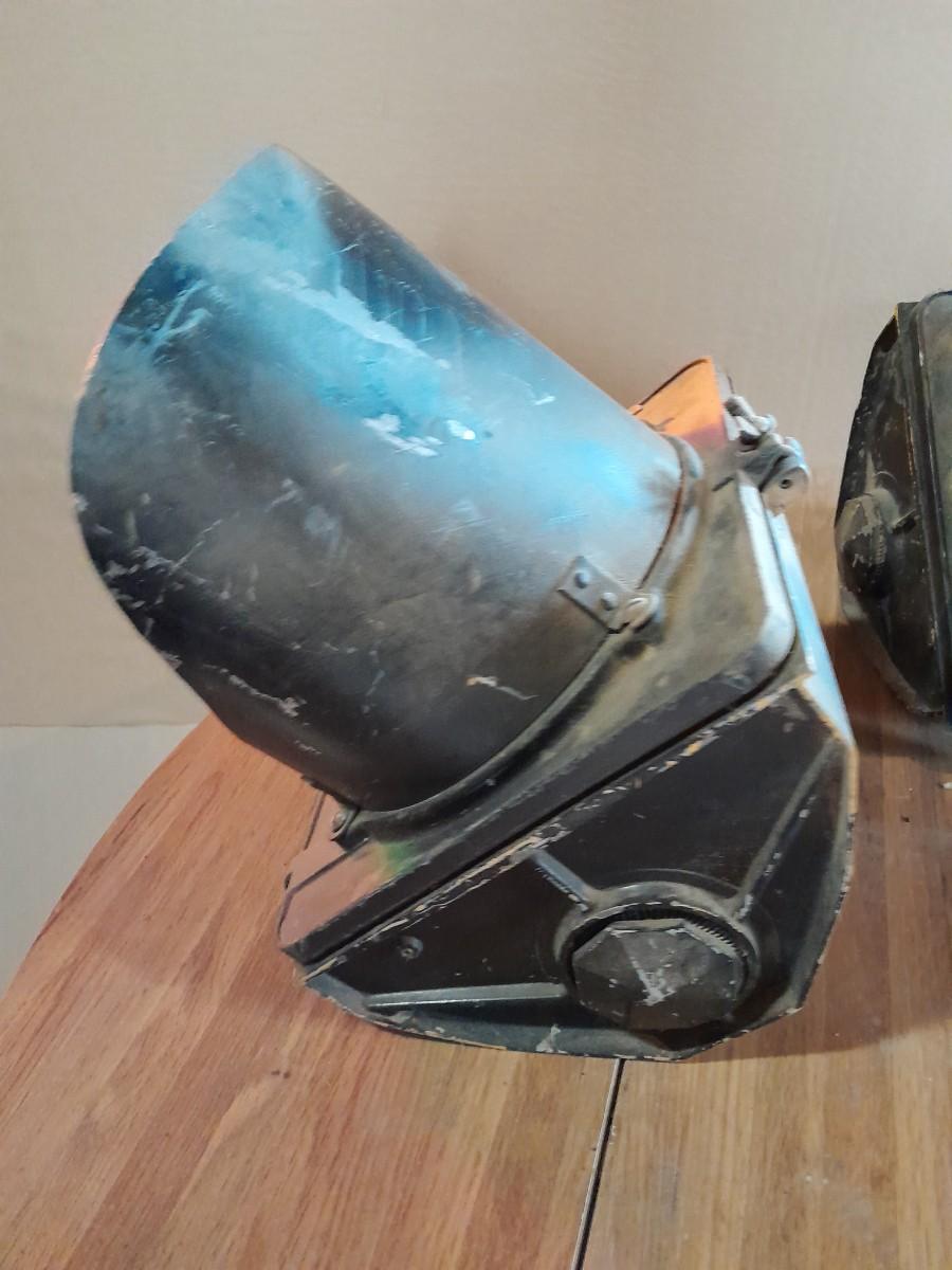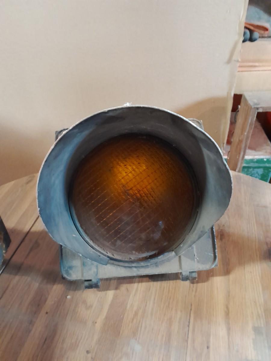 TWO YELLOW STOP LIGHT LIGHTS, THESE ARE NON-FUNCTIONING, ELECTRIC STOP LIGHT YELLOW LIGHTS FOR DISPLAY OR REPAIR. (One has a bent shield)