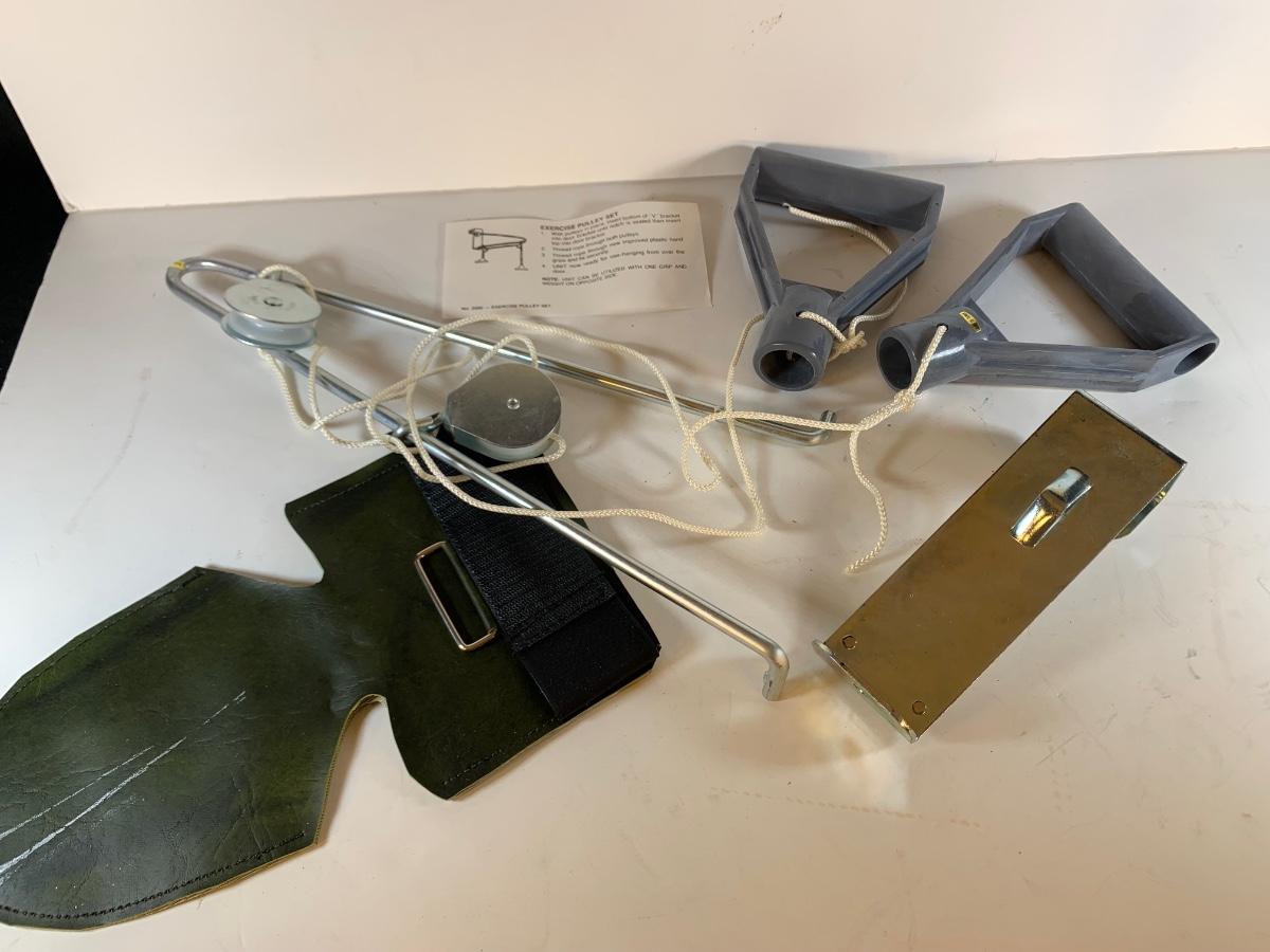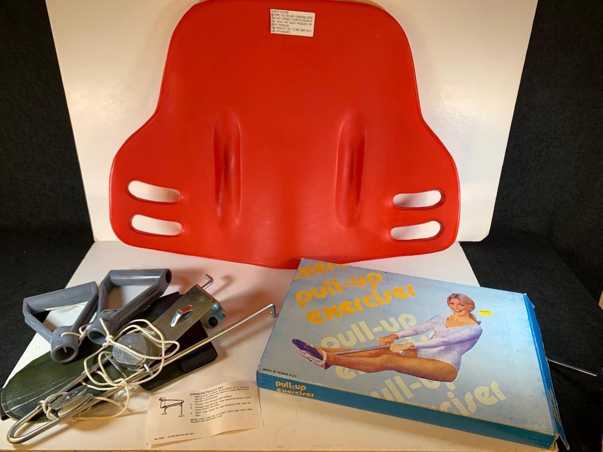 Lot includes vintage Pull-Up Exerciser in box, Sit-up Board and Exercise Pulley Set