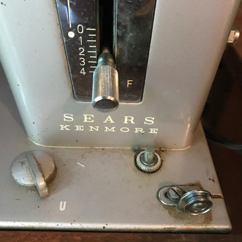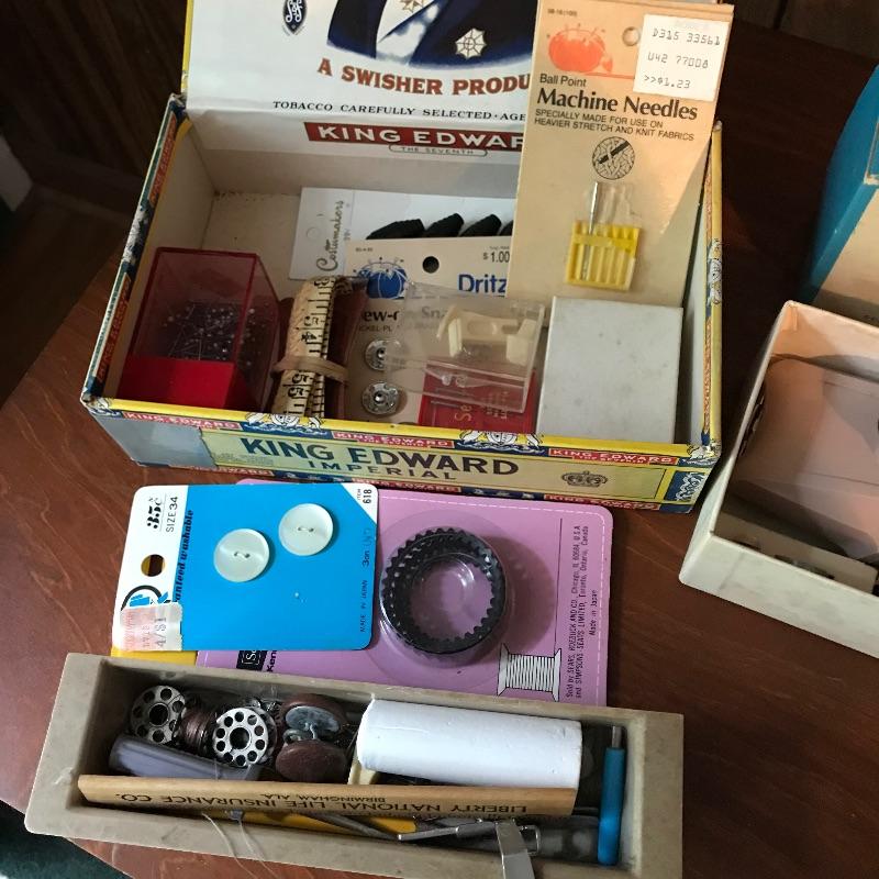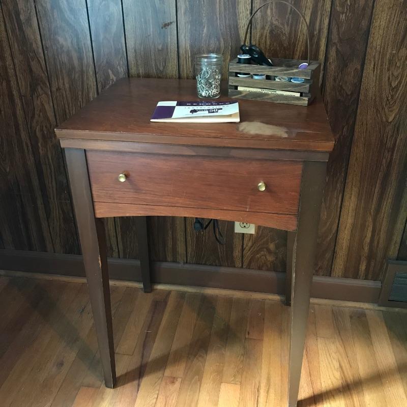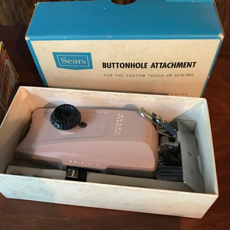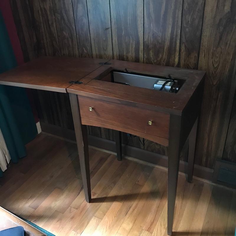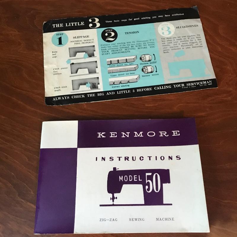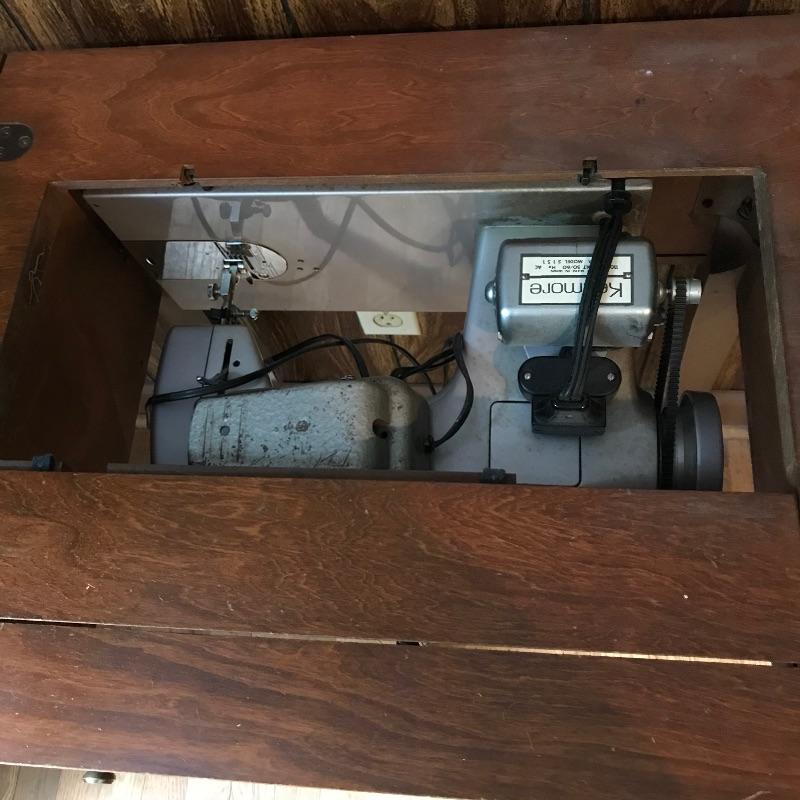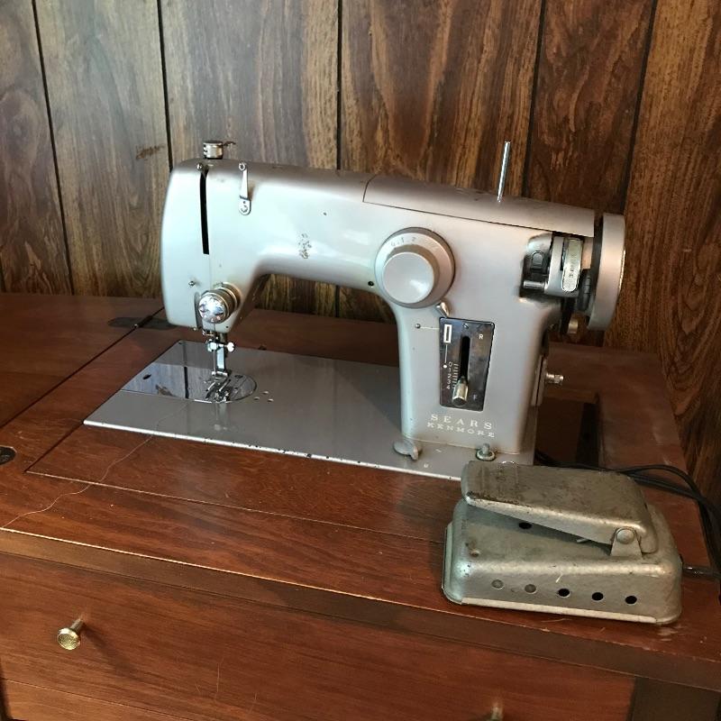 Kenmore sewing machines model 50 attached to a wooden sewing table with accessories. Sewing machine worked when tested and comes with original instructions. Table measures approximately 21.75” x 17.5” x 31” and has a decent sized blemish on the top. See images. Accessories included with machine include Sears Buttonhole attachment, travel sewing kit, bobbins and thread including two small wooden bobbins. See images for all items you get if you win this sweet machine! Local pick up only. Please bring help to load, table is heavy.