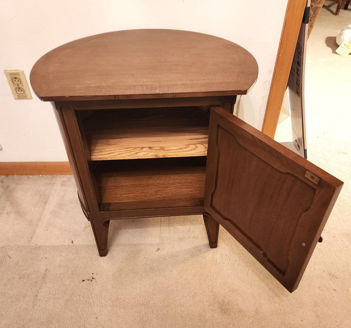 Vintage MCM Demilune Nightstand or Lamp table - 2 shelves inside, finished all the way around. 23" across at widest point, 19" deep, 25" tall. Good vintage condition.