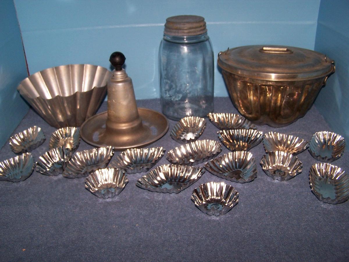 LOT 108 WONDERFUL OLD KITCHEN STUFF--EGG TIMER/MOLDS/JAR
