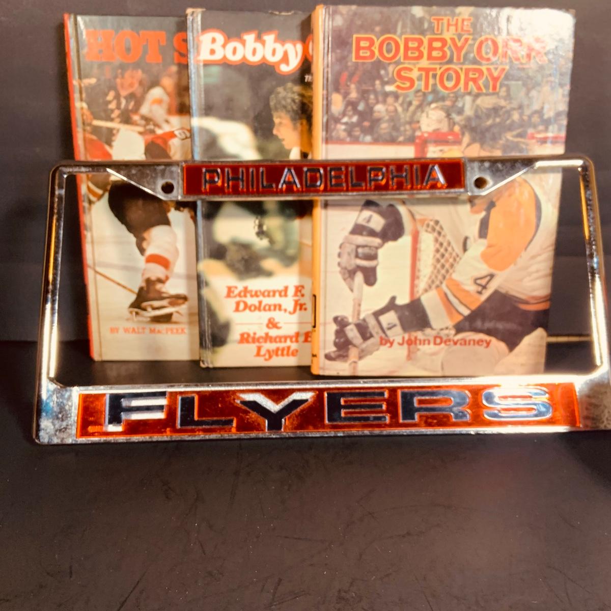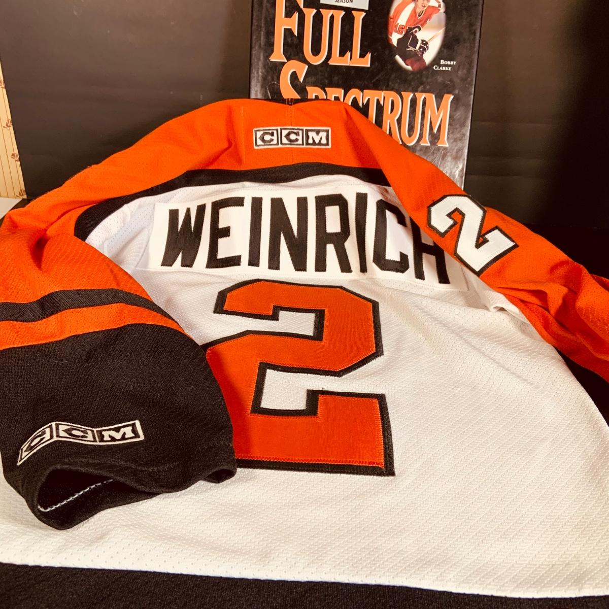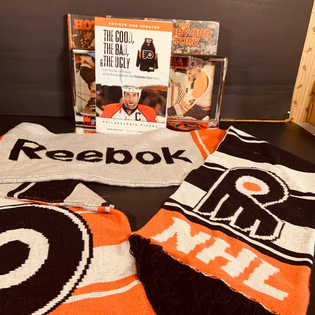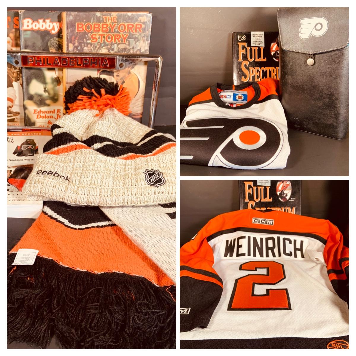 LOT::28: Philadelphia Flyers Collection Including a Child's Size Small #2 Weinrich Jersey, Reebok Scarf and Tosssel Cap, Assortment of Books and License Plate Holder and Leather Bag