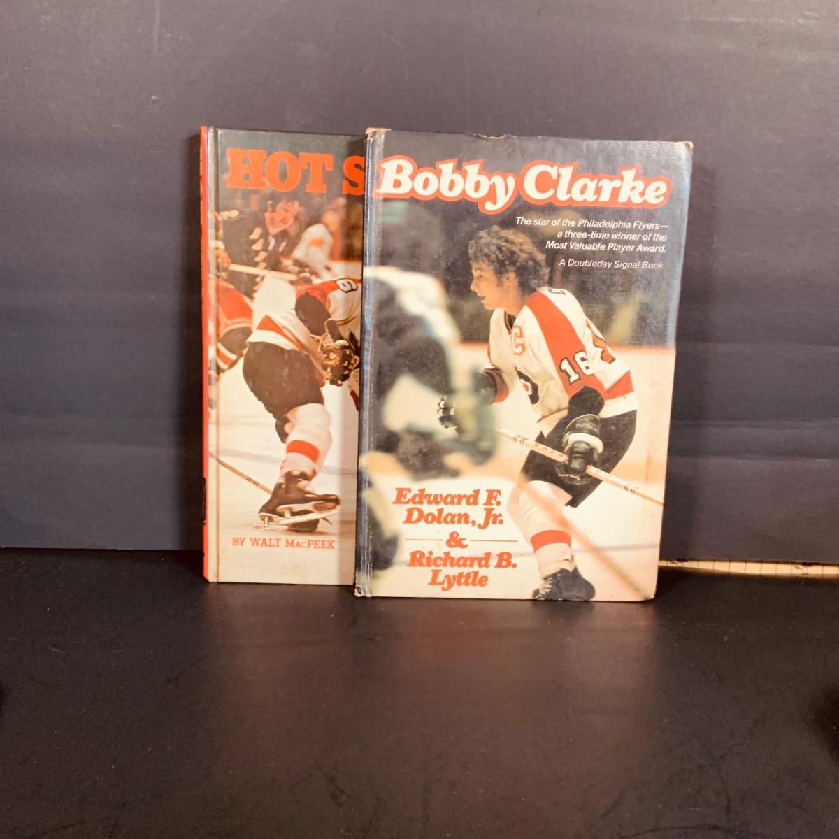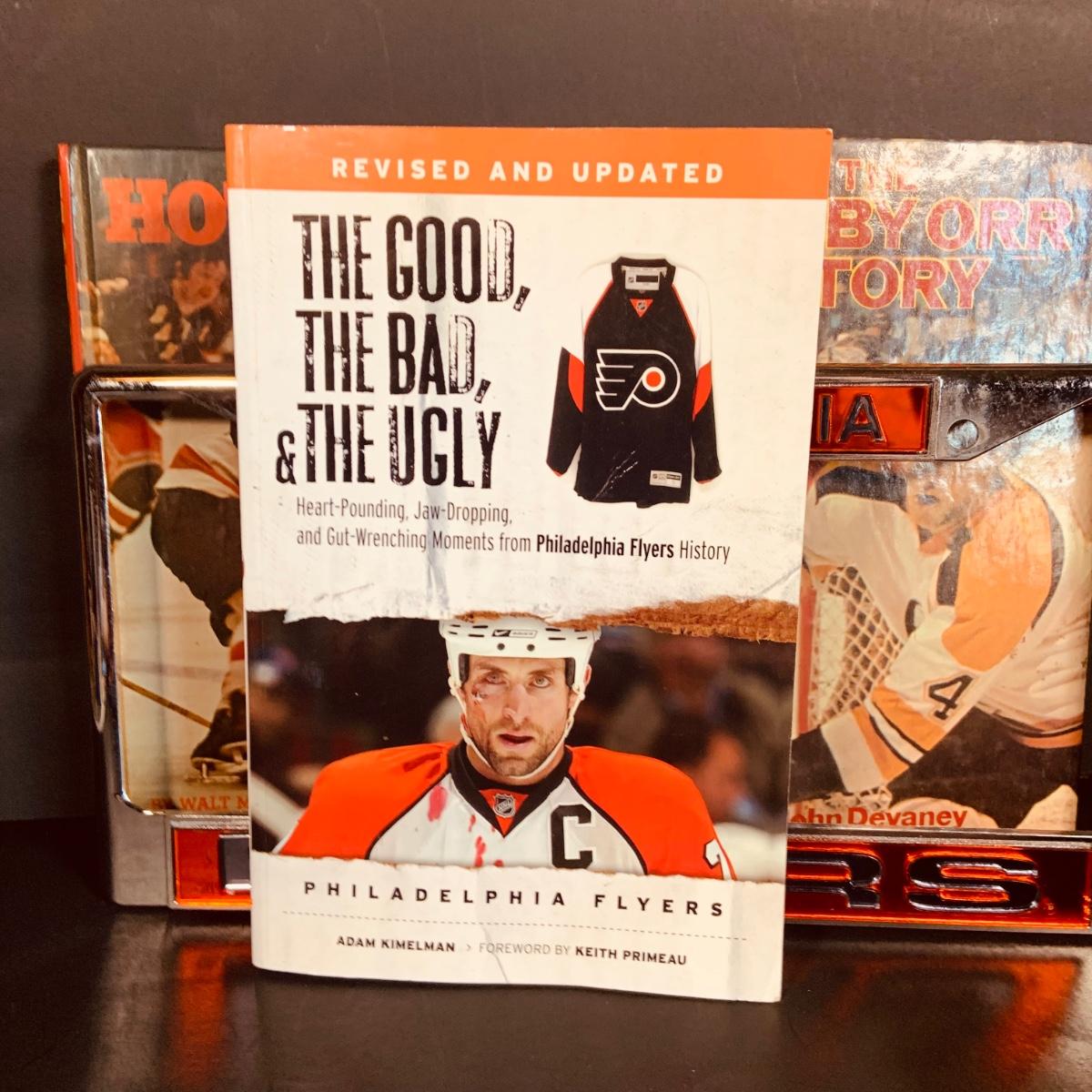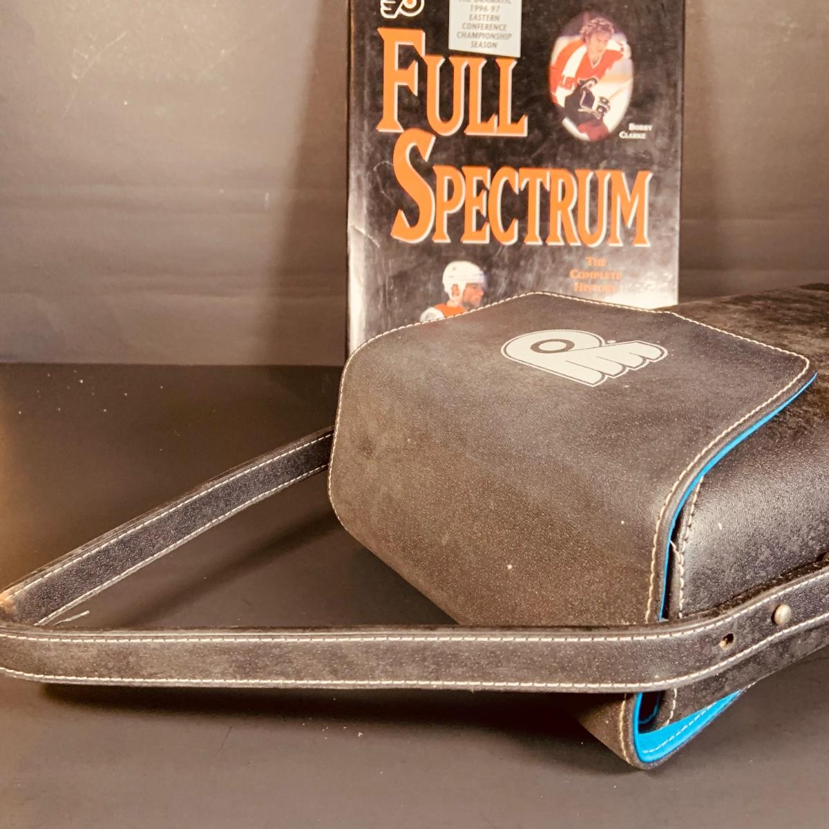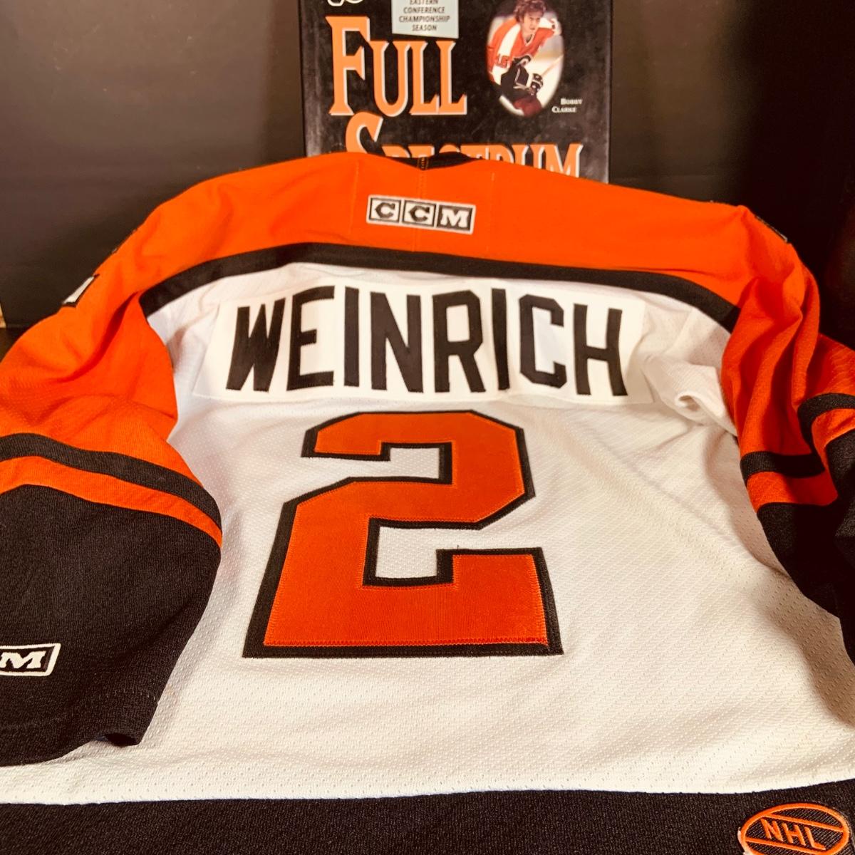 LOT::28: Philadelphia Flyers Collection Including a Child's Size Small #2 Weinrich Jersey, Reebok Scarf and Tosssel Cap, Assortment of Books and License Plate Holder and Leather Bag