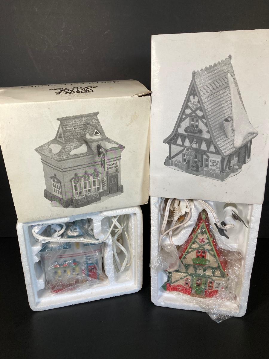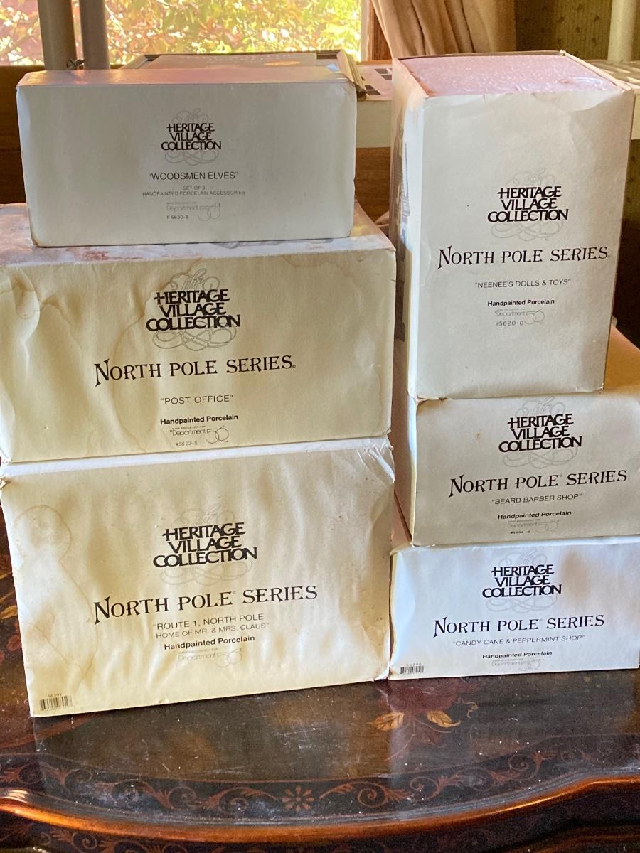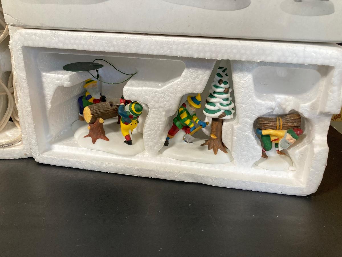 LOT 94: Dept. 56 - Woodsmen Elves, Post Office, Rt 1 North Pole Home of Mr and Mrs Claus, Neenee's Dolls & Toys, Beard Barber Shop and Candy Cane & Peppermint Shop
