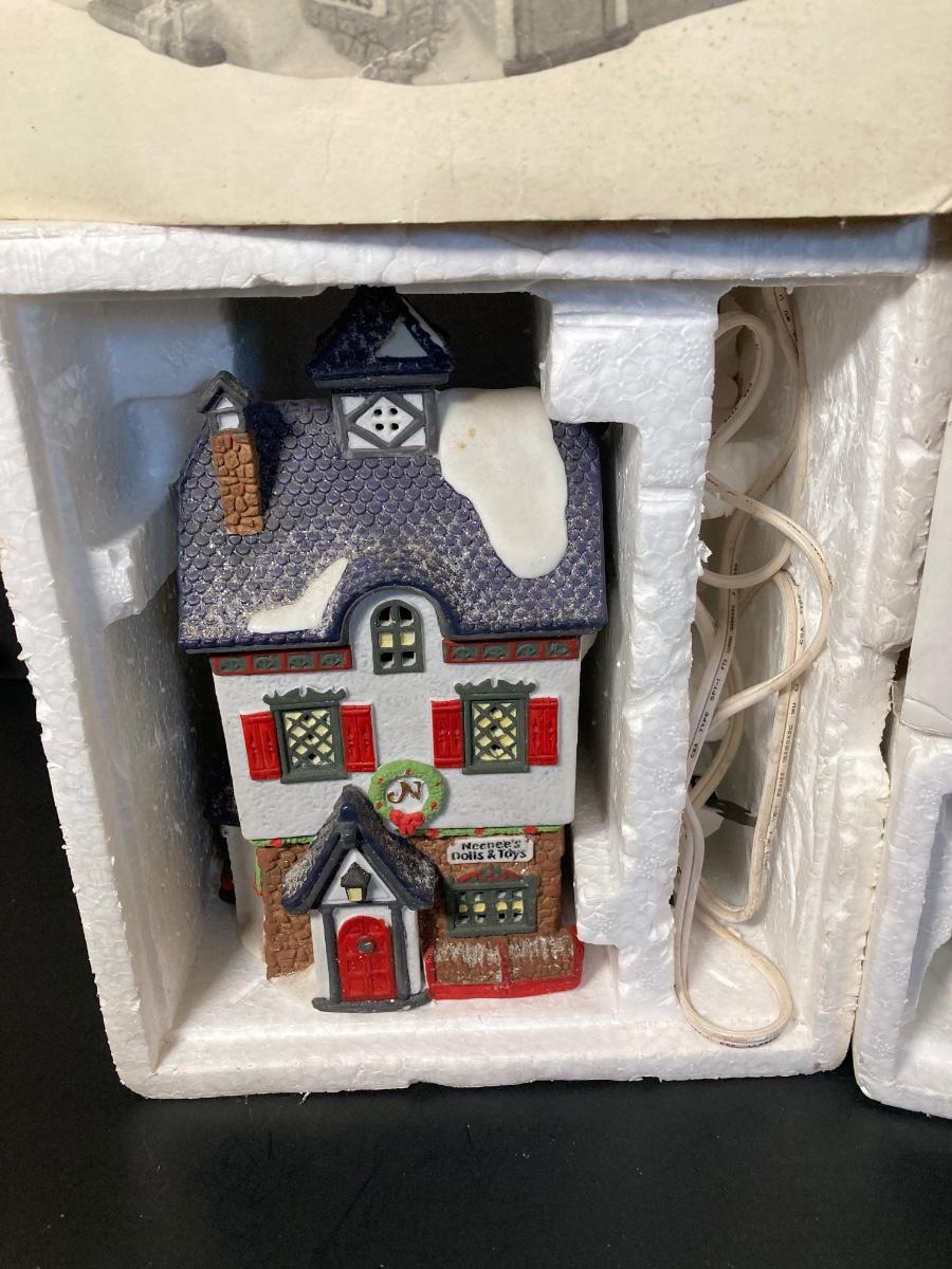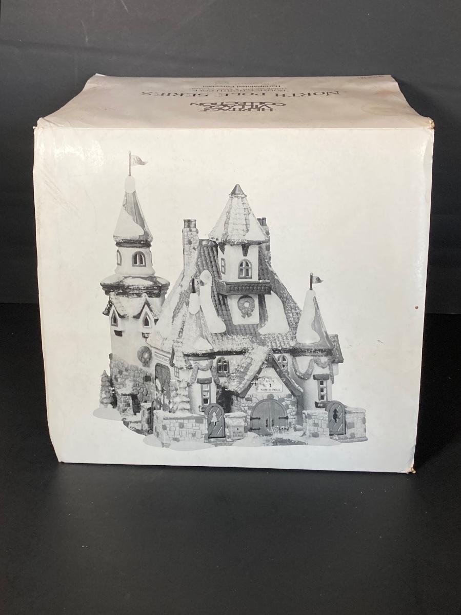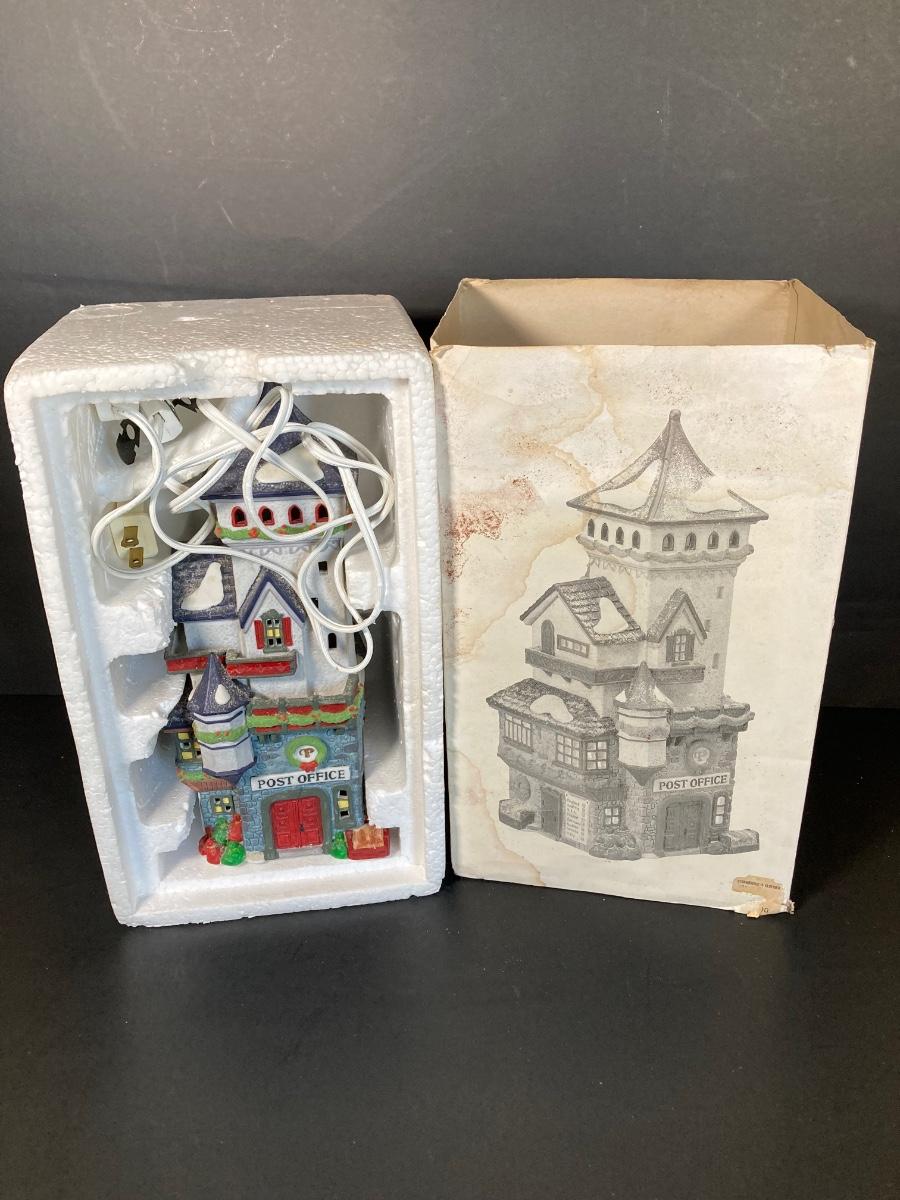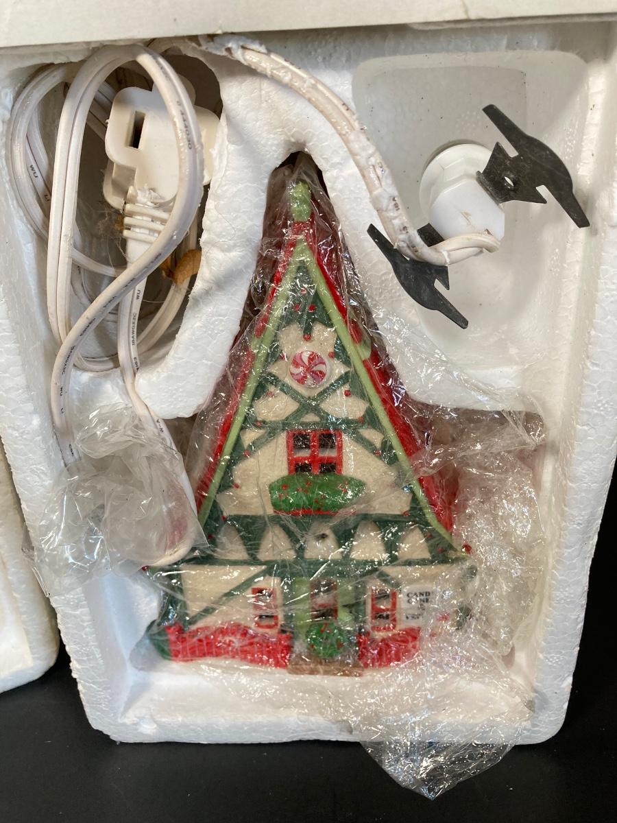 LOT 94: Dept. 56 - Woodsmen Elves, Post Office, Rt 1 North Pole Home of Mr and Mrs Claus, Neenee's Dolls & Toys, Beard Barber Shop and Candy Cane & Peppermint Shop