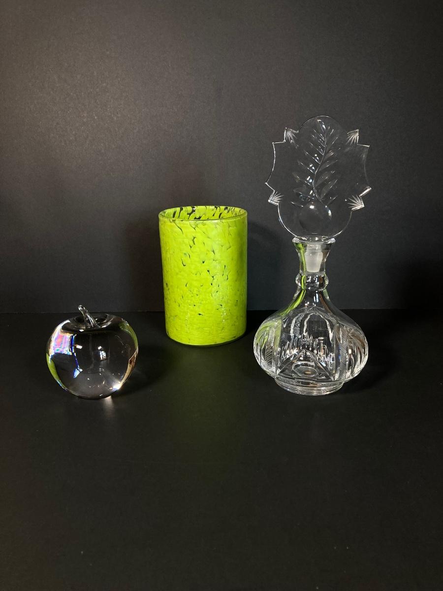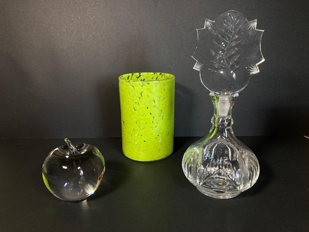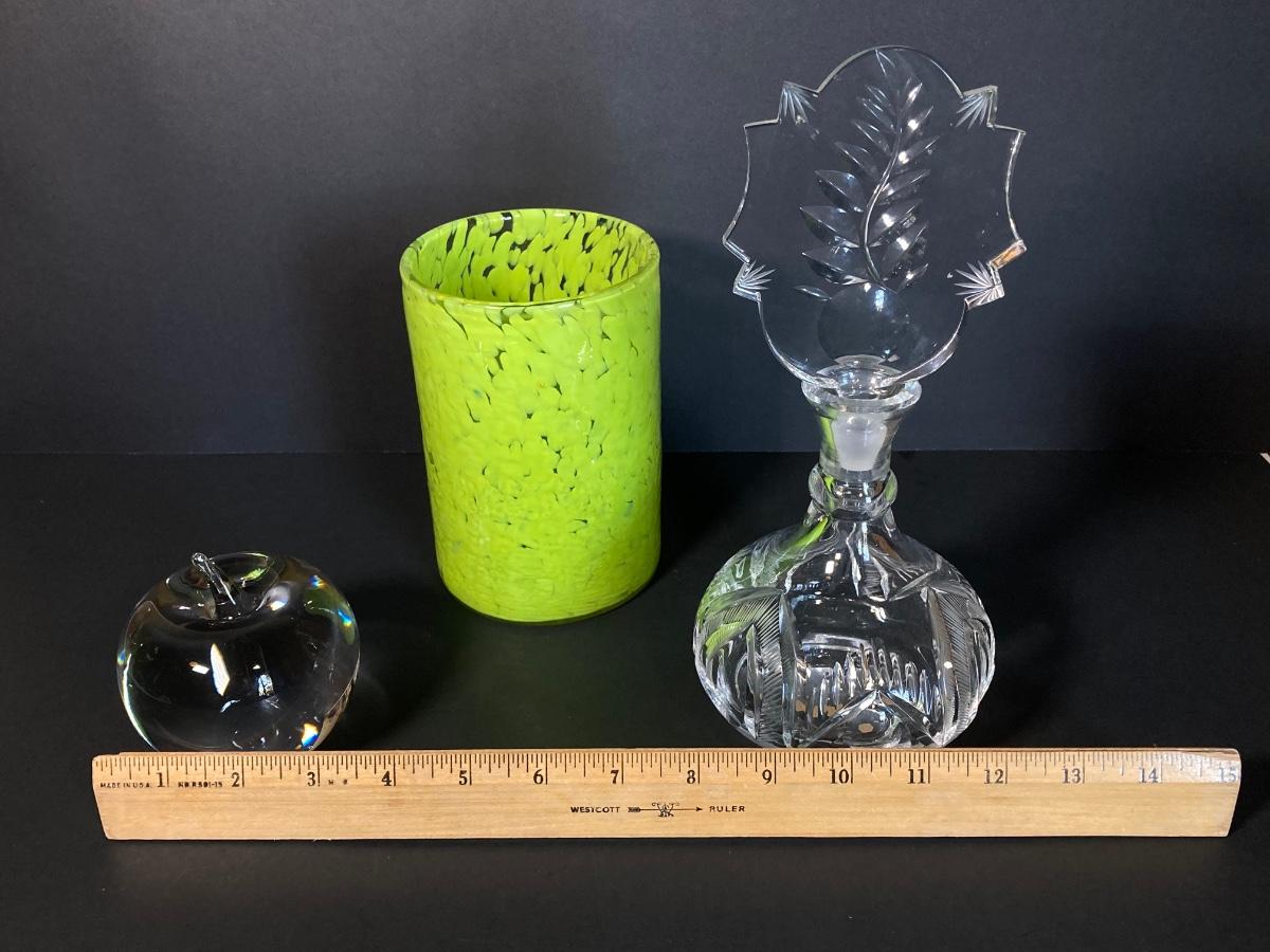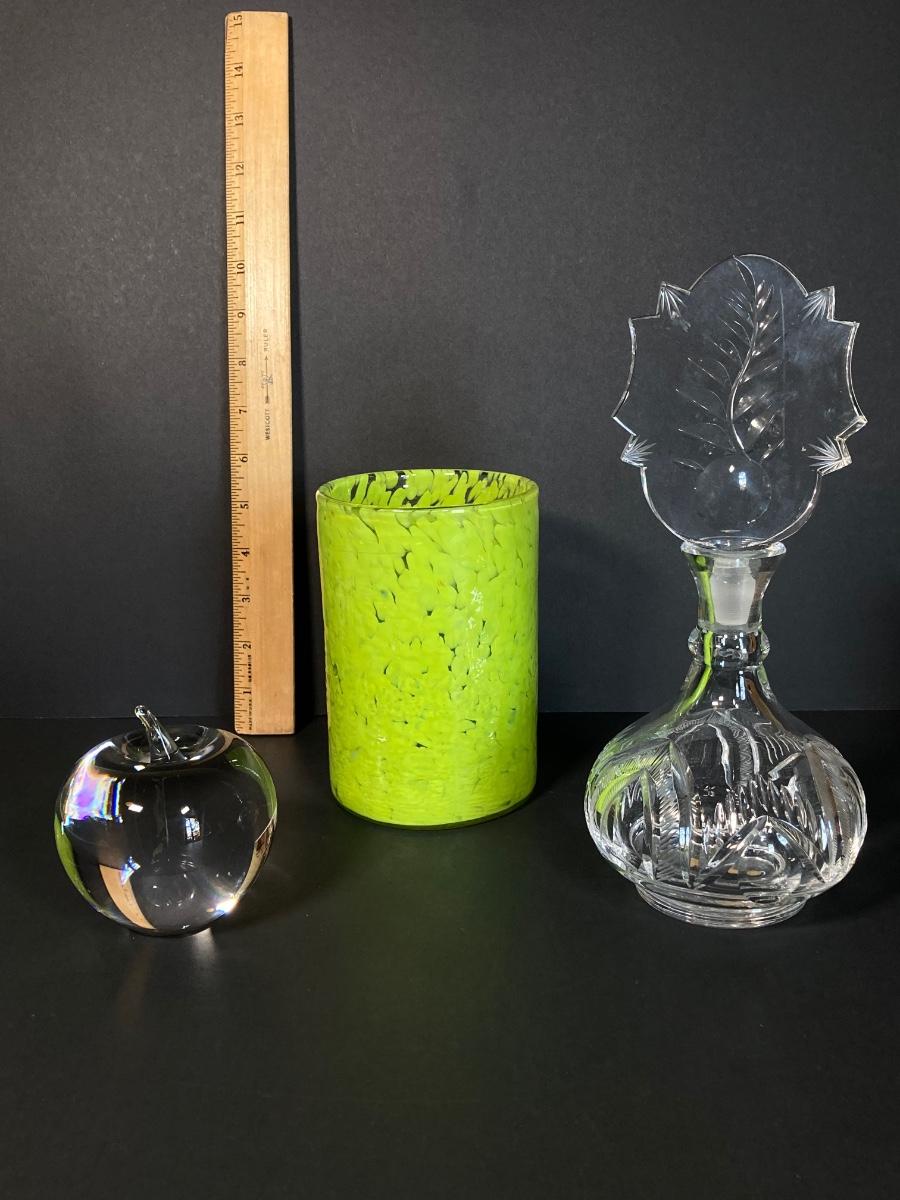 LOT 107: Art Glass Collection - Tiffany Apple, Western Germany Bottle / Decanter and Hand Blown Vase