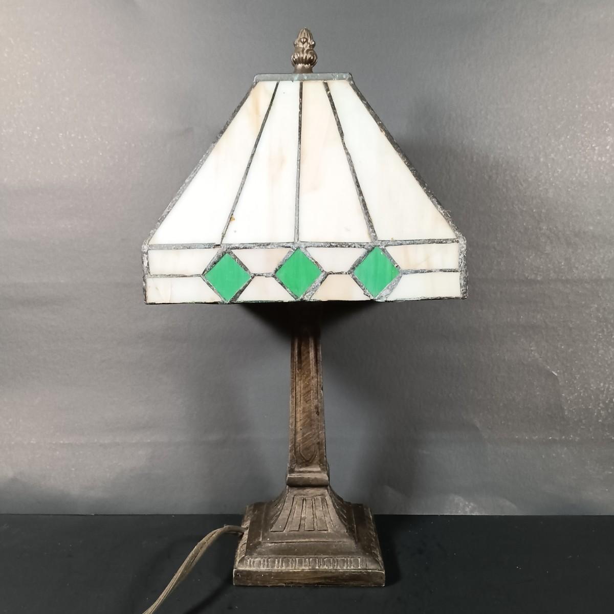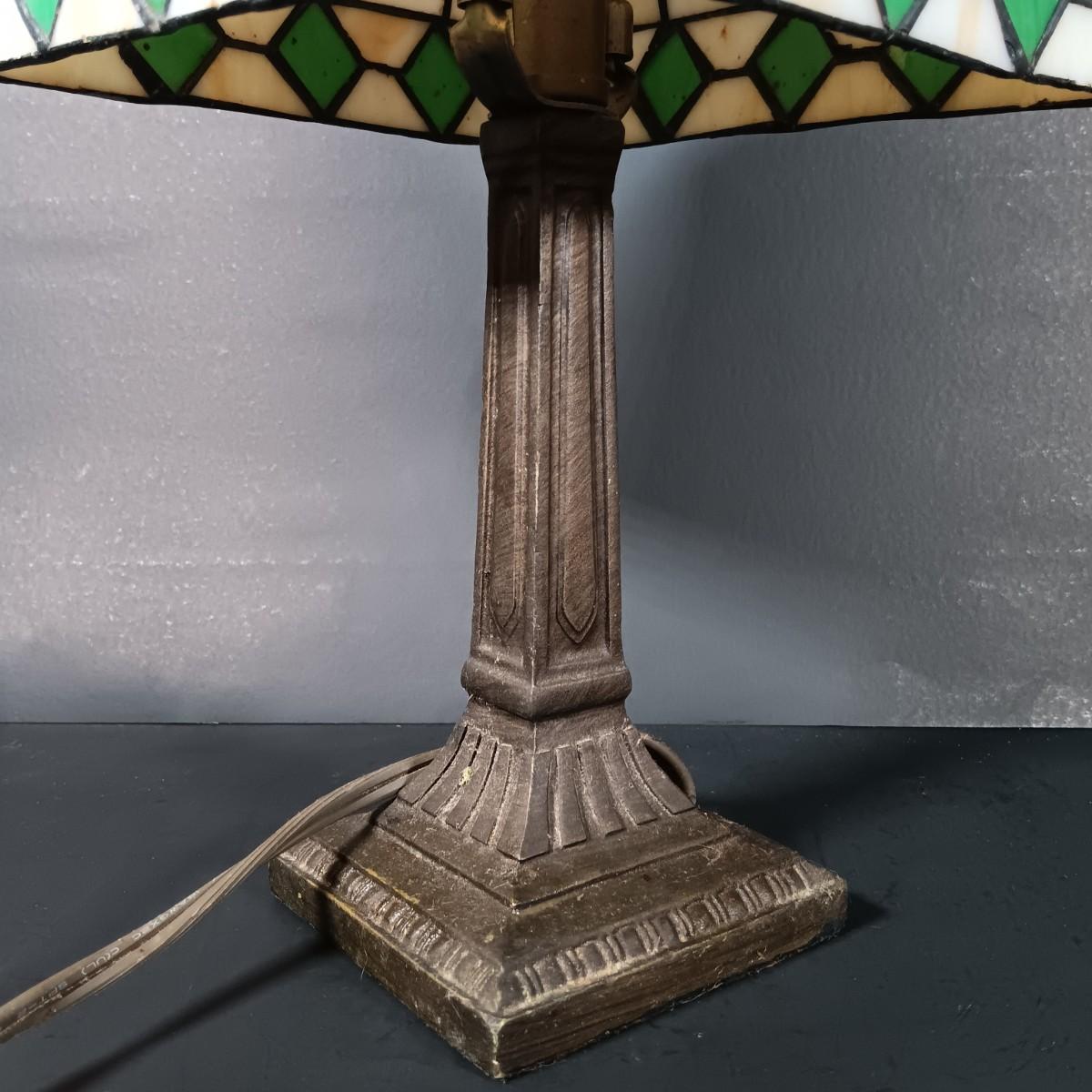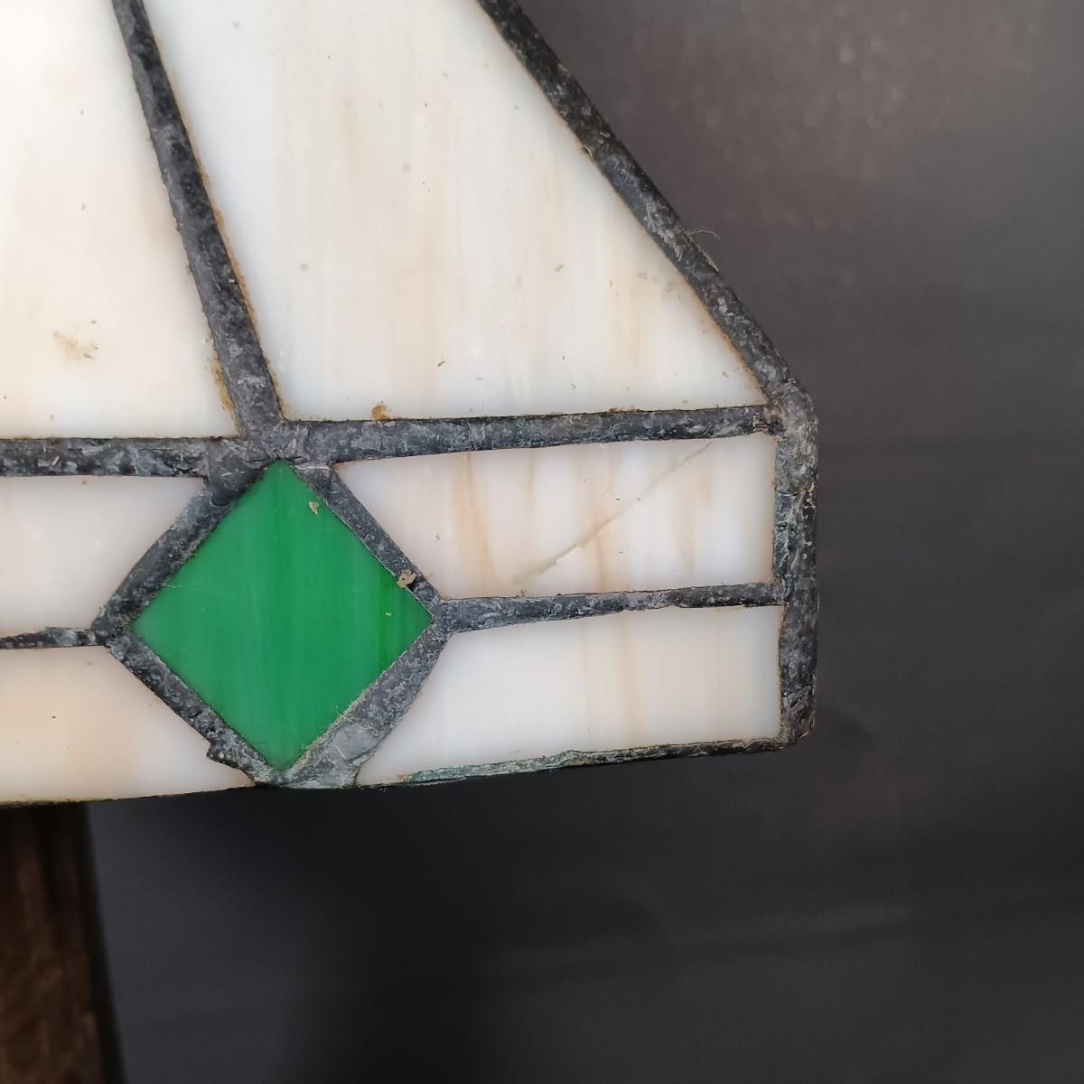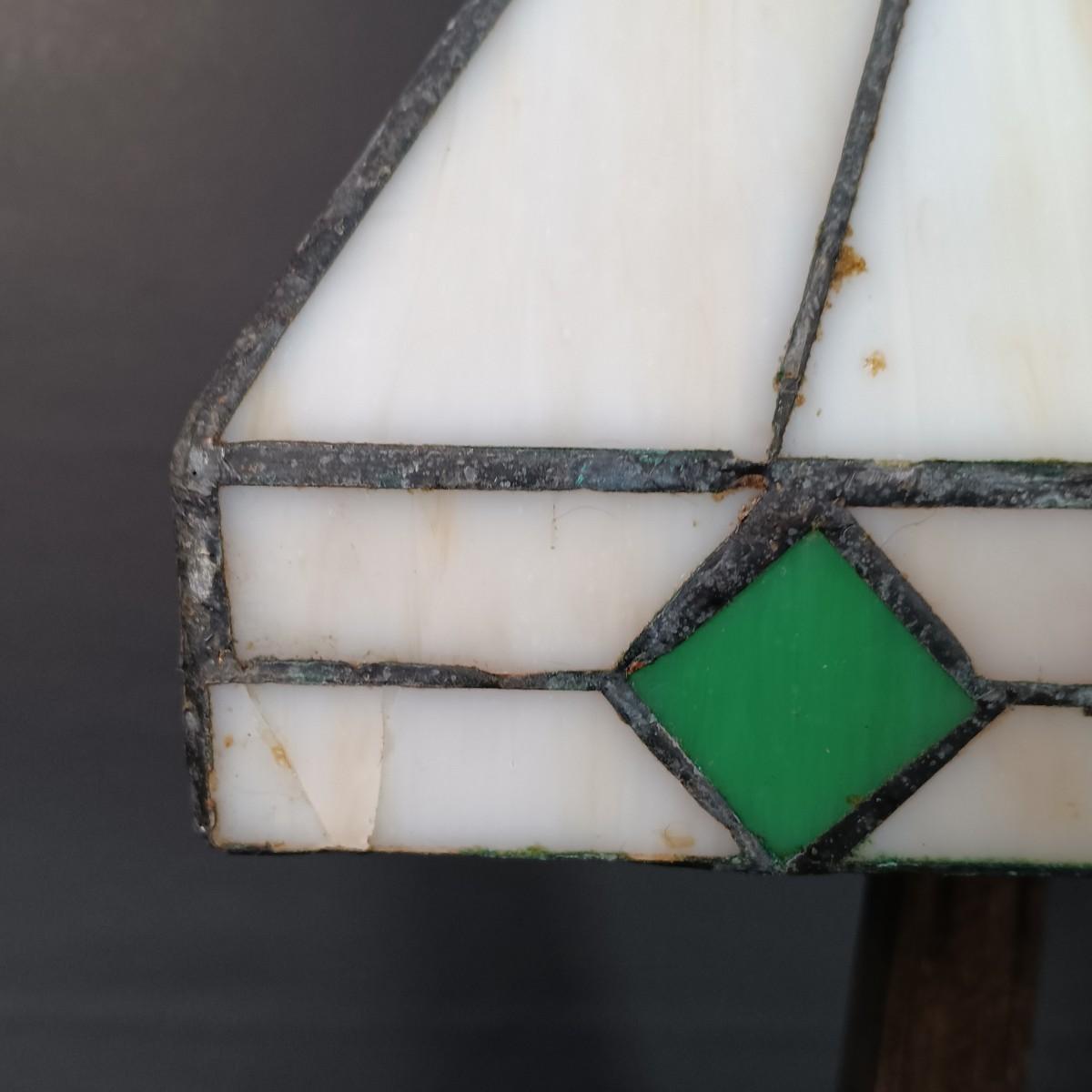 The stained glass lamp has some cracked panels.