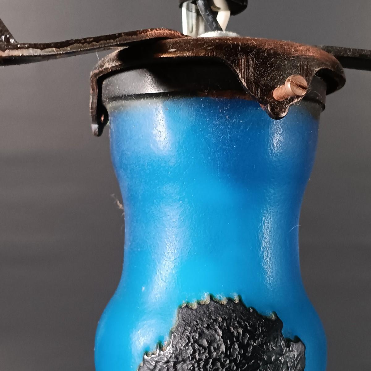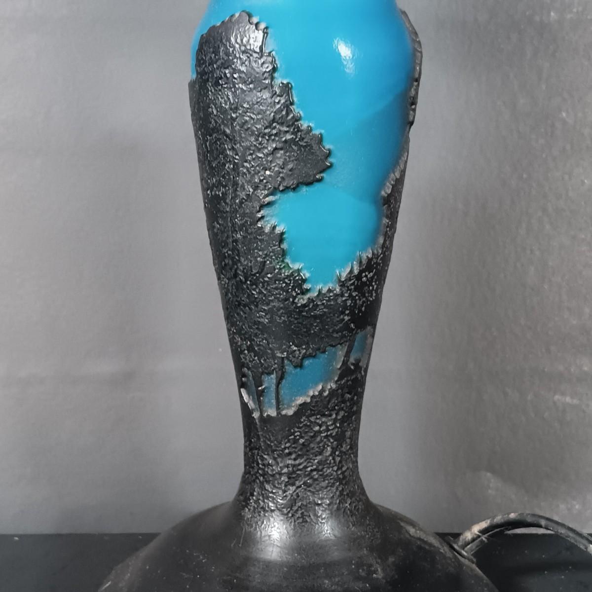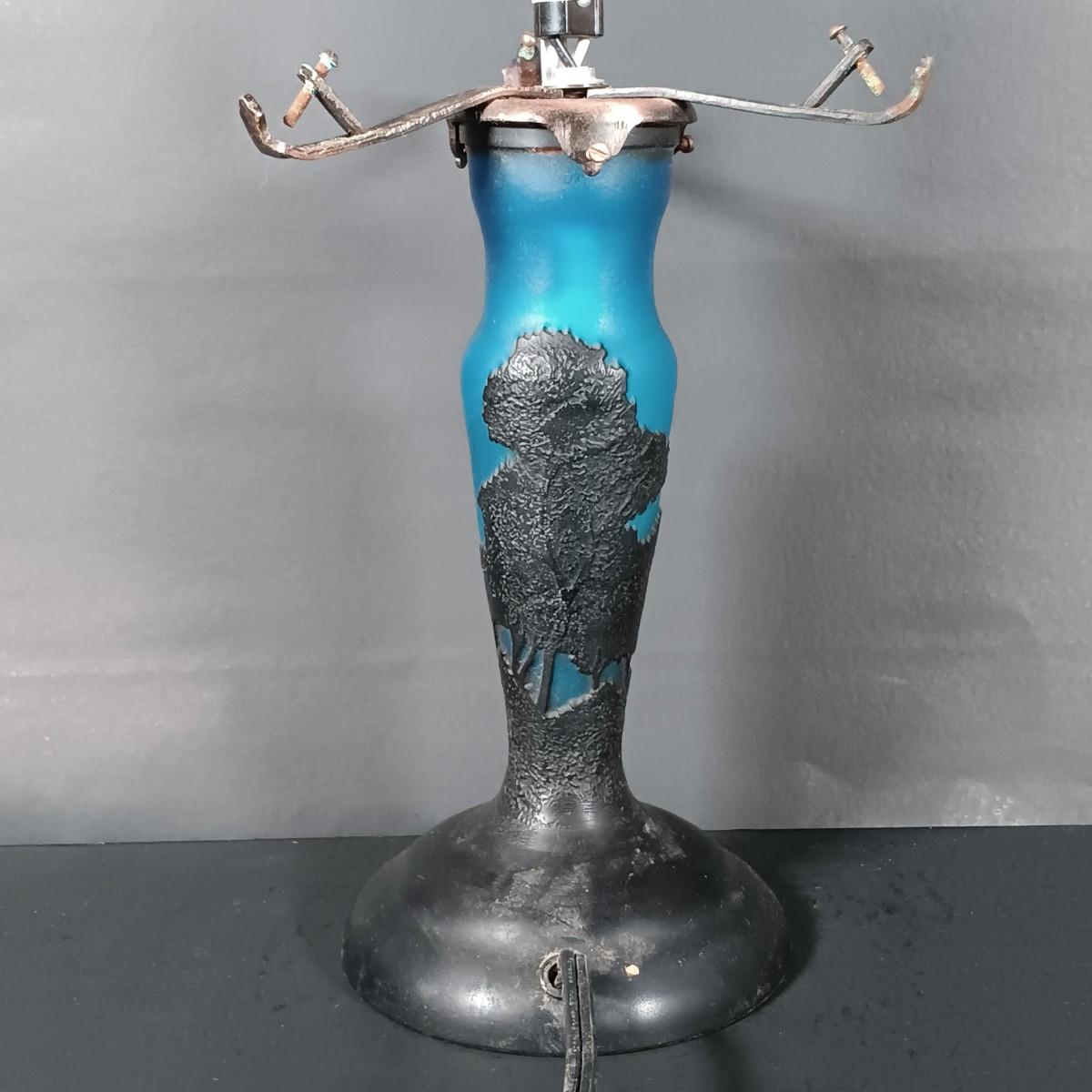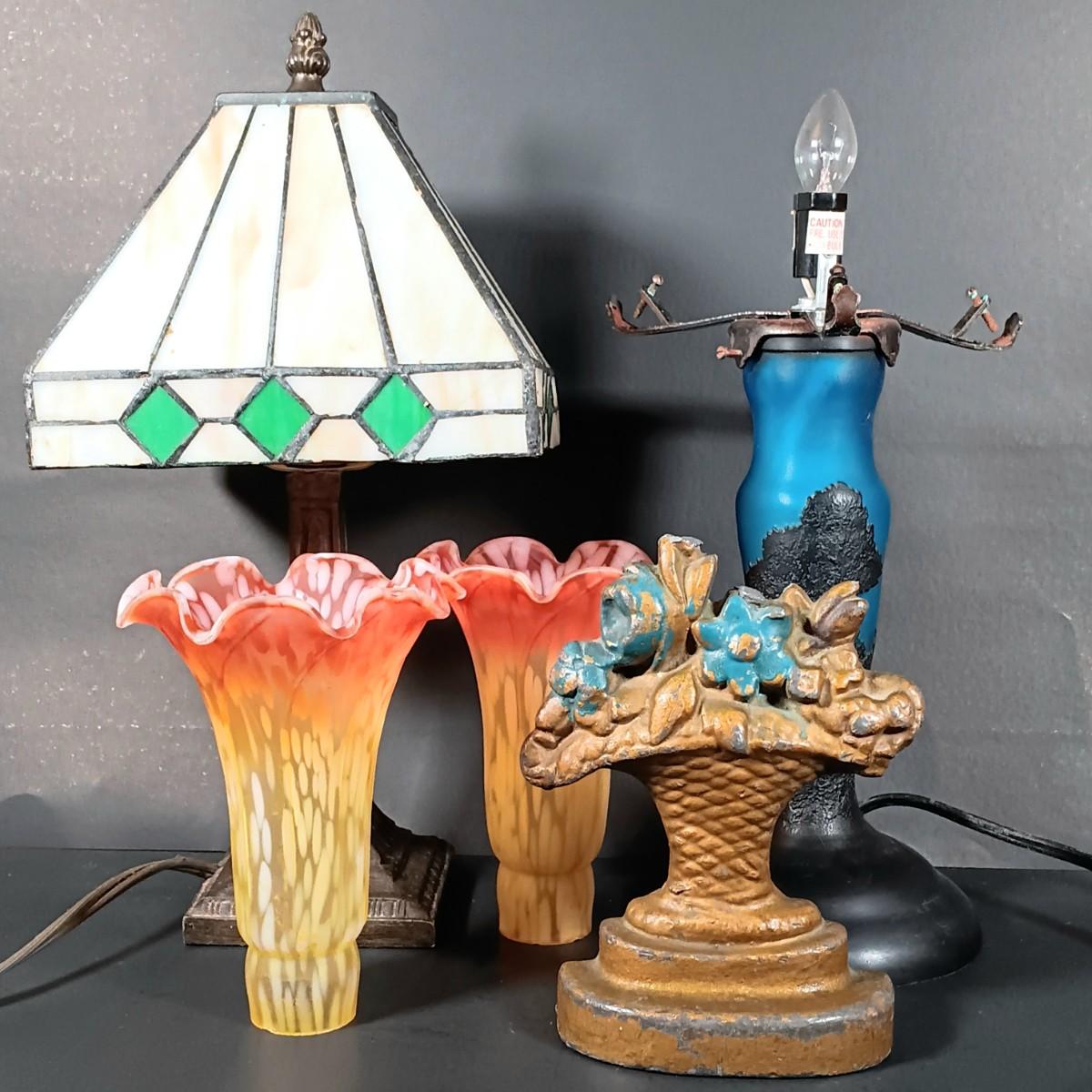 LOT 120: Blue and Black Cameo Glass Lamp, Stained Glass Art Deco Lamp, Tiffany-Style Lily Lamp Shades & Cast Iron Doorstop