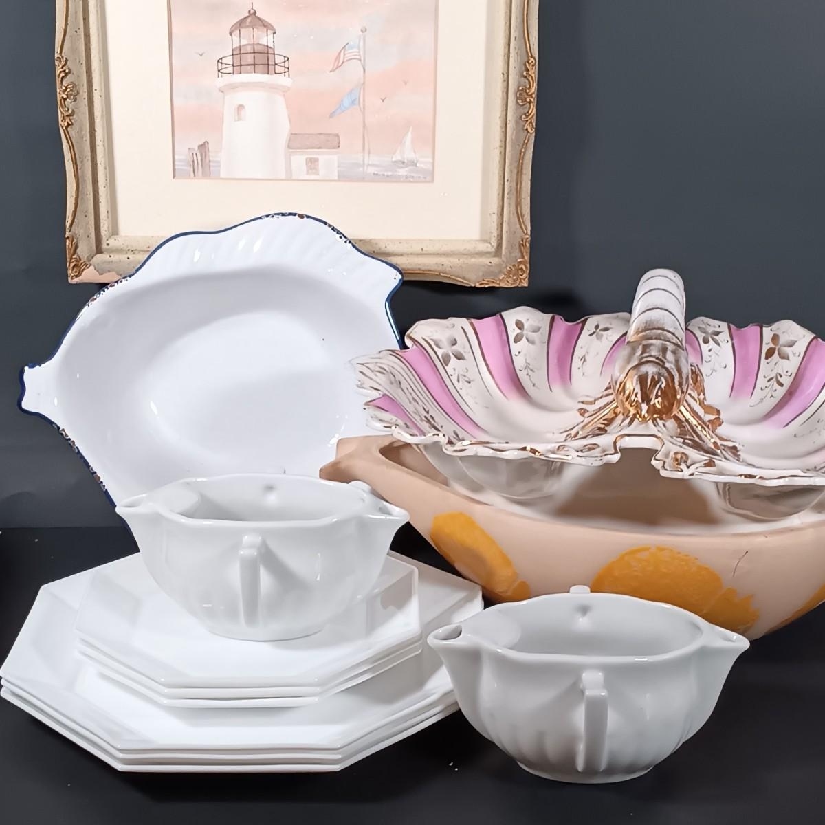LOT 129: Vintage Porcelain Lobster Dish, Signed Mirabel Smith Watercolor, Arcopal France Plates, Pillivuyt France Gravy Boats & More