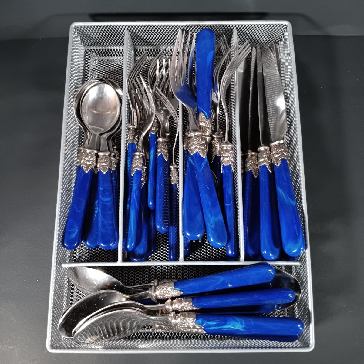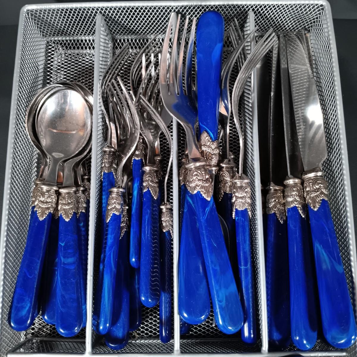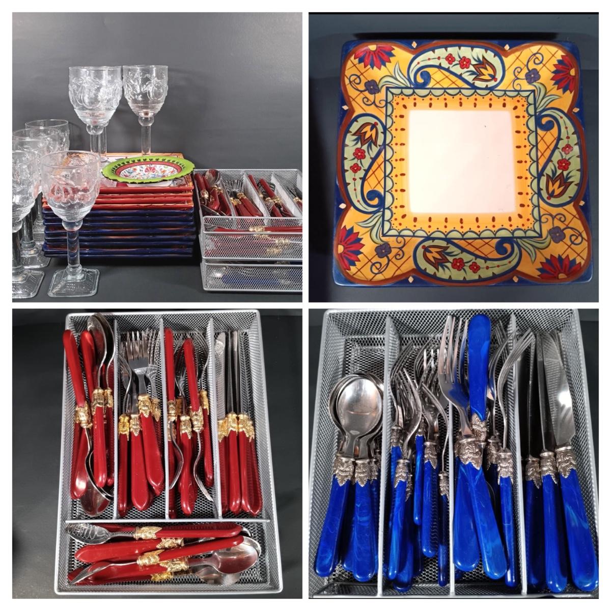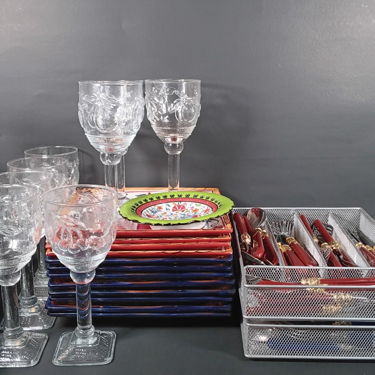 LOT 132: Embossed Fruit Pedestal Glasses w/ Hampton Silversmiths Stainless Steel Red Handled Cutlery, Corsica Crown Jewel Blue Plates & More