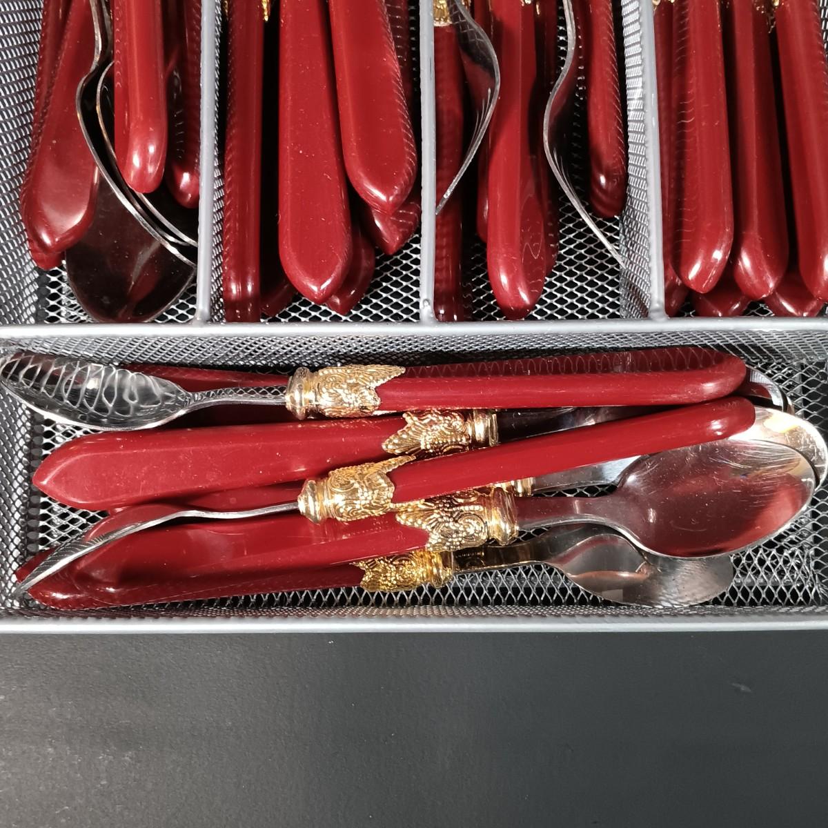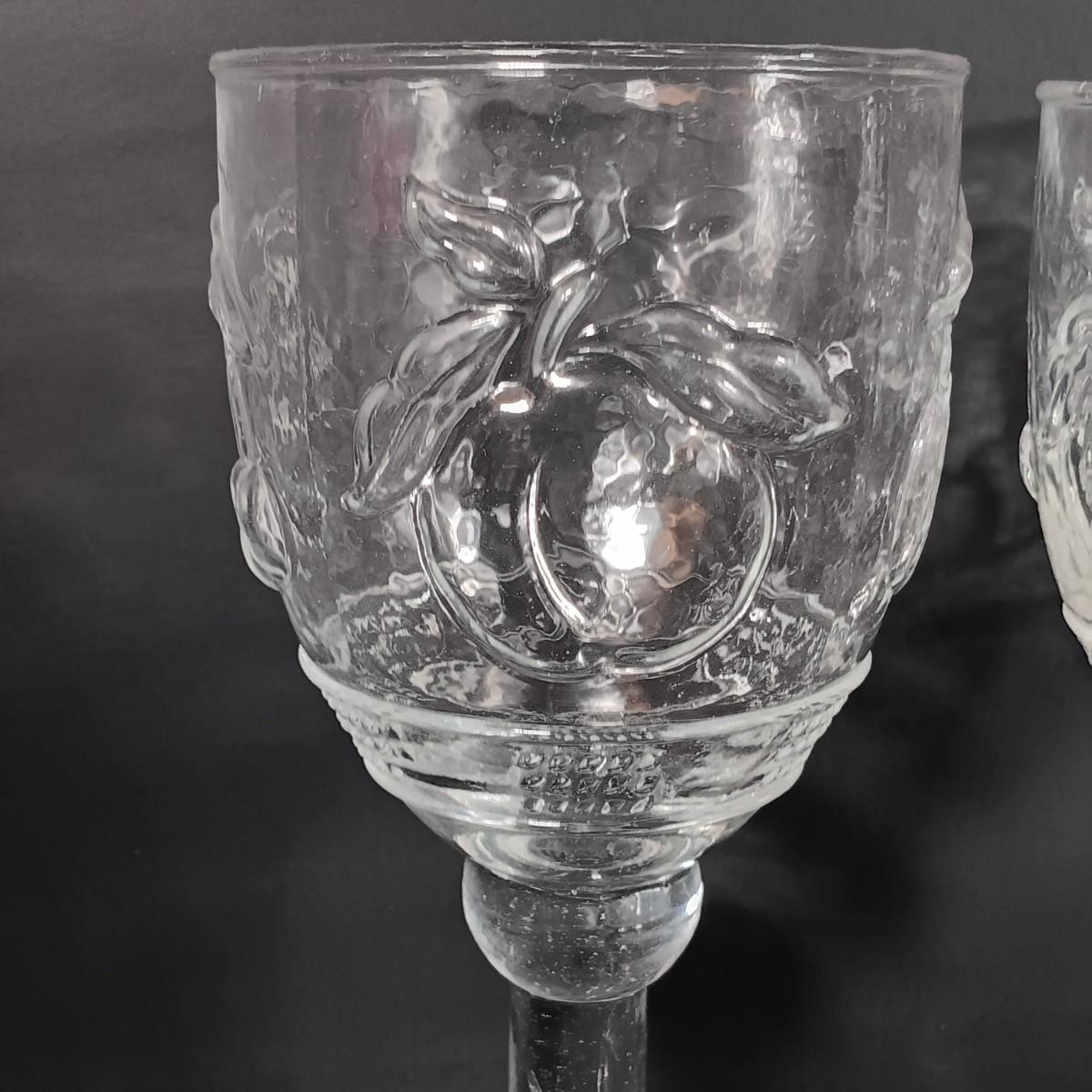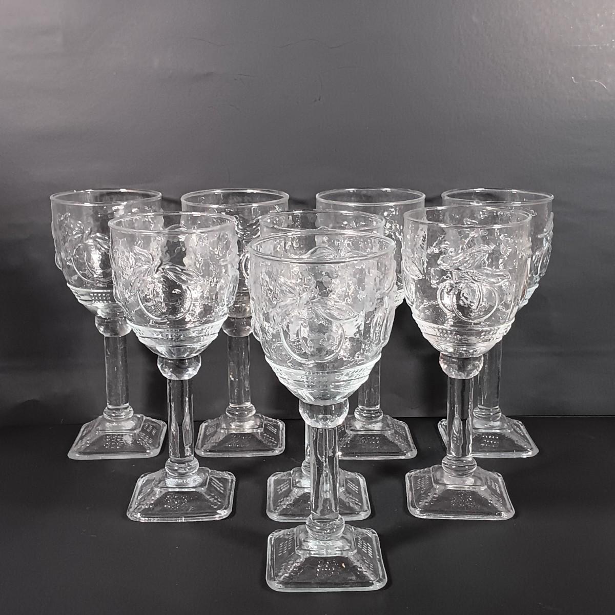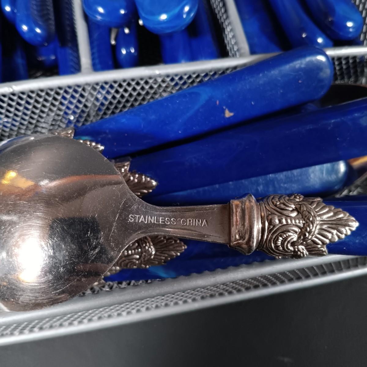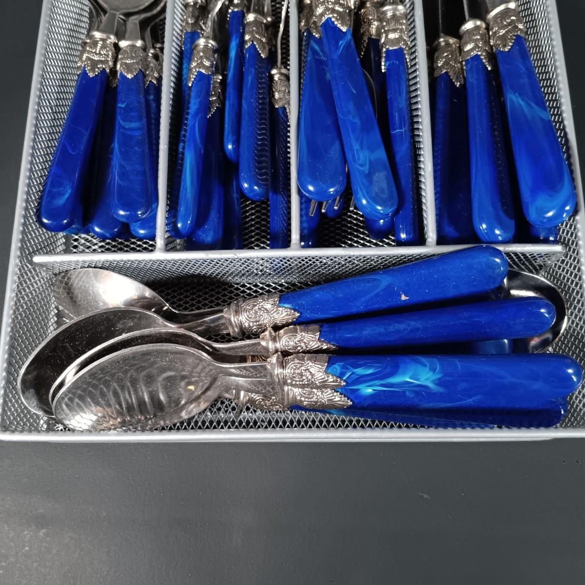 LOT 132: Embossed Fruit Pedestal Glasses w/ Hampton Silversmiths Stainless Steel Red Handled Cutlery, Corsica Crown Jewel Blue Plates & More