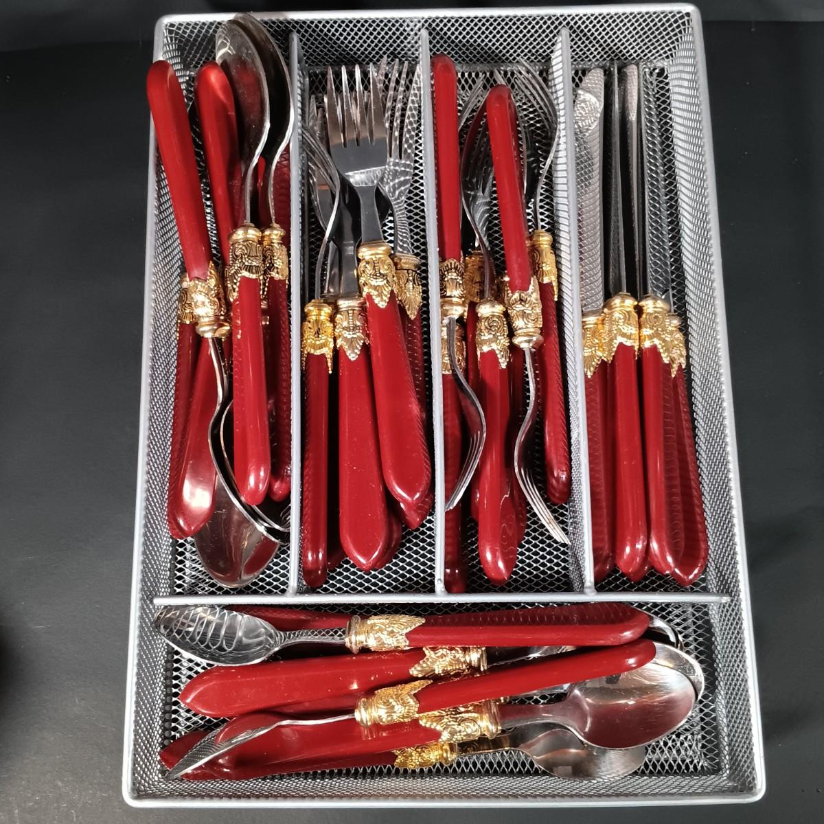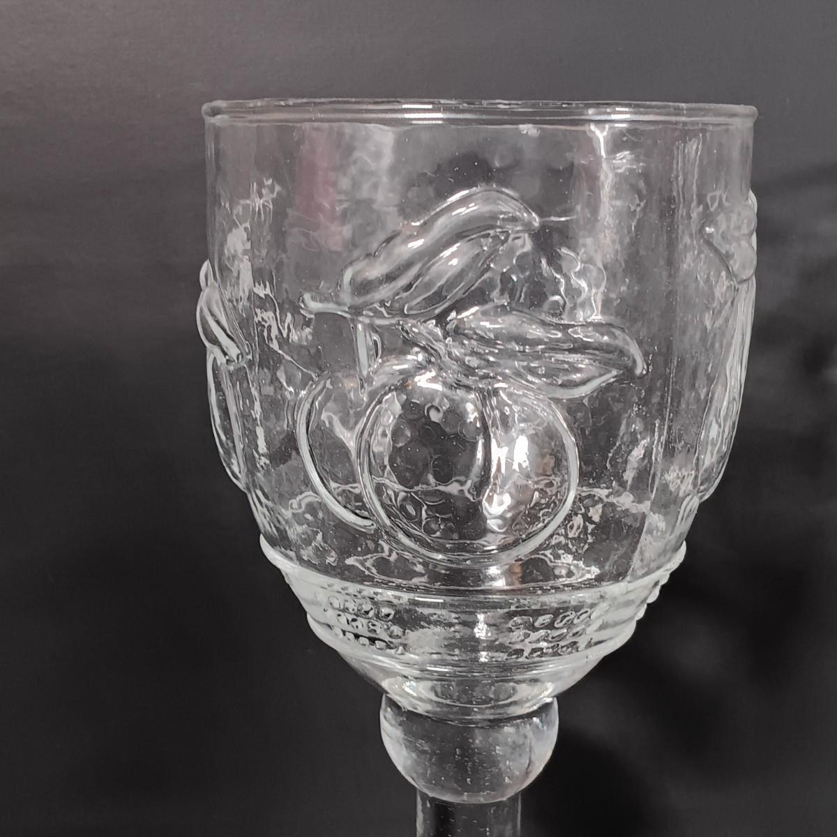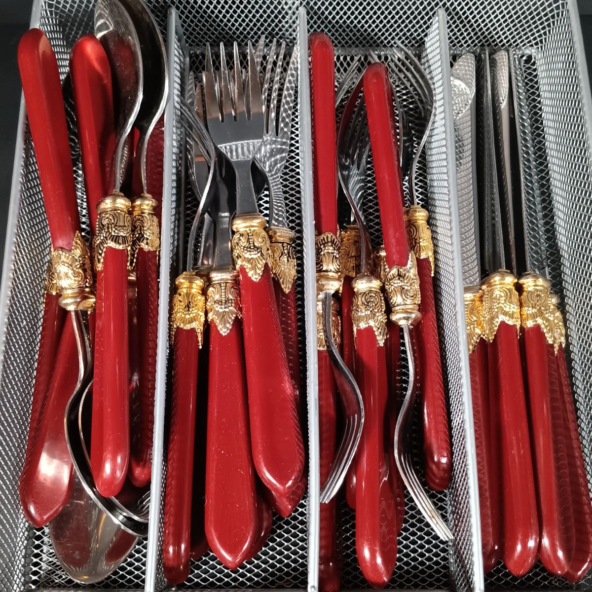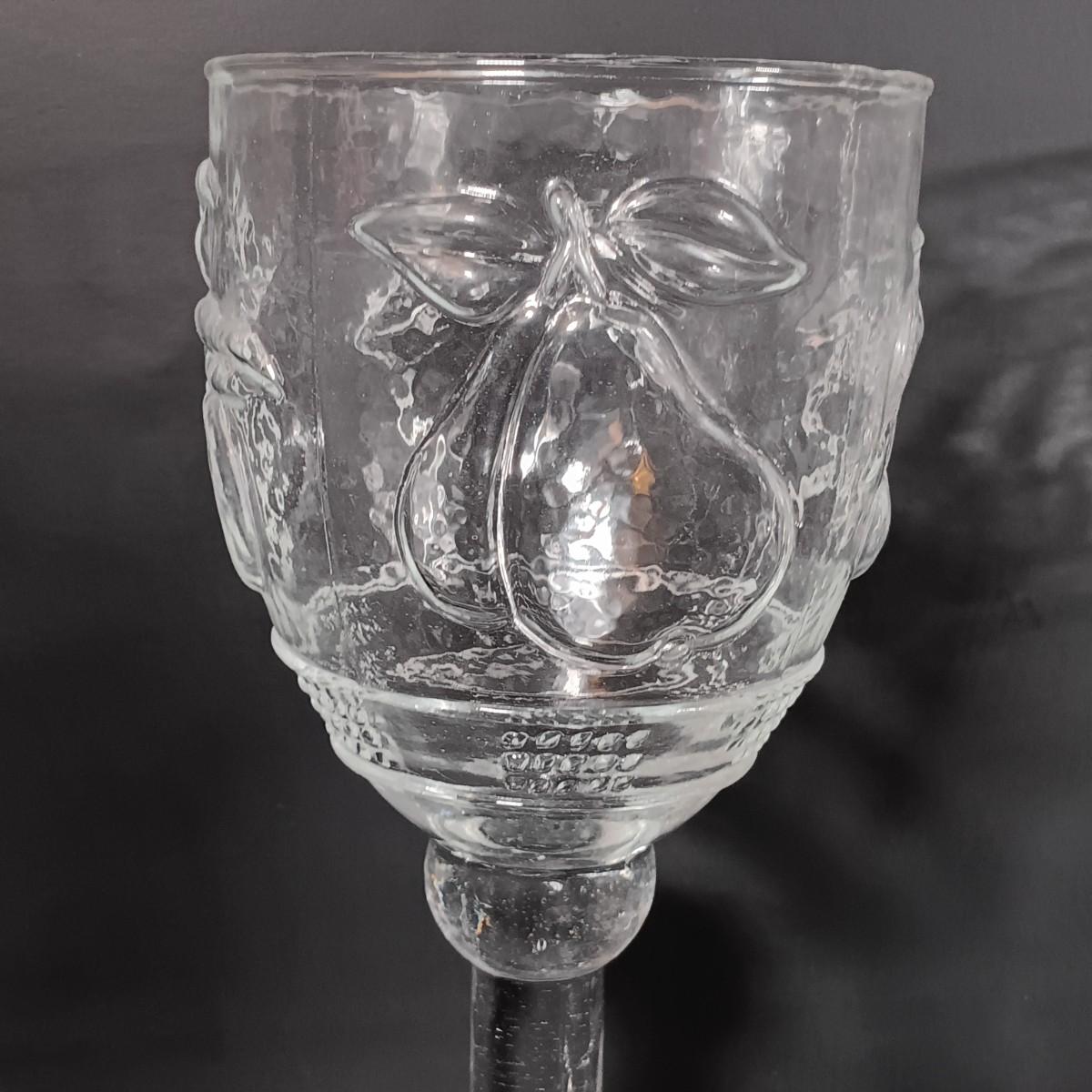 LOT 132: Embossed Fruit Pedestal Glasses w/ Hampton Silversmiths Stainless Steel Red Handled Cutlery, Corsica Crown Jewel Blue Plates & More