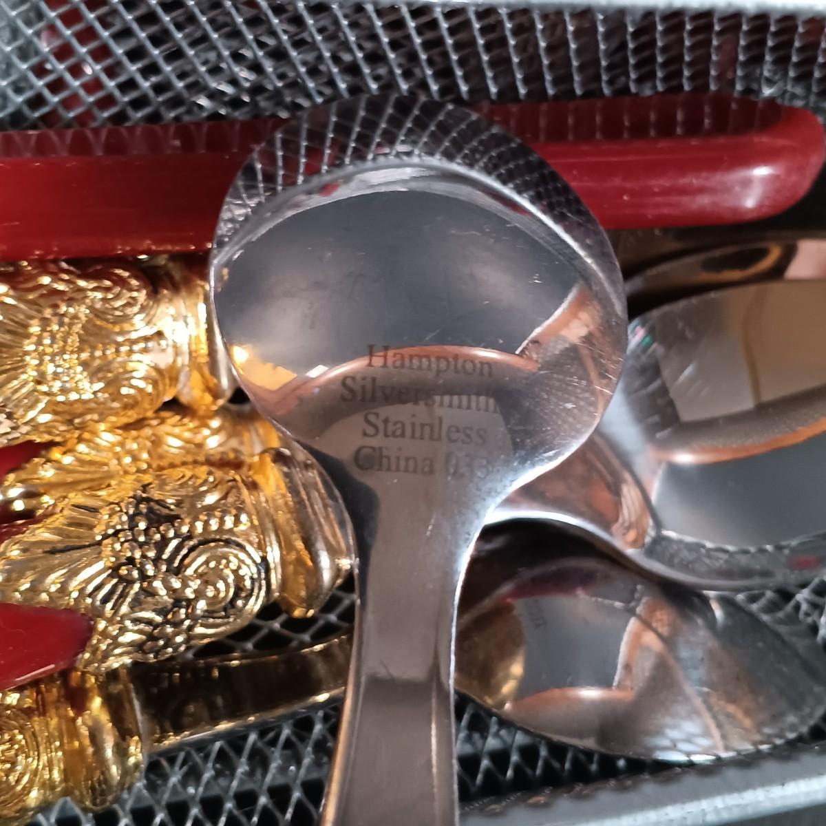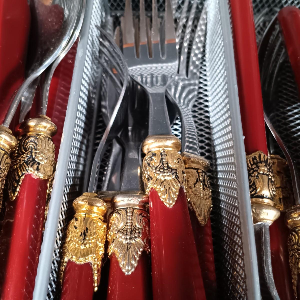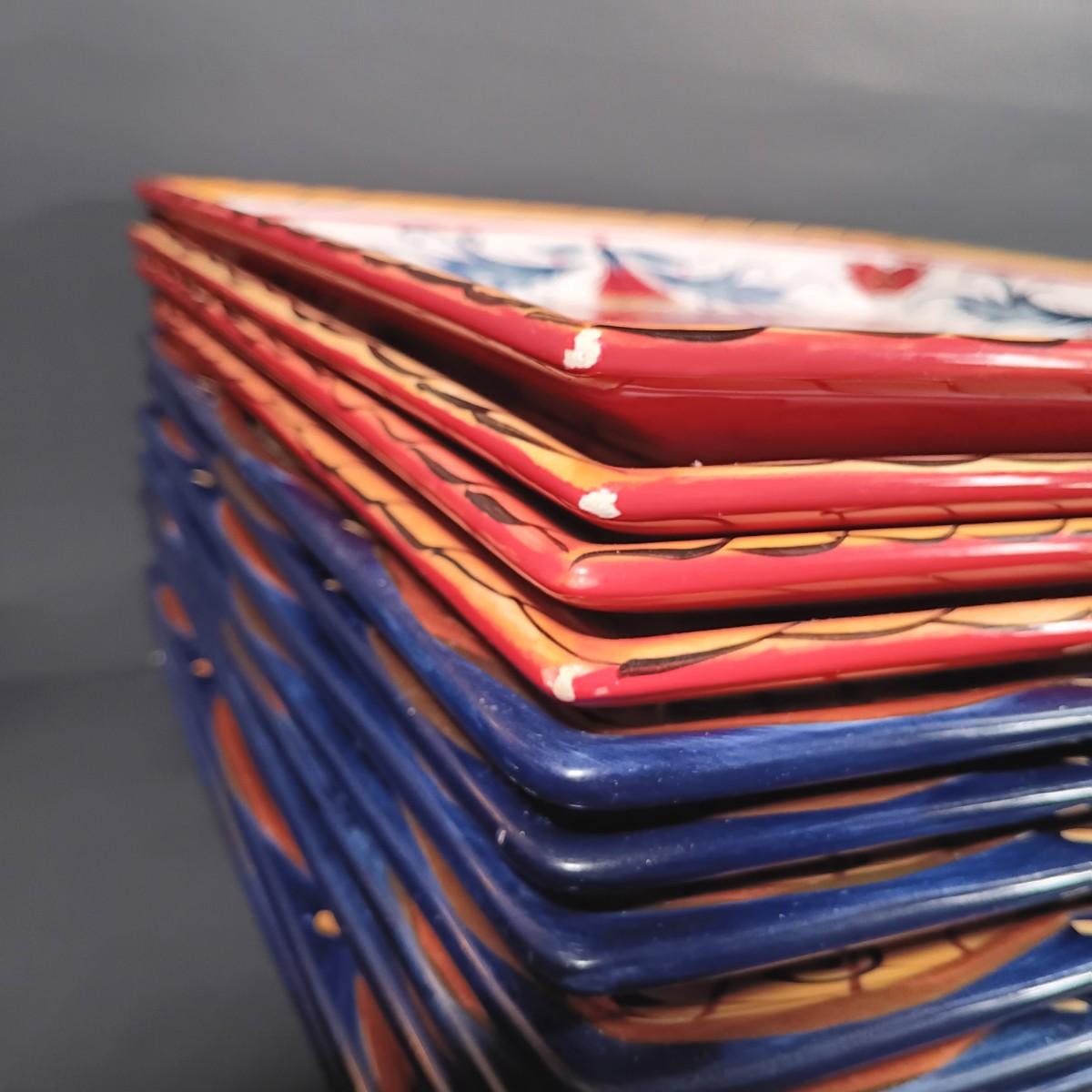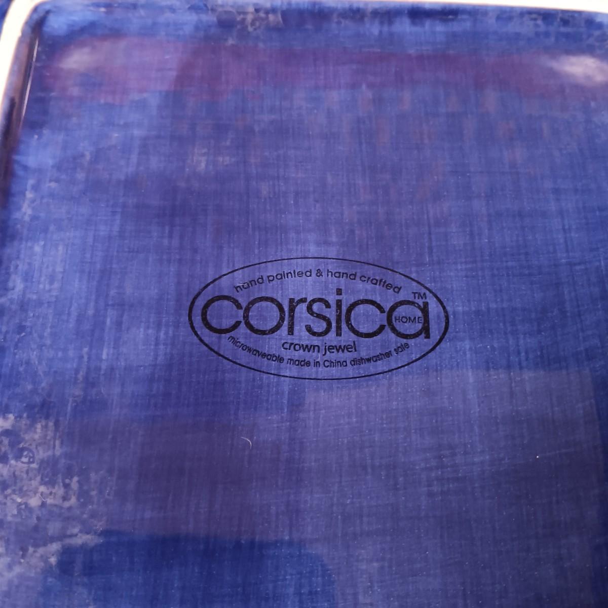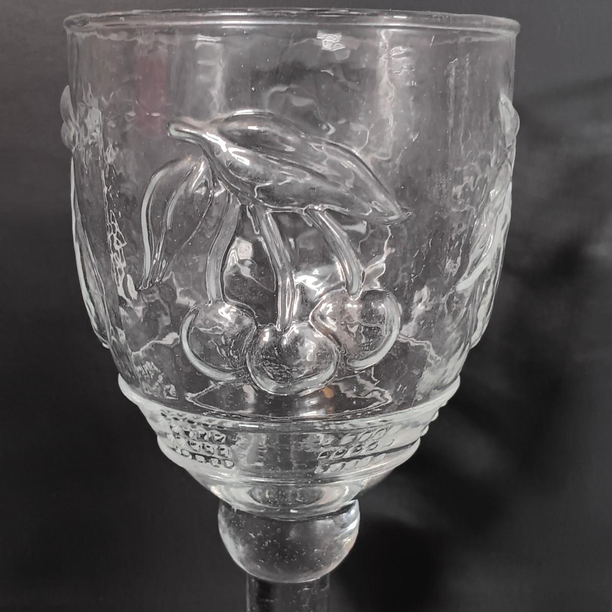 LOT 132: Embossed Fruit Pedestal Glasses w/ Hampton Silversmiths Stainless Steel Red Handled Cutlery, Corsica Crown Jewel Blue Plates & More