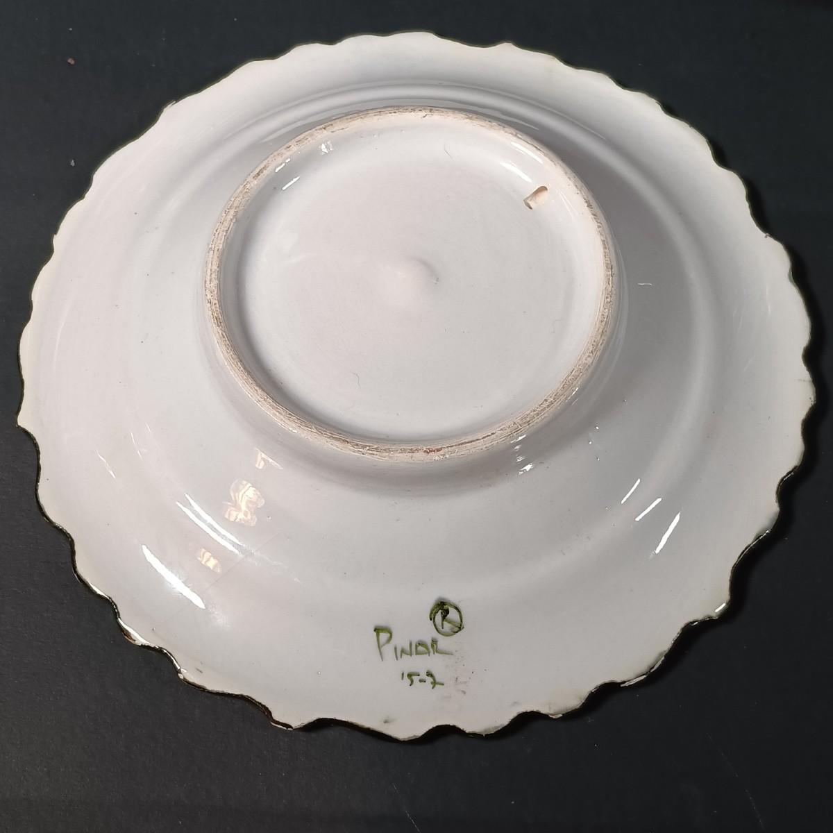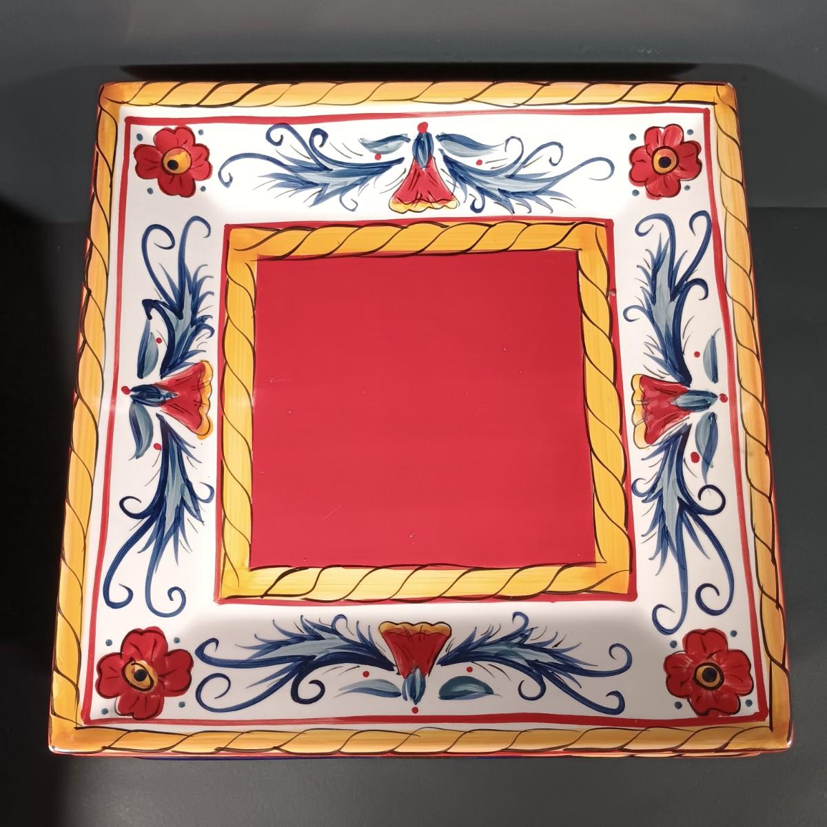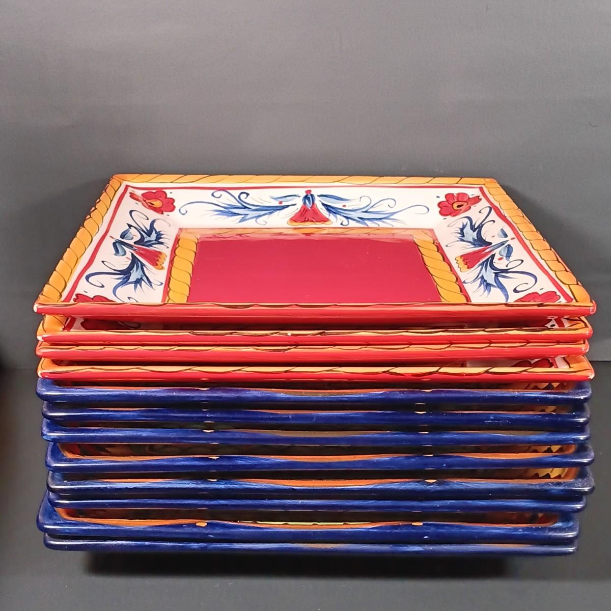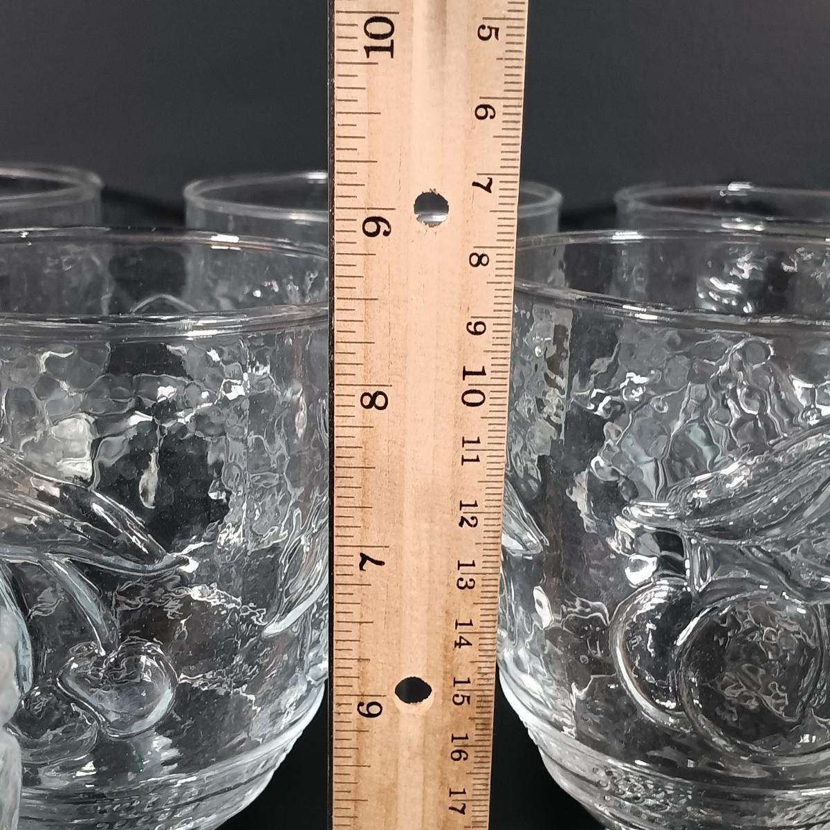 LOT 132: Embossed Fruit Pedestal Glasses w/ Hampton Silversmiths Stainless Steel Red Handled Cutlery, Corsica Crown Jewel Blue Plates & More