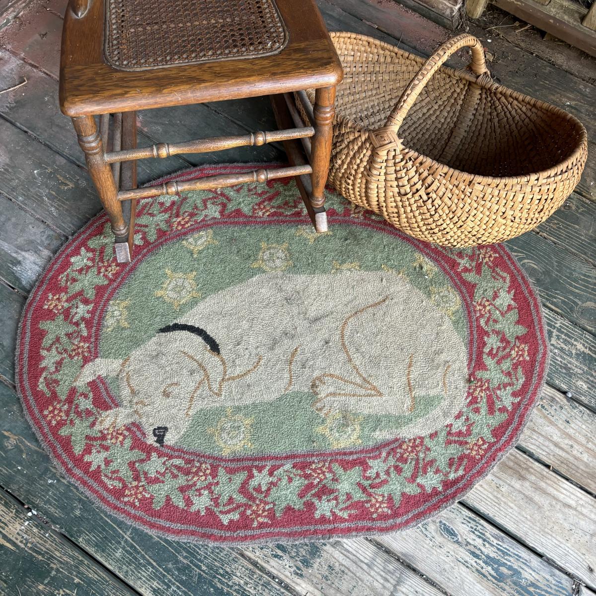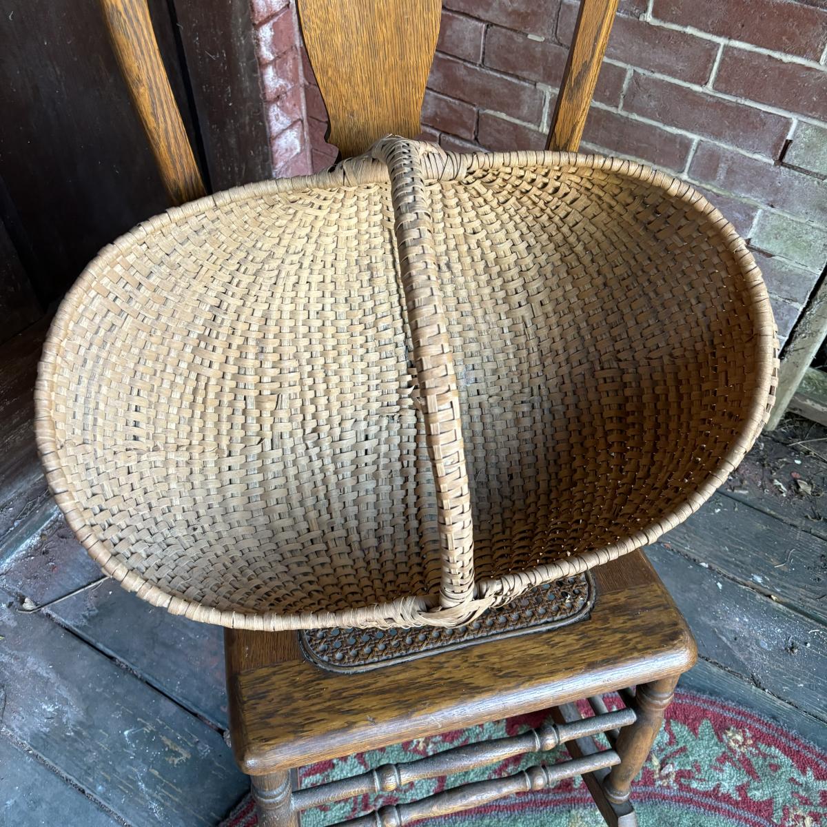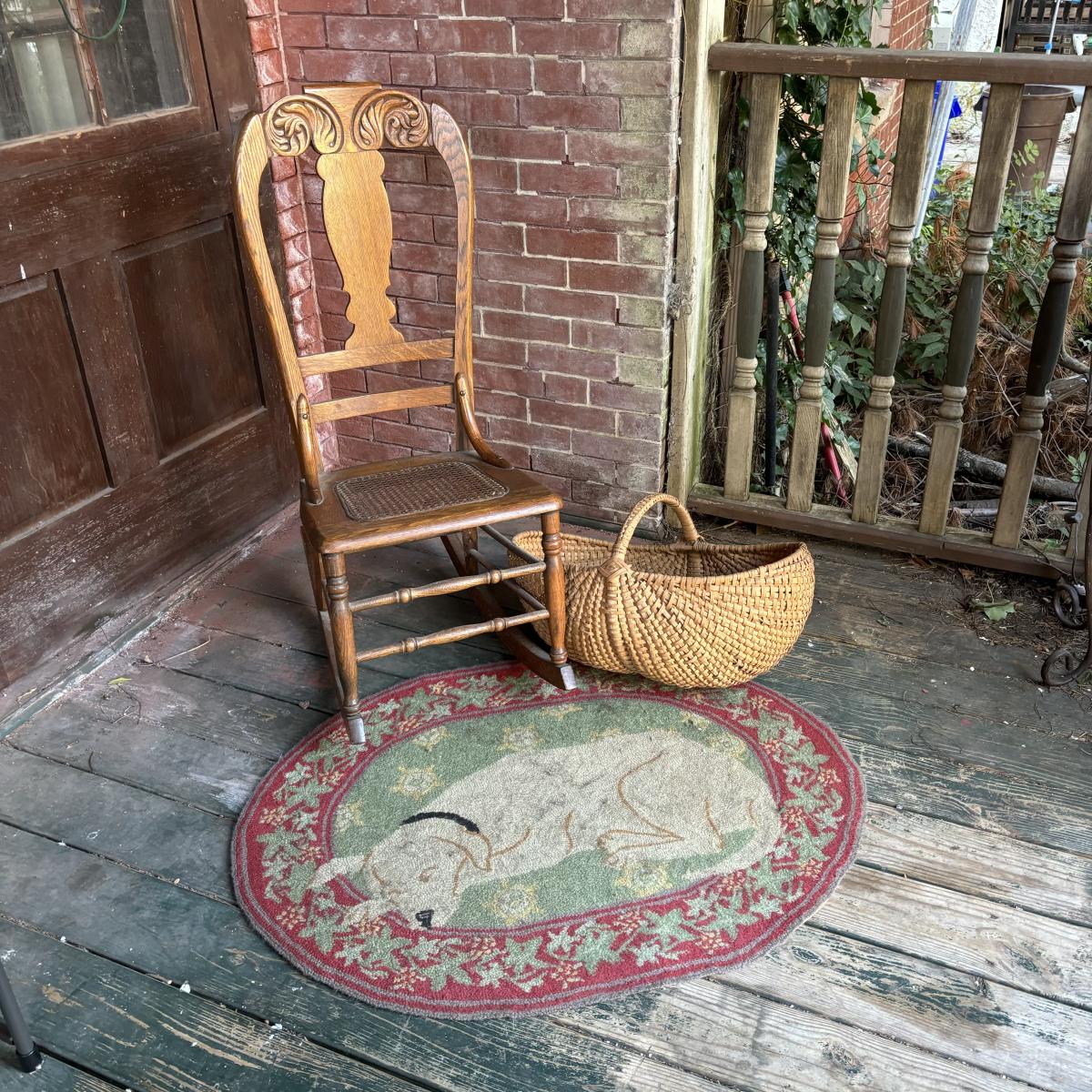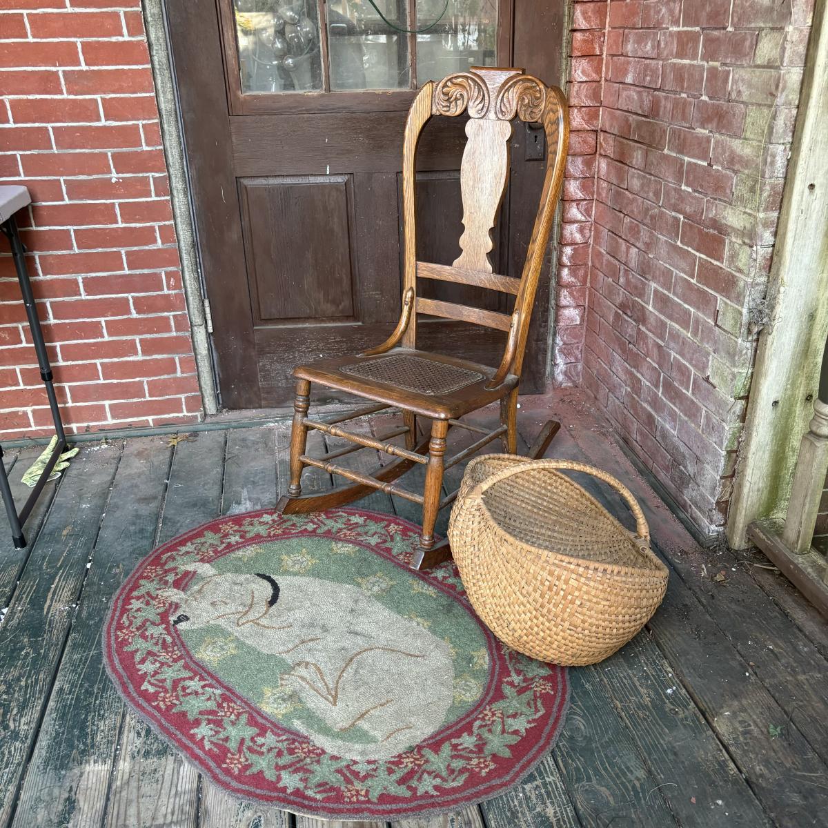 LOT 147: Vintage Cane Bottom Rocking Chair, Wool Area Rug & Gathering/Egg Basket