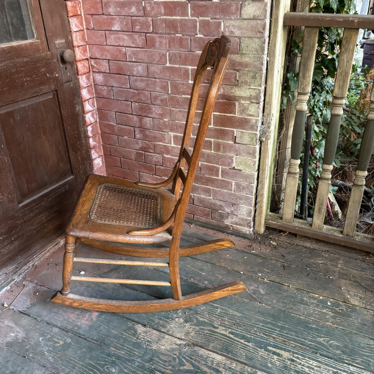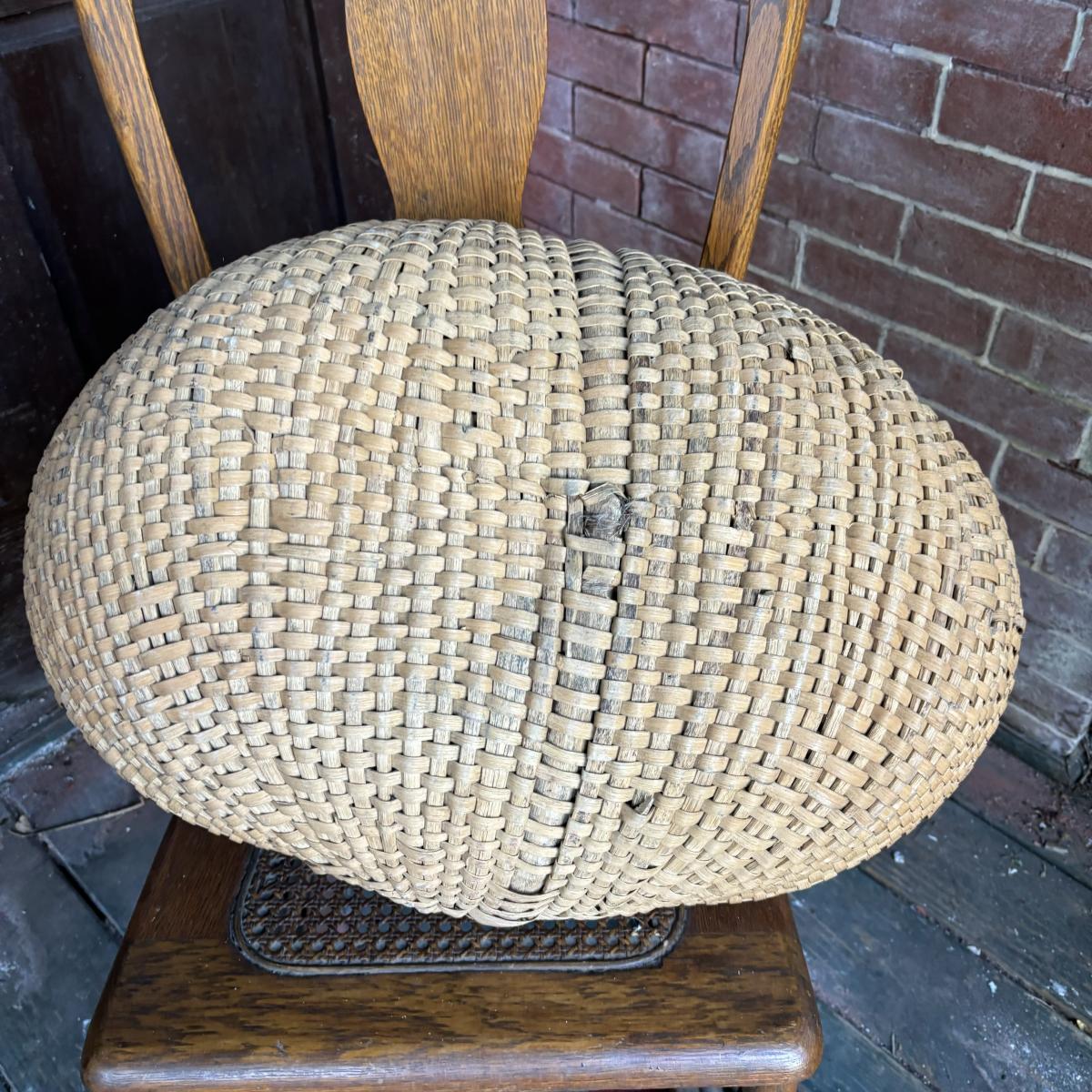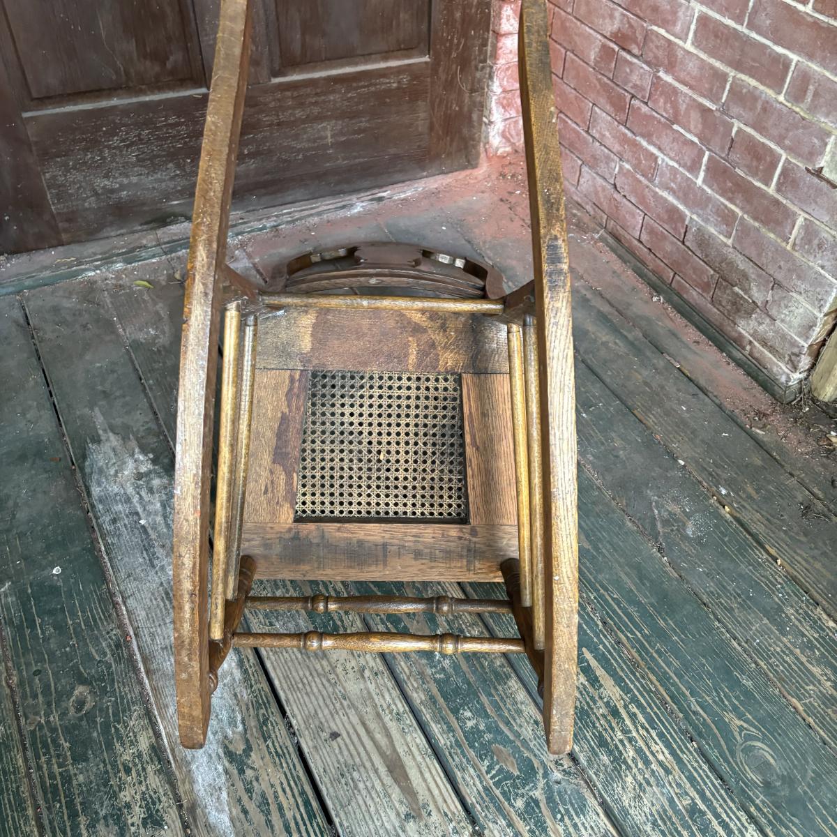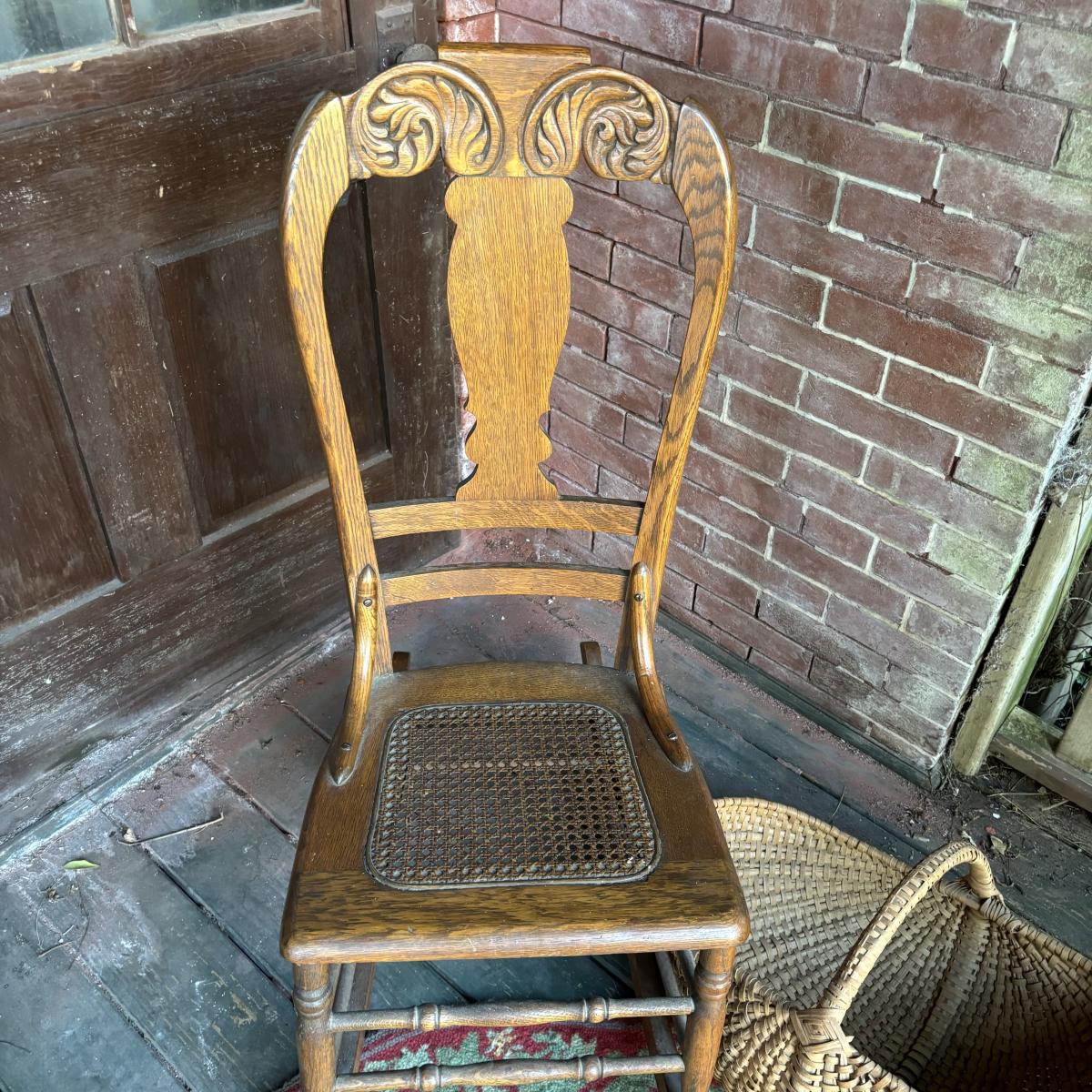 LOT 147: Vintage Cane Bottom Rocking Chair, Wool Area Rug & Gathering/Egg Basket