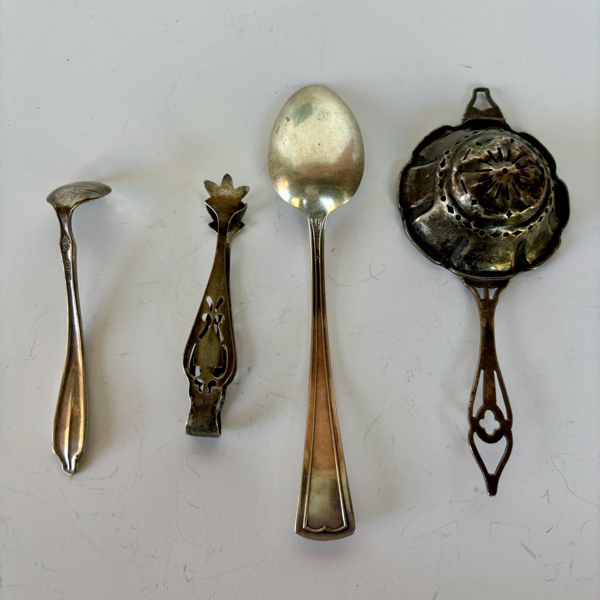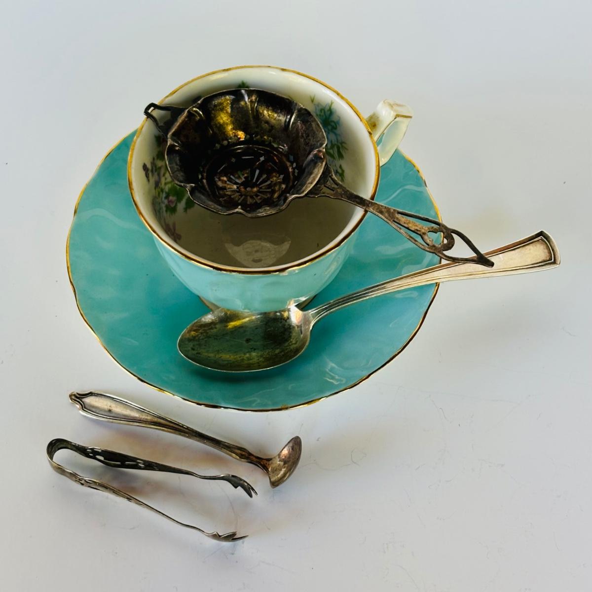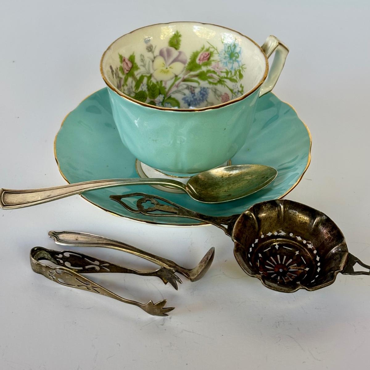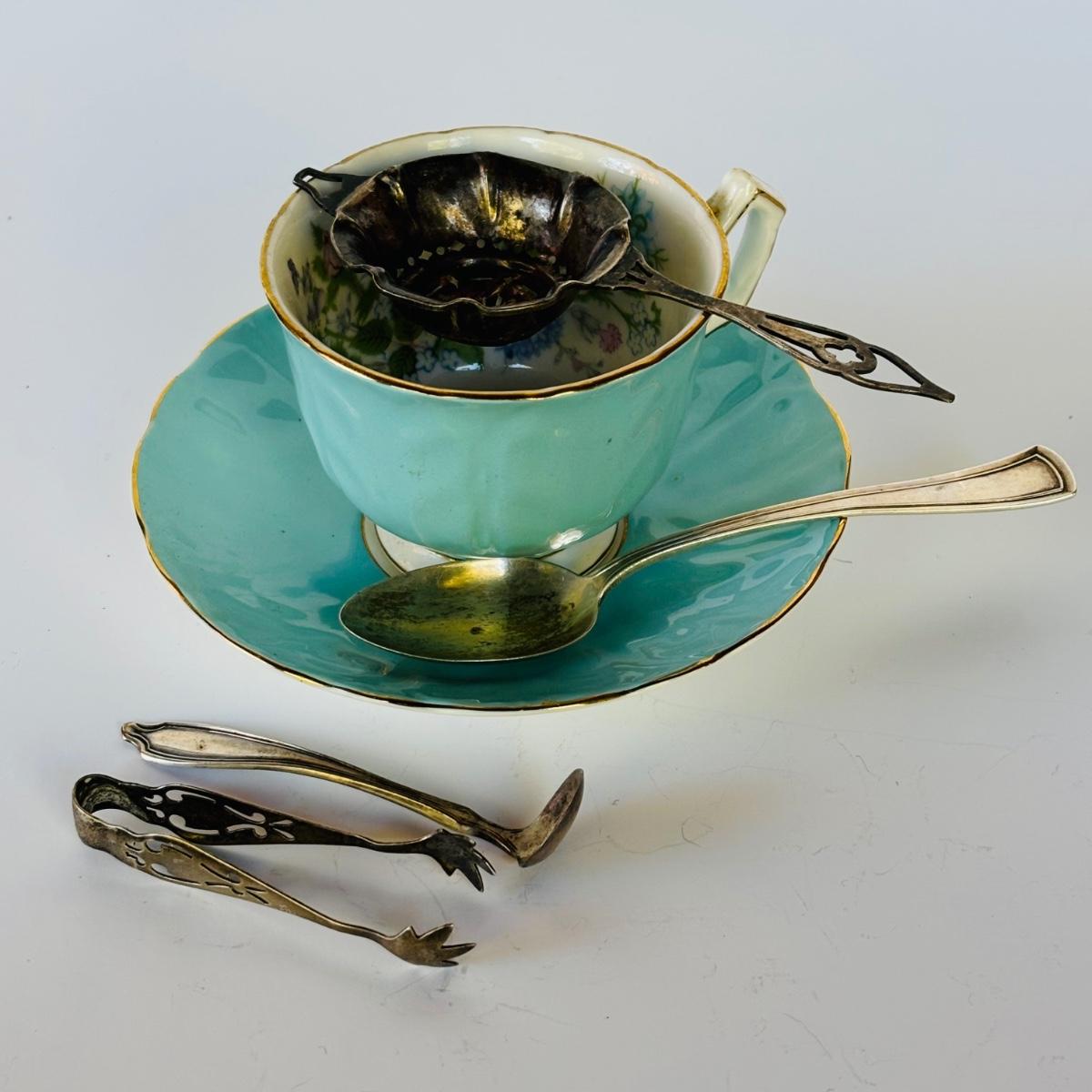 LOT 199: Sterling Silver Tea Strainer, Sugar Tongs, Condiment Spoon & Teaspoon Tw 52.12g & Aynsley Made in England Teacup