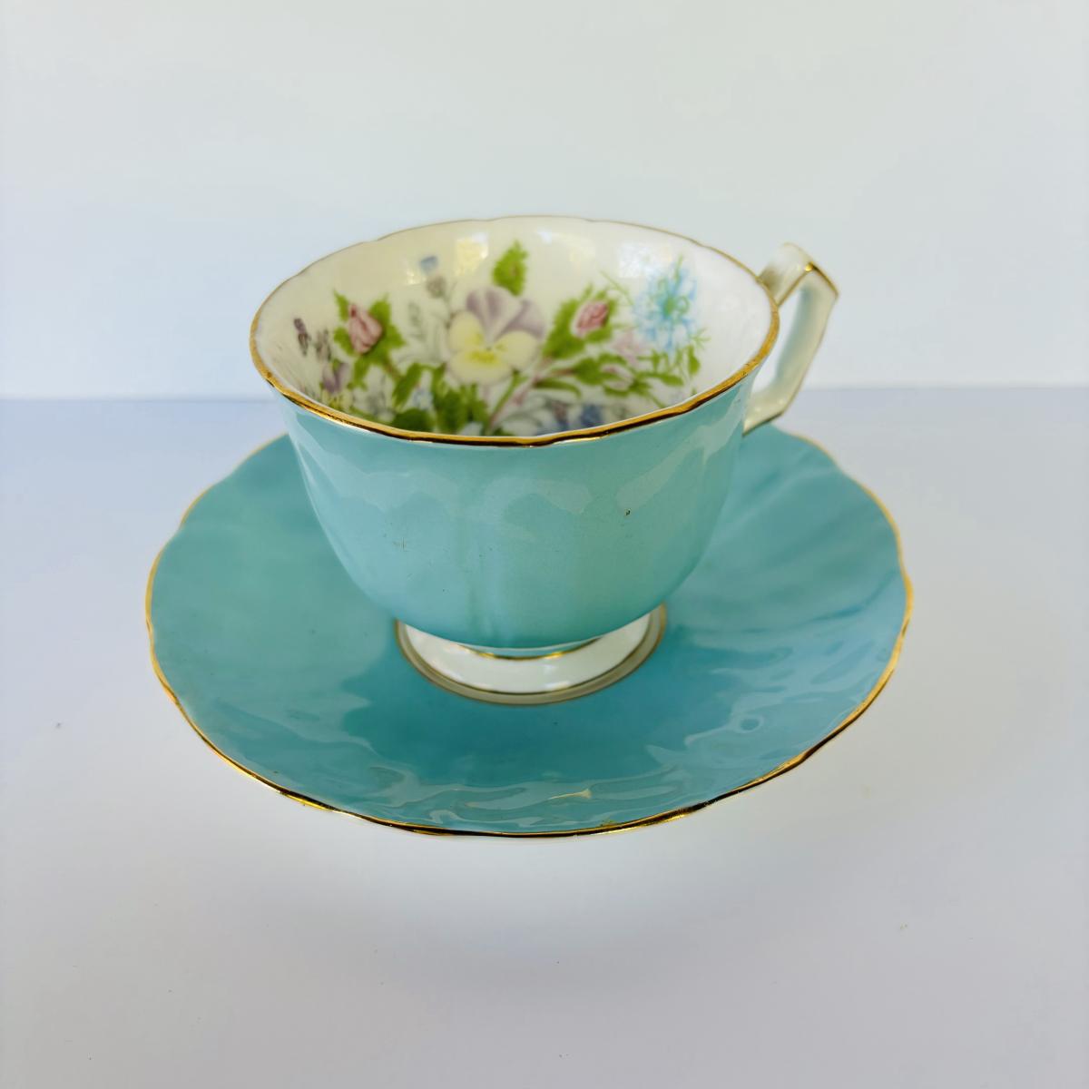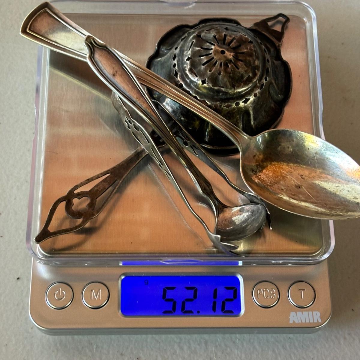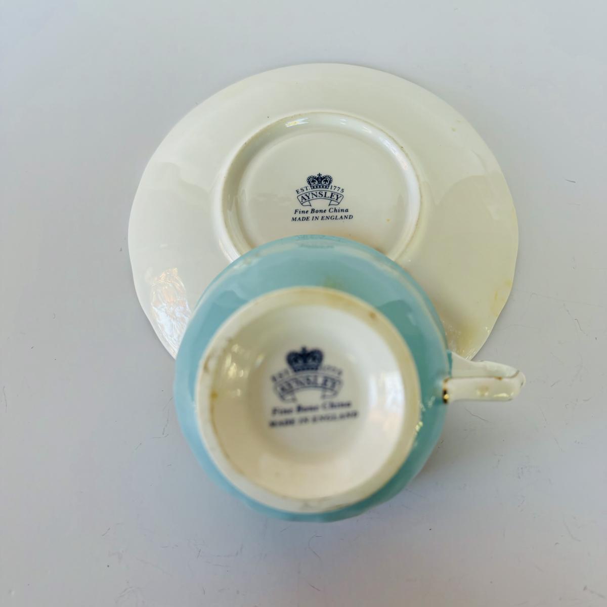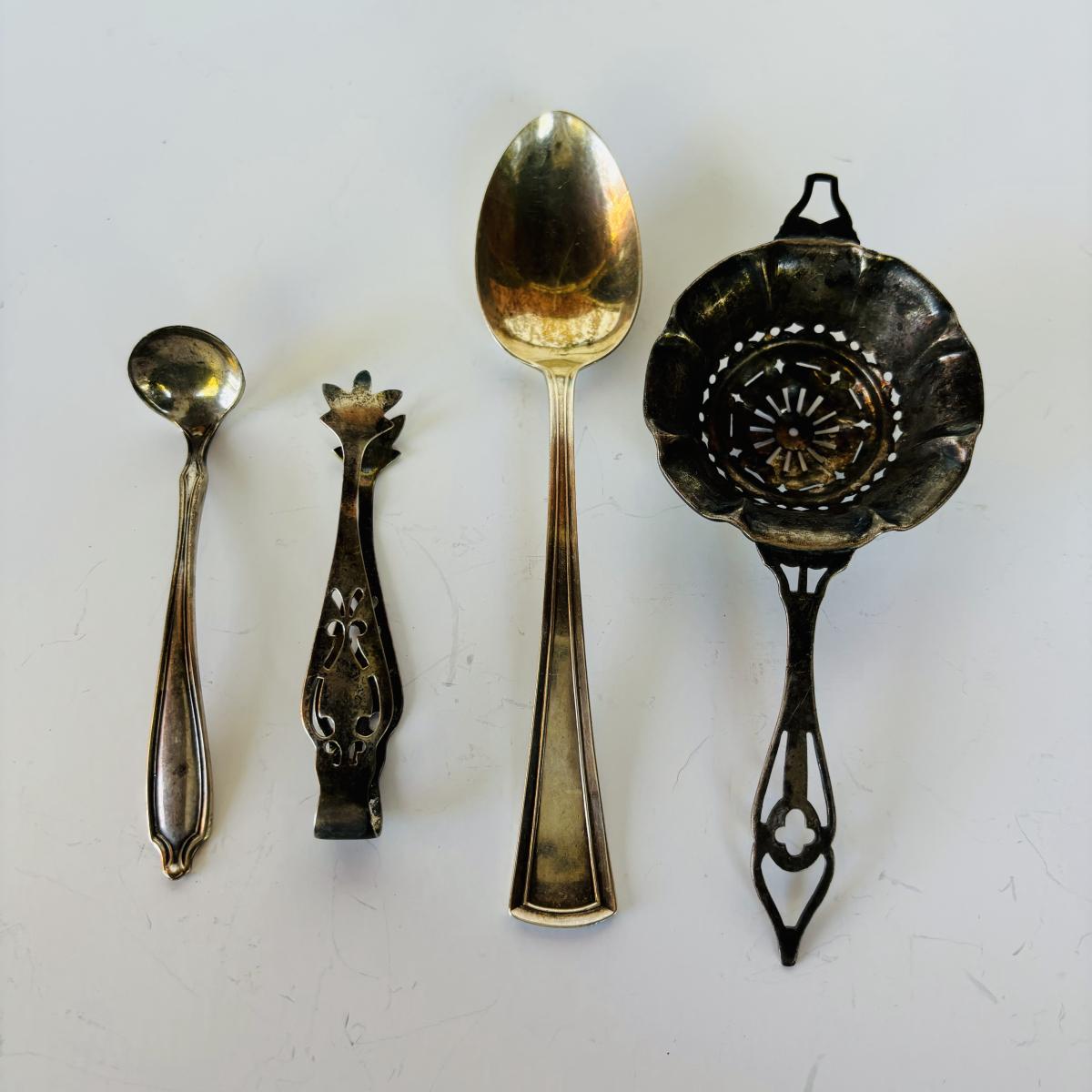 LOT 199: Sterling Silver Tea Strainer, Sugar Tongs, Condiment Spoon & Teaspoon Tw 52.12g & Aynsley Made in England Teacup