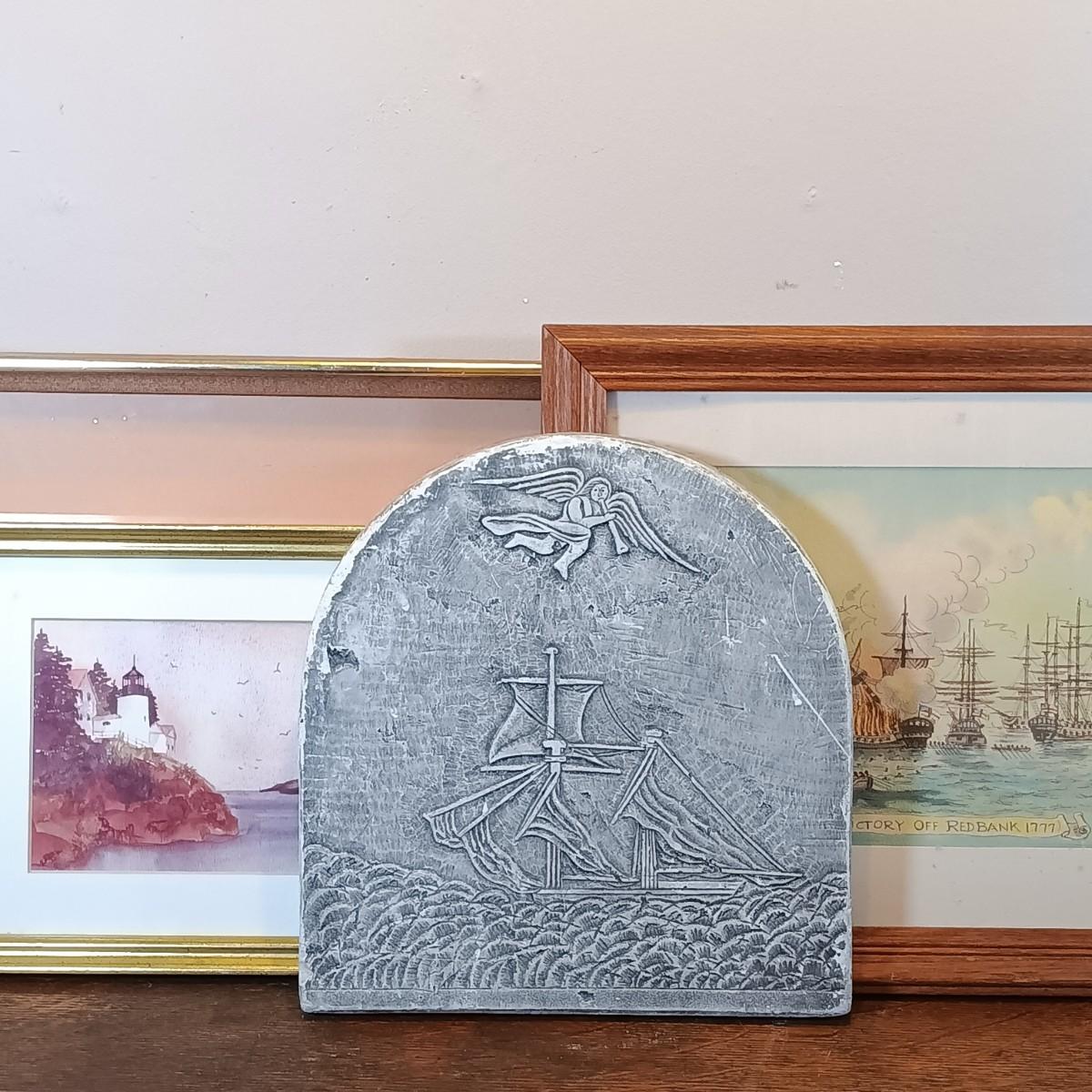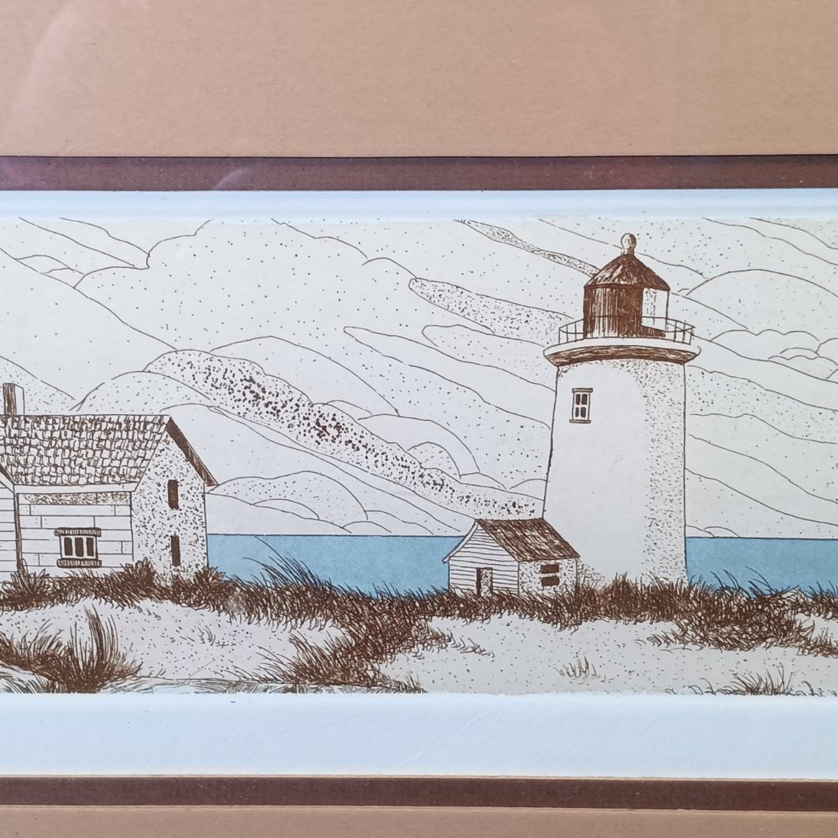 LOT 250: Chalkware Ship Plaque, Signed and Numbered James Jameson Lighthouse Etching, John Squillace Watercolor & J. L. Johnson Bass Harbor Light Signed Print
