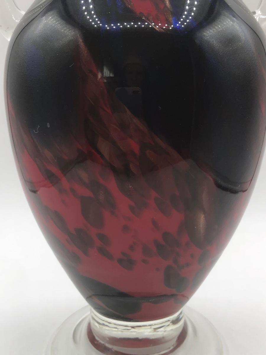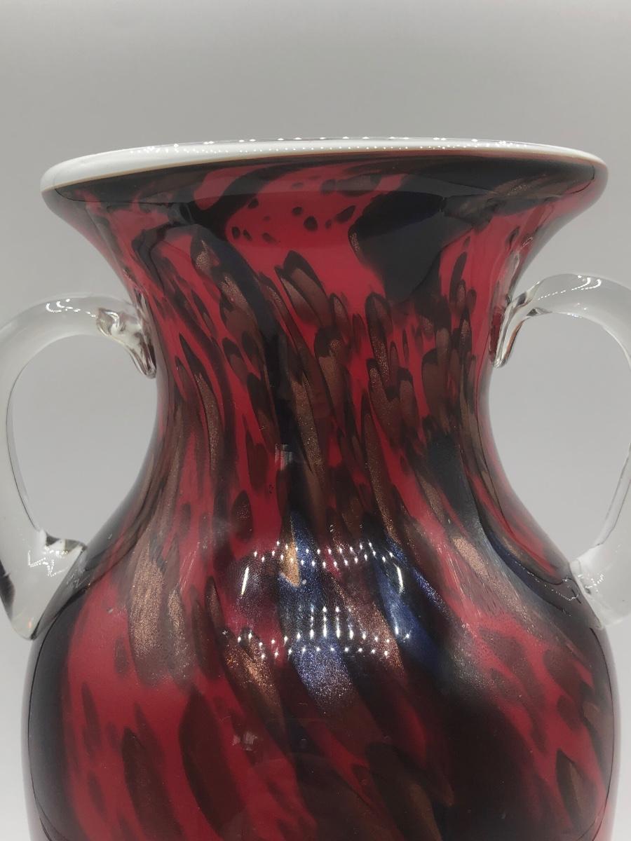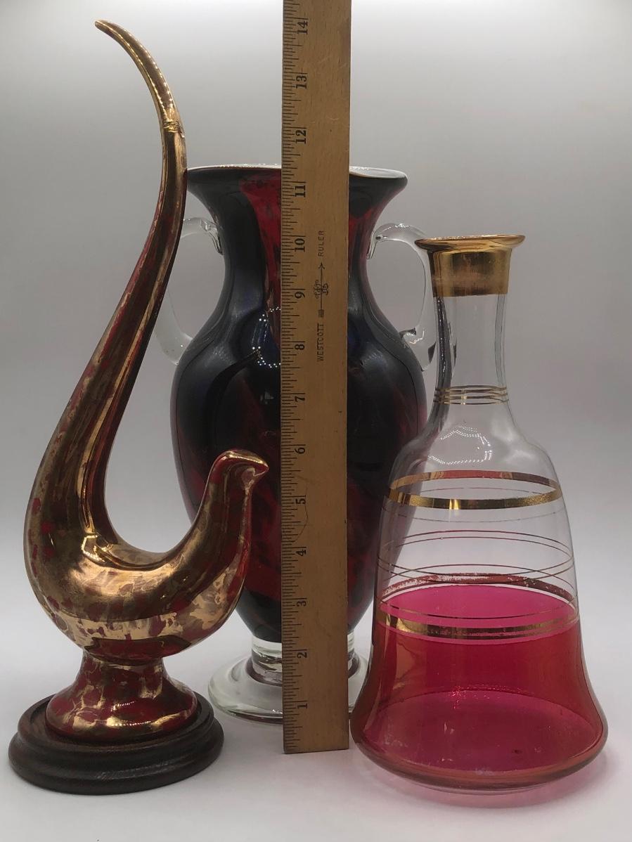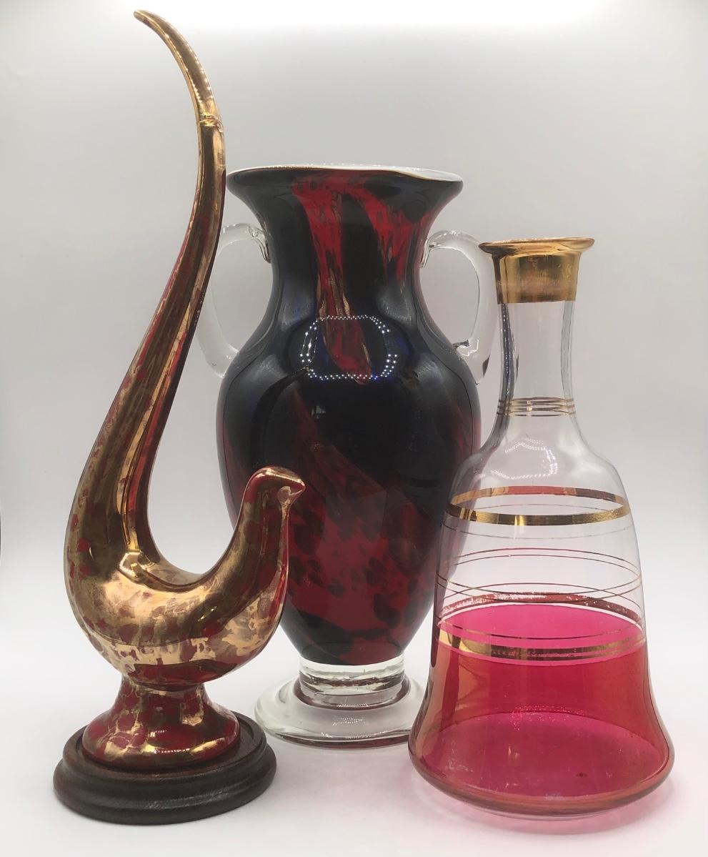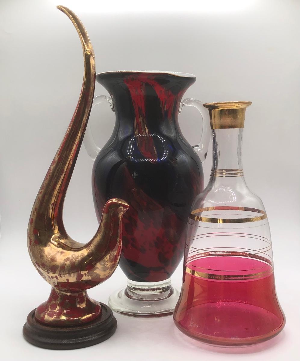 LOT 3K: Andrea by Sadek Ceramic Red & Gold Bird Sculpture, Murano Style Urn Art Glass Vase & Red/Clear Glass Decanter