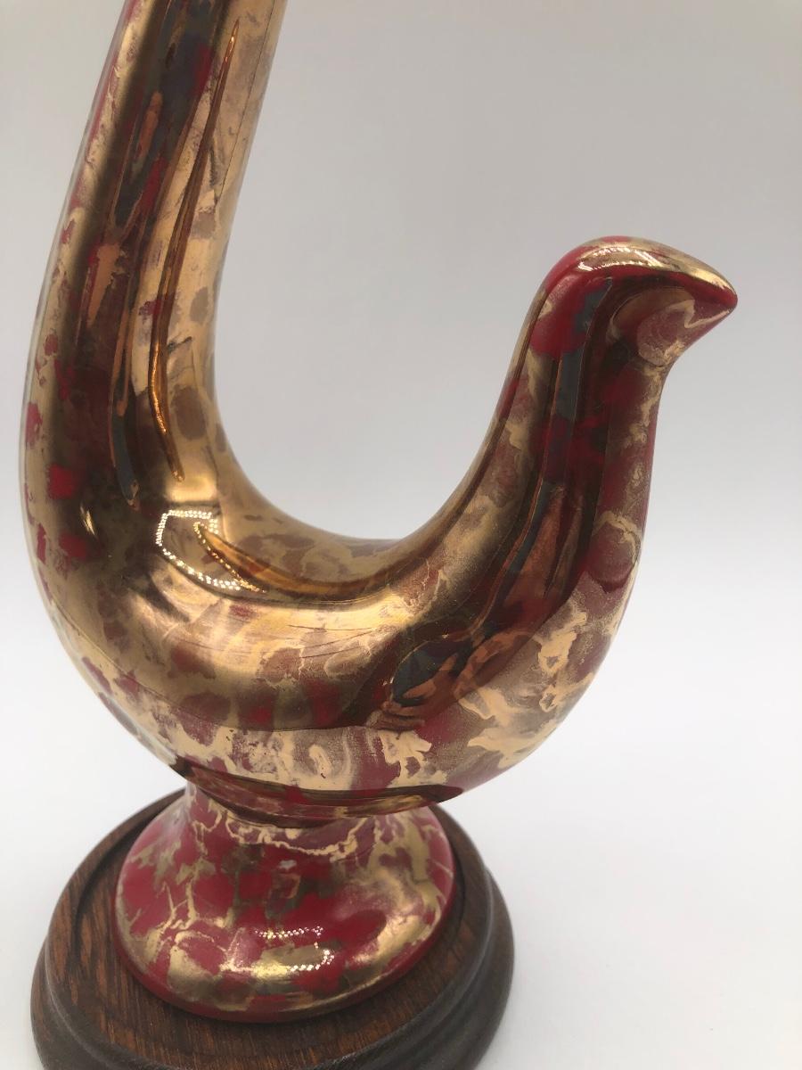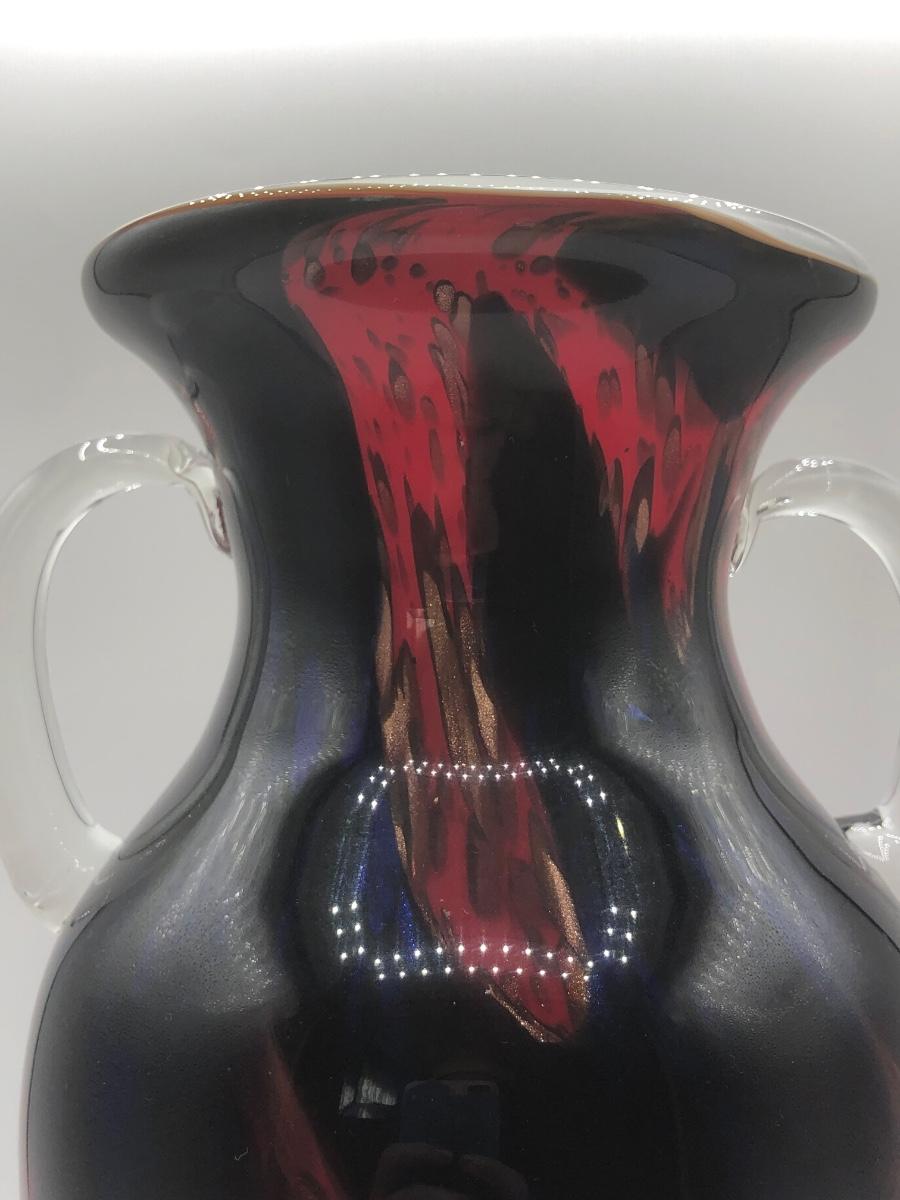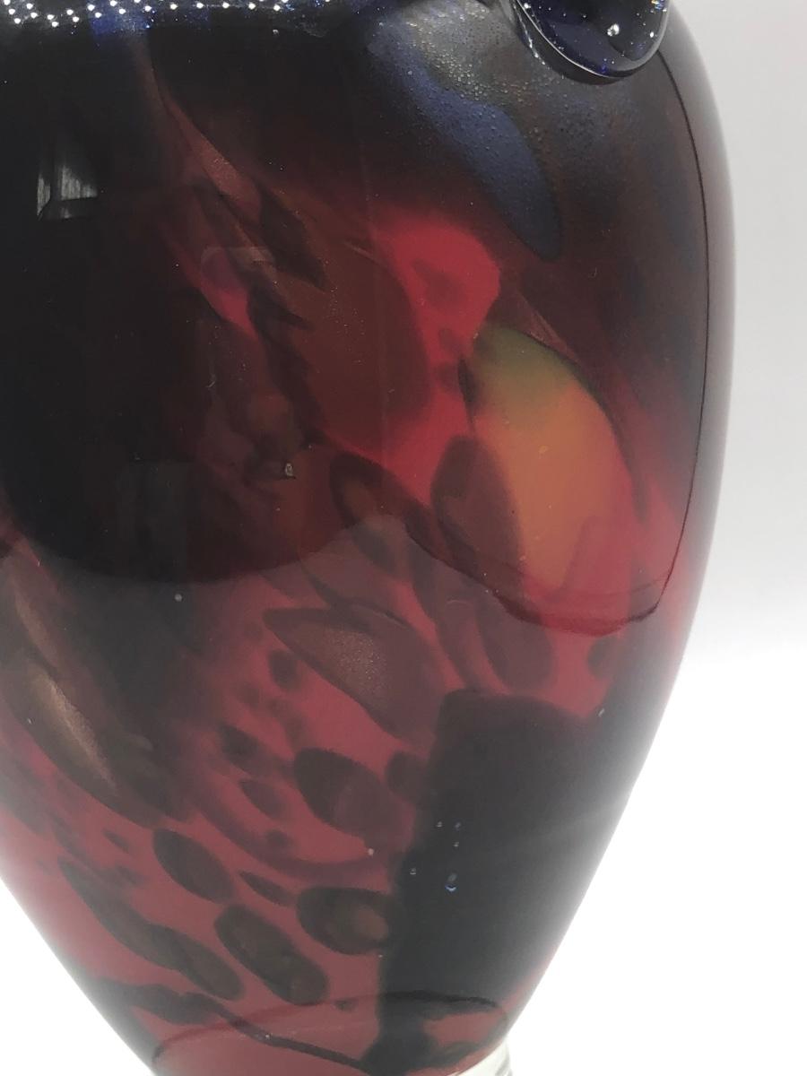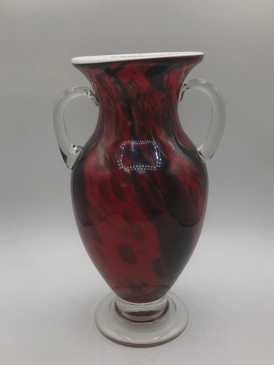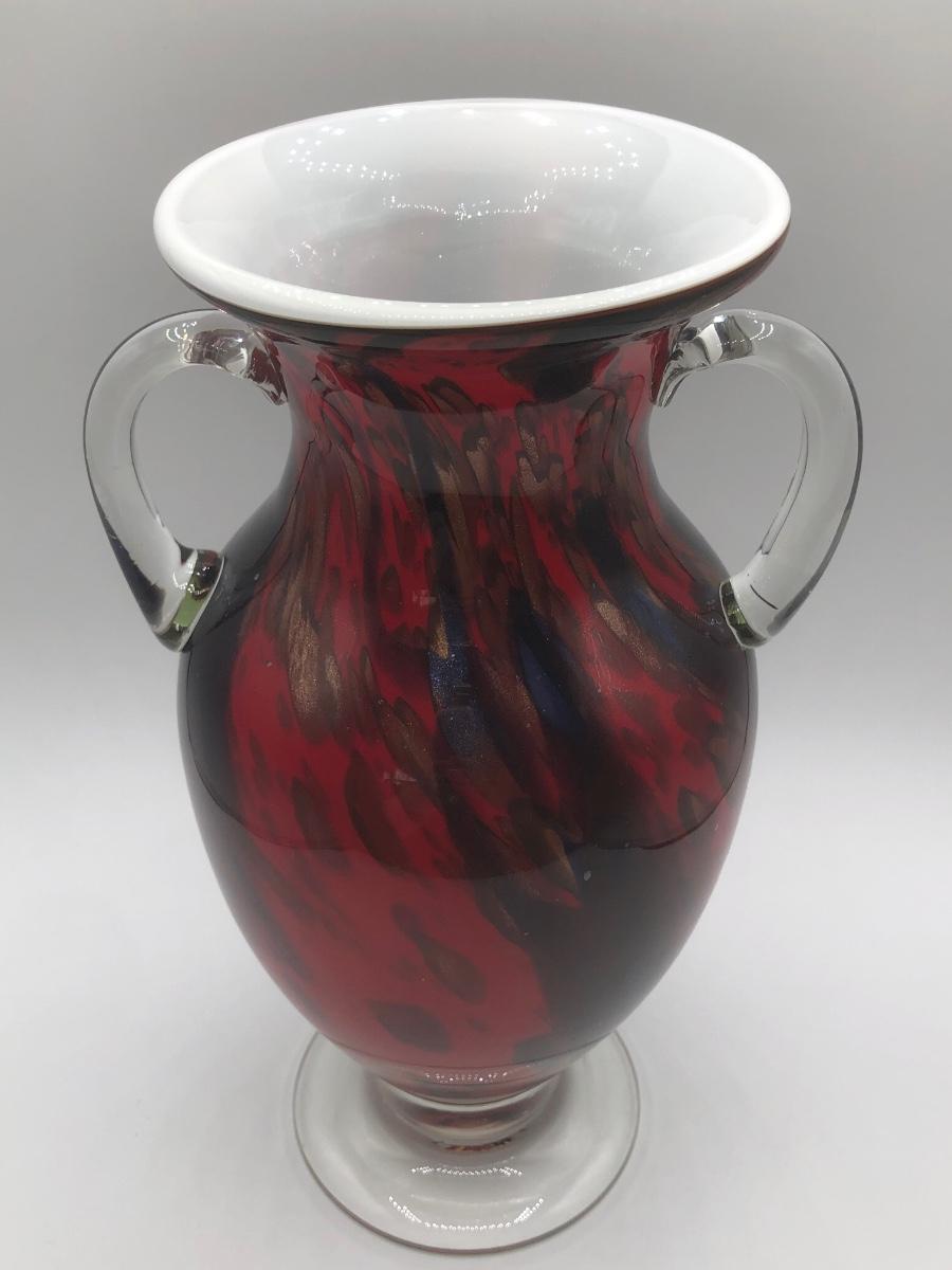 LOT 3K: Andrea by Sadek Ceramic Red & Gold Bird Sculpture, Murano Style Urn Art Glass Vase & Red/Clear Glass Decanter