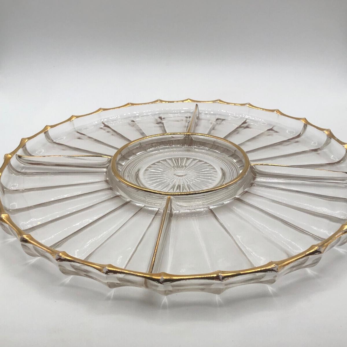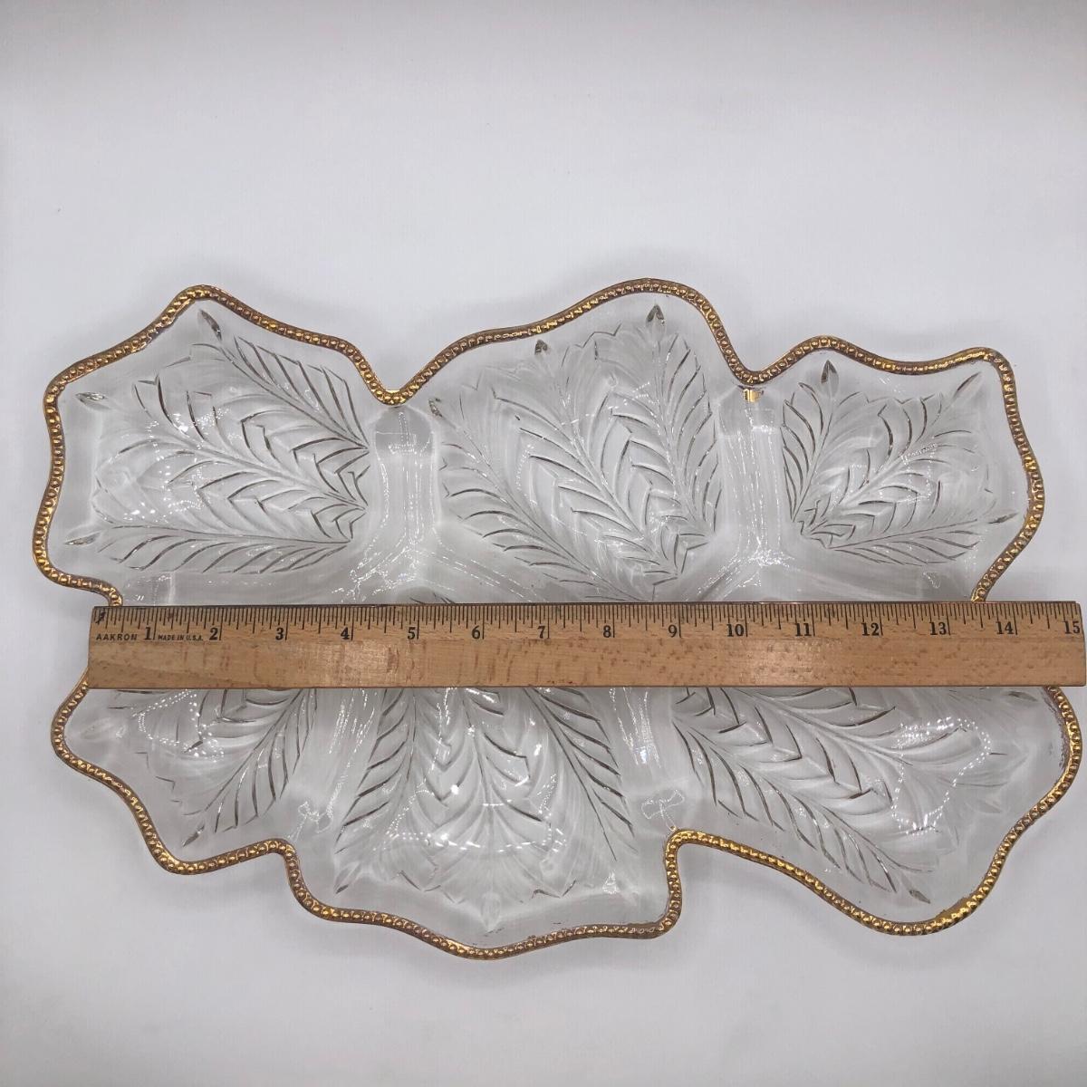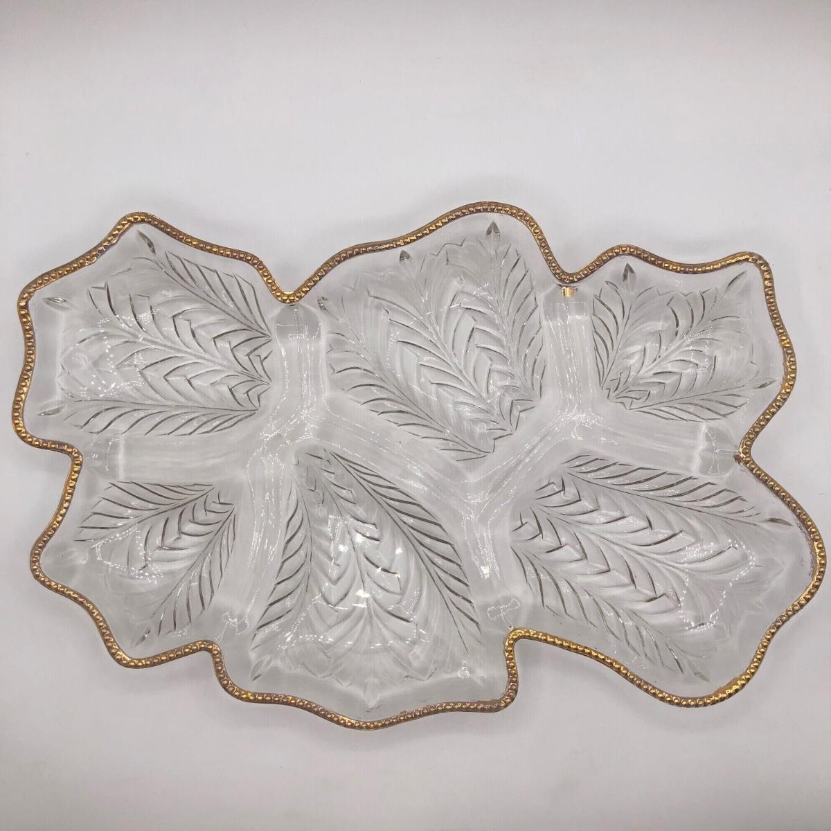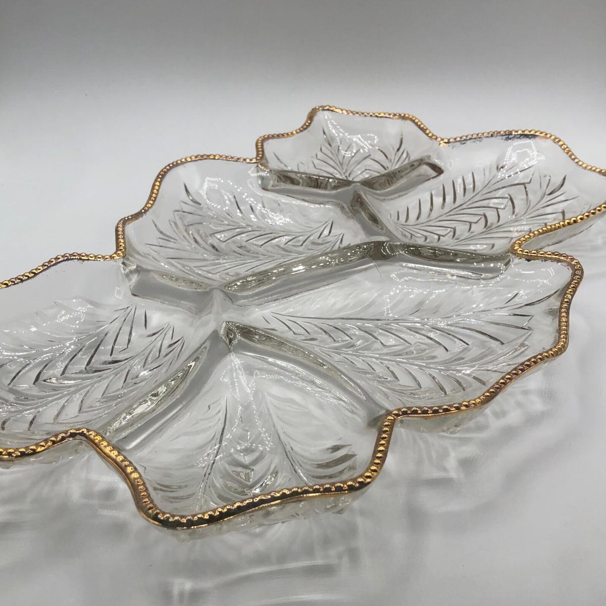 LOT 7K: Vintage Jeanette Glass Leaf Feather Serving Dish, Gold Rim Divided Appetizer Tray, Mini Spun Glass Teapot & More