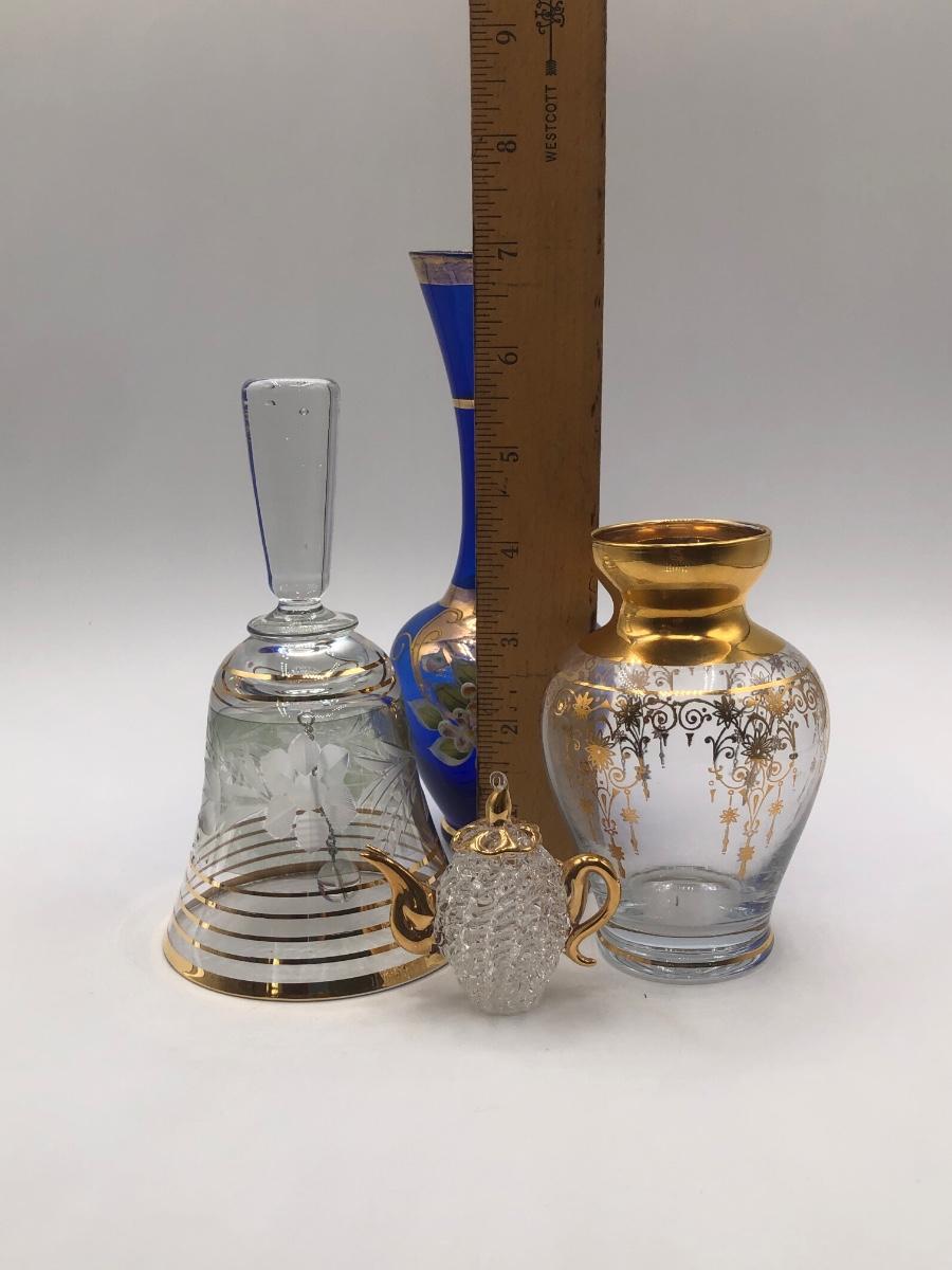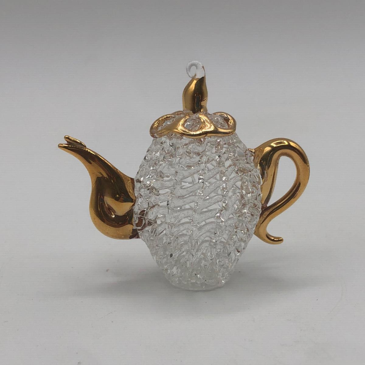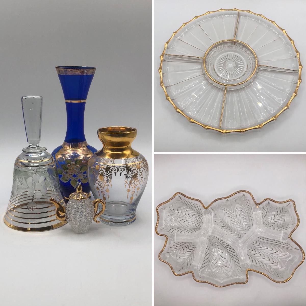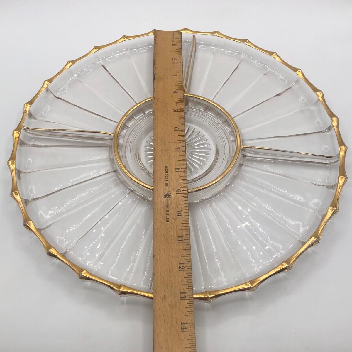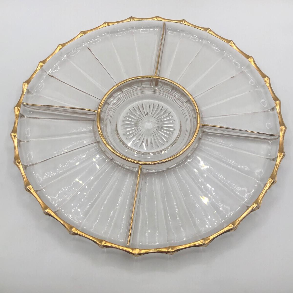 LOT 7K: Vintage Jeanette Glass Leaf Feather Serving Dish, Gold Rim Divided Appetizer Tray, Mini Spun Glass Teapot & More