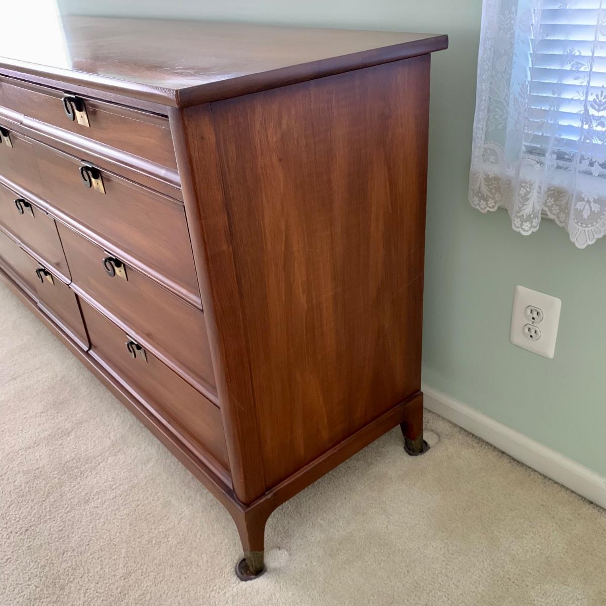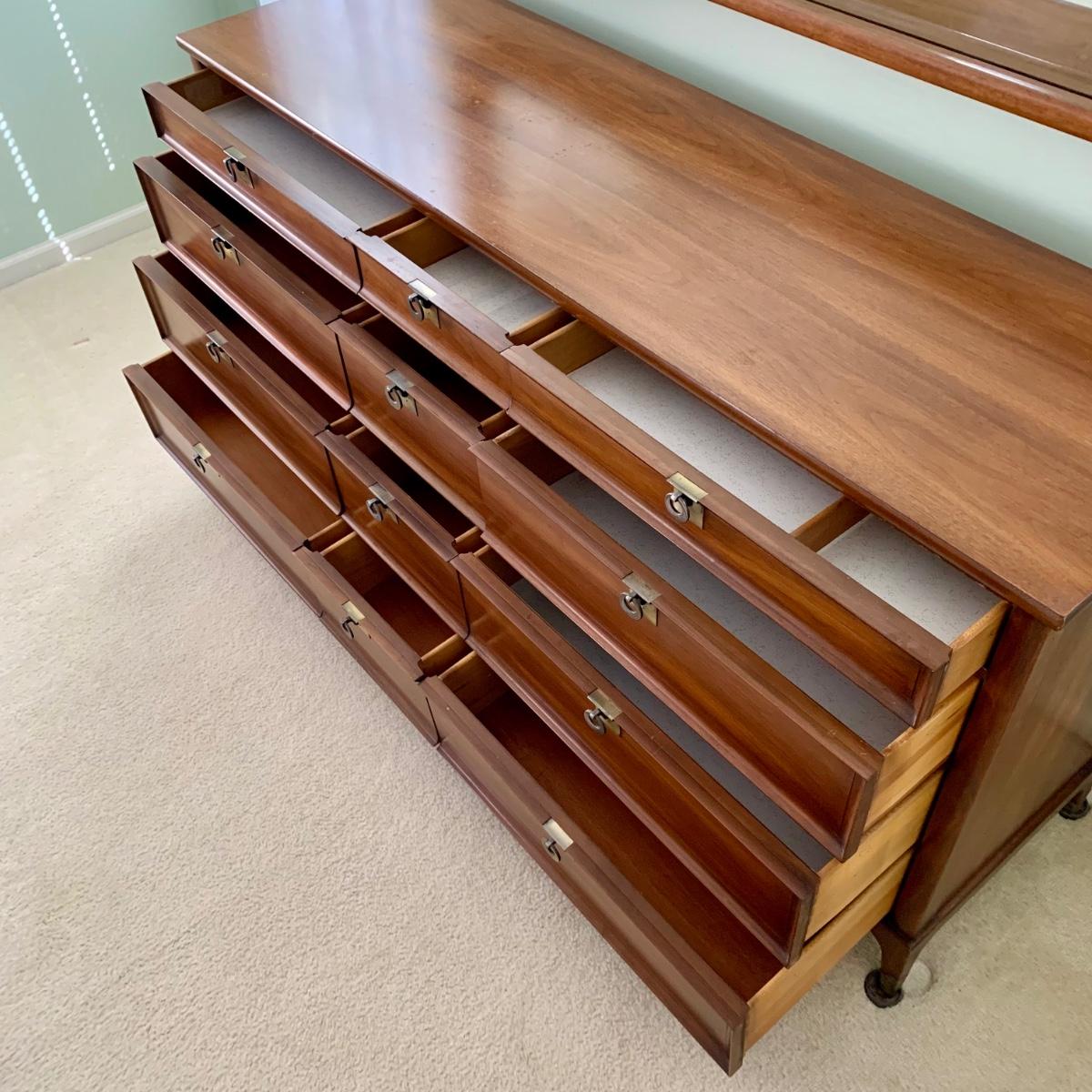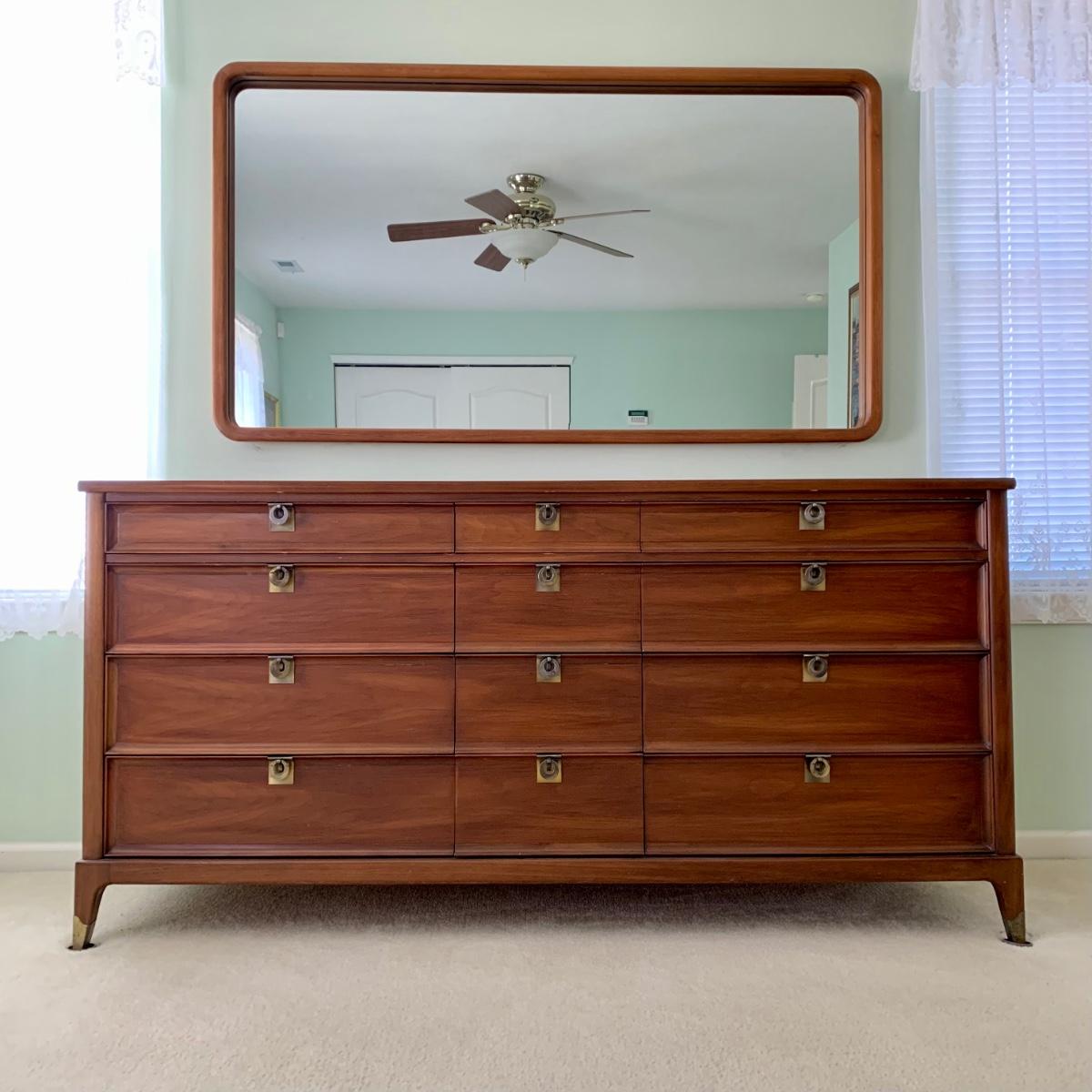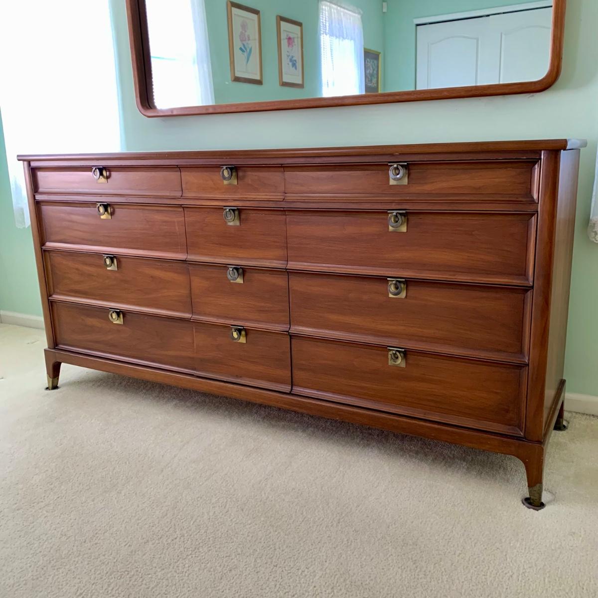 LOT 41 M: Vintage White Furniture Co. MCM 12 Drawer Walnut Dresser With Brass Ring Pull Handles & Matching Walnut Mirror
