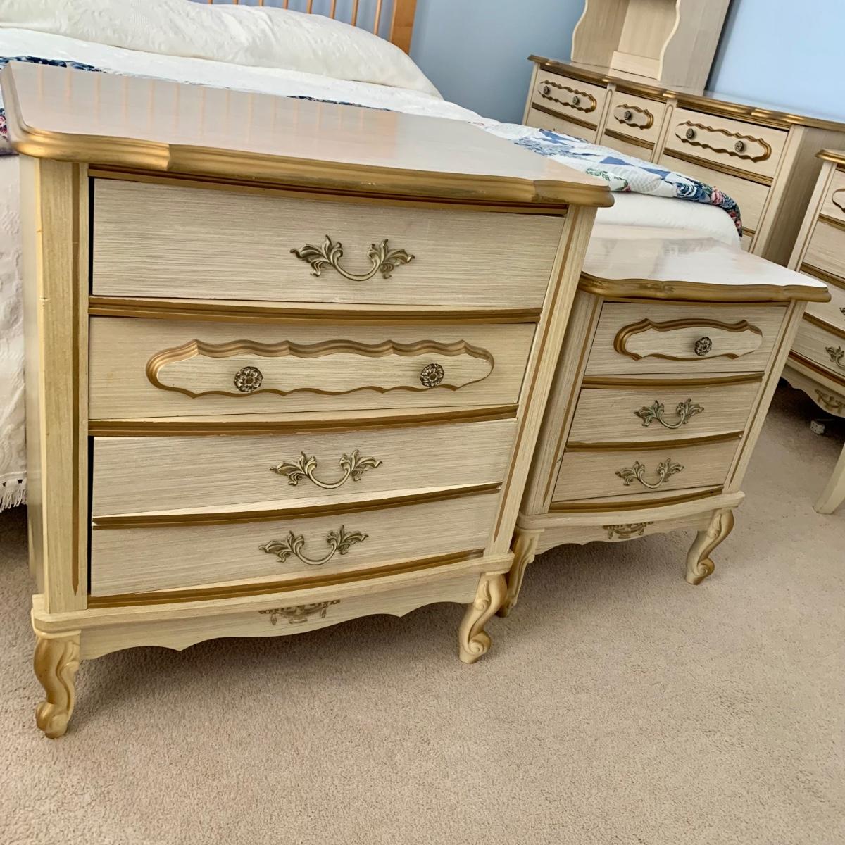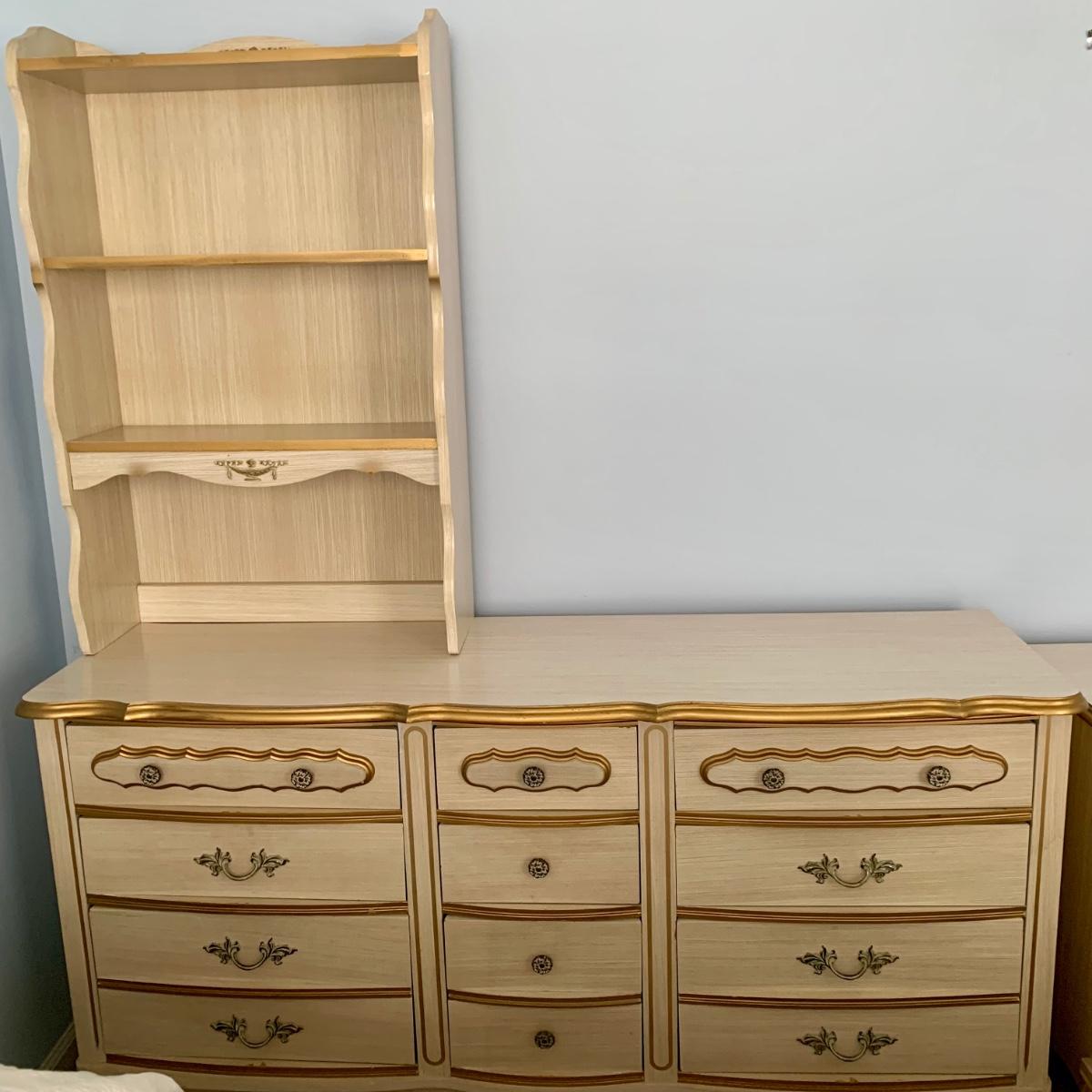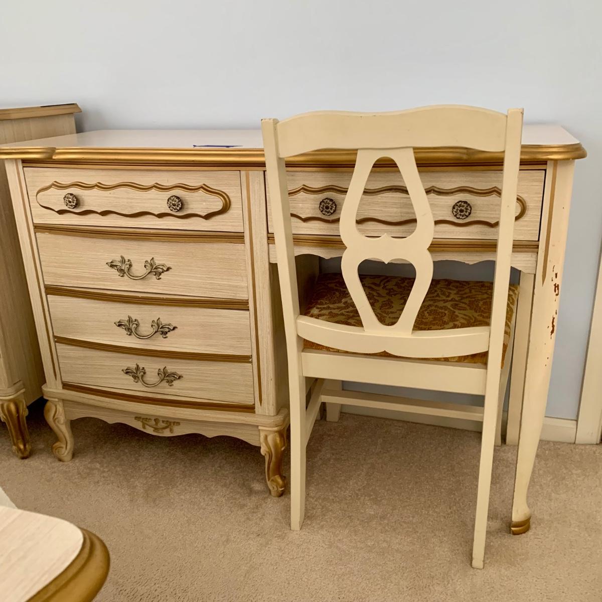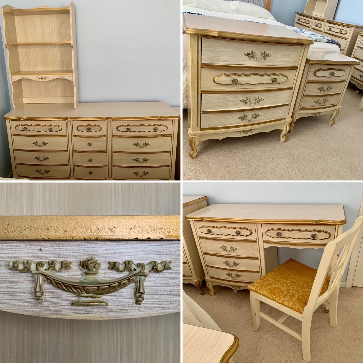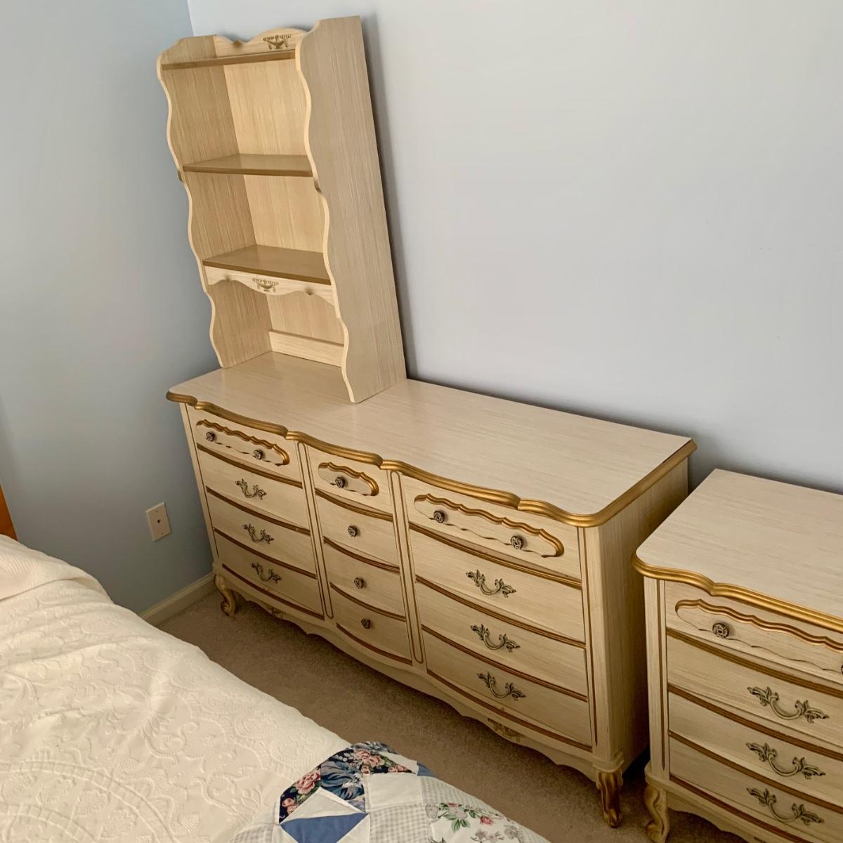 LOT 53 B: Sears "Bonnet" French Provincial Bedroom Set: 9 Drawer Dresser, Unattached 3 Tier Shelving Unit topper gor desk, 4 Drawer Desk w/ Chair, & 2 Drawer & 3 Drawer Side Tables/ Nightstands