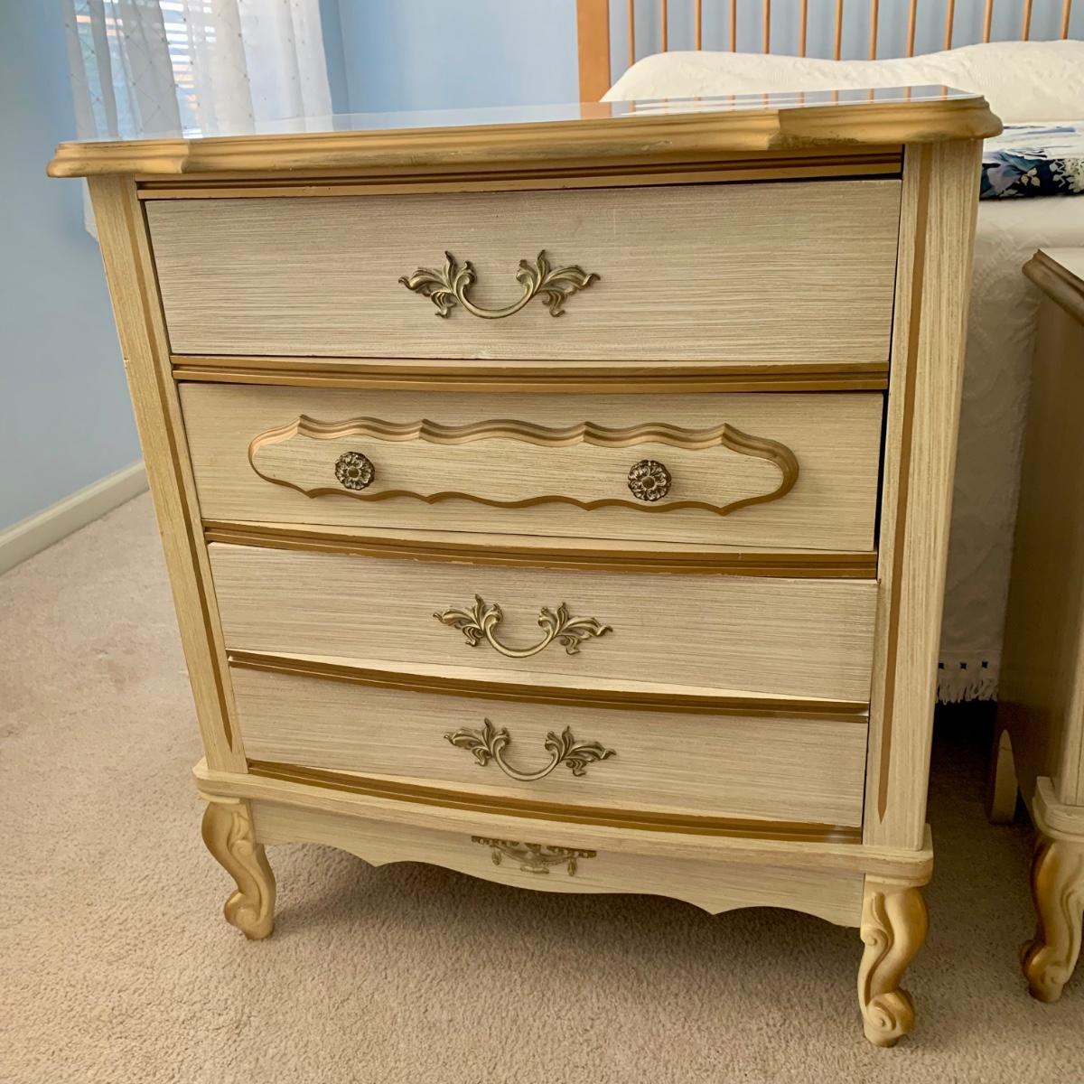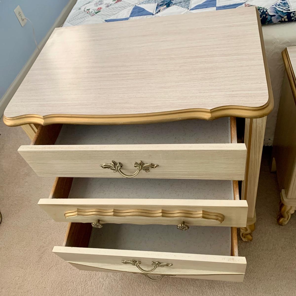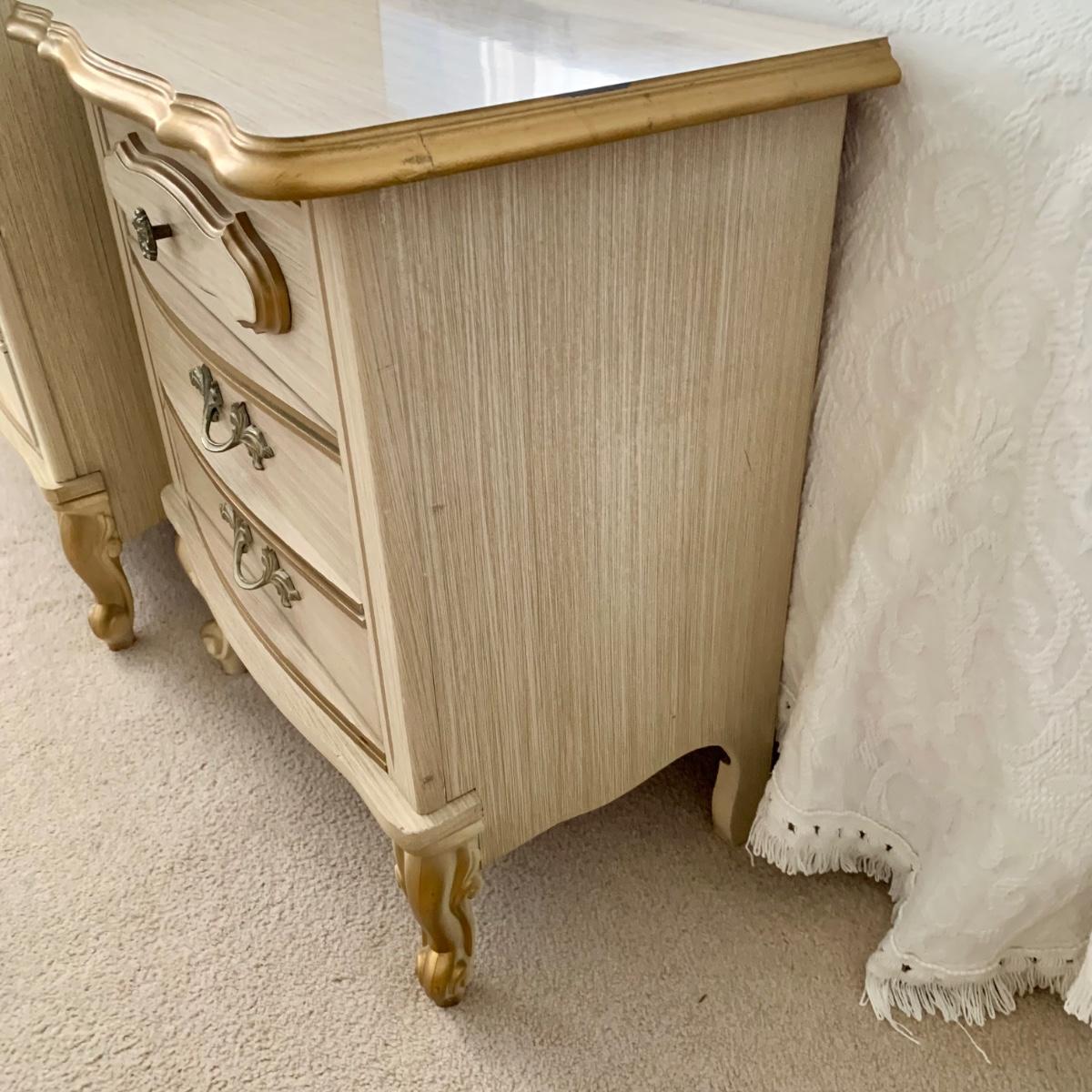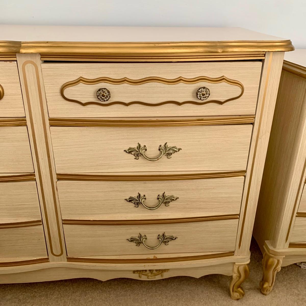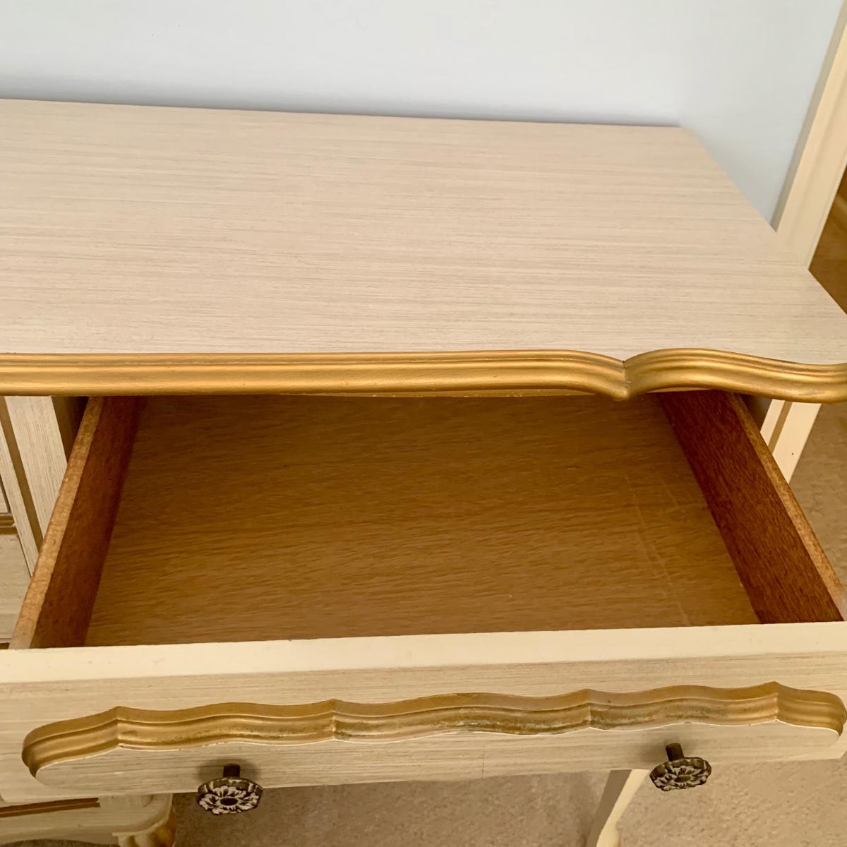LOT 53 B: Sears "Bonnet" French Provincial Bedroom Set: 9 Drawer Dresser, Unattached 3 Tier Shelving Unit topper gor desk, 4 Drawer Desk w/ Chair, & 2 Drawer & 3 Drawer Side Tables/ Nightstands