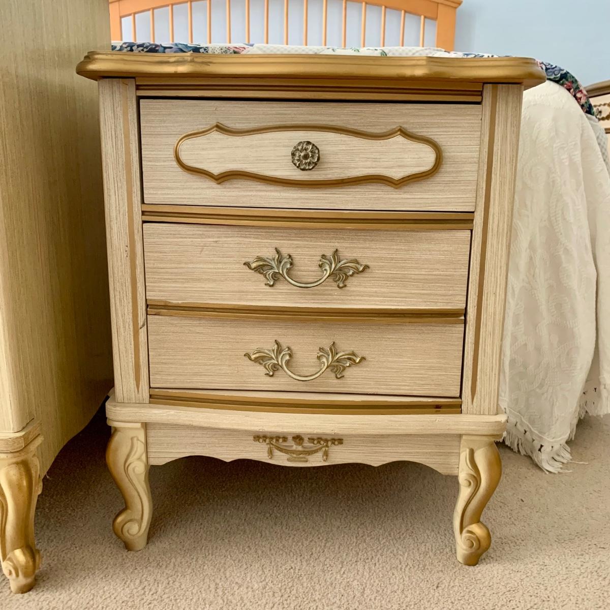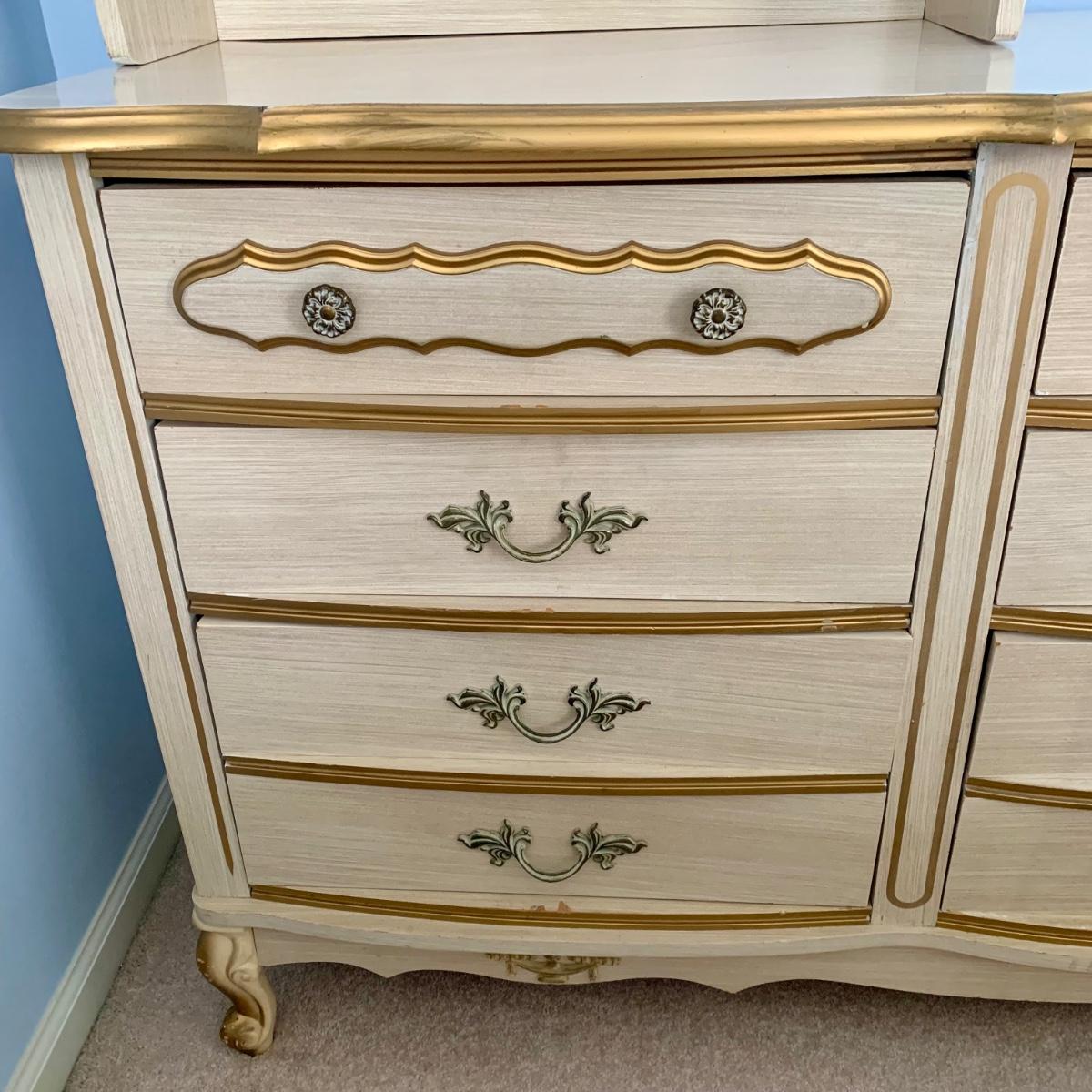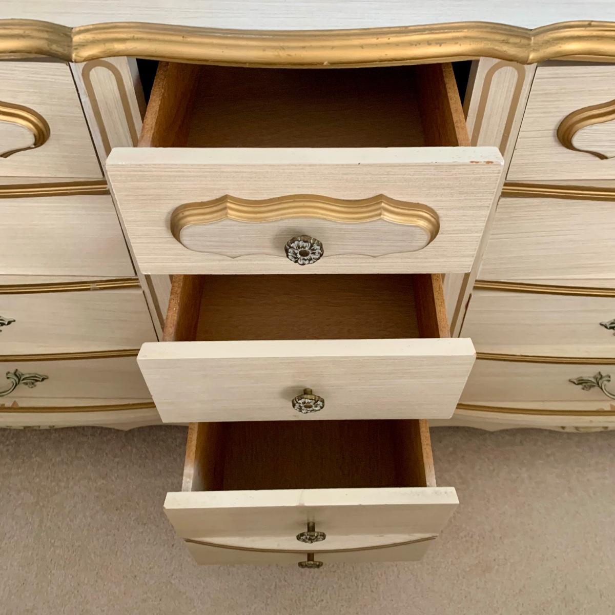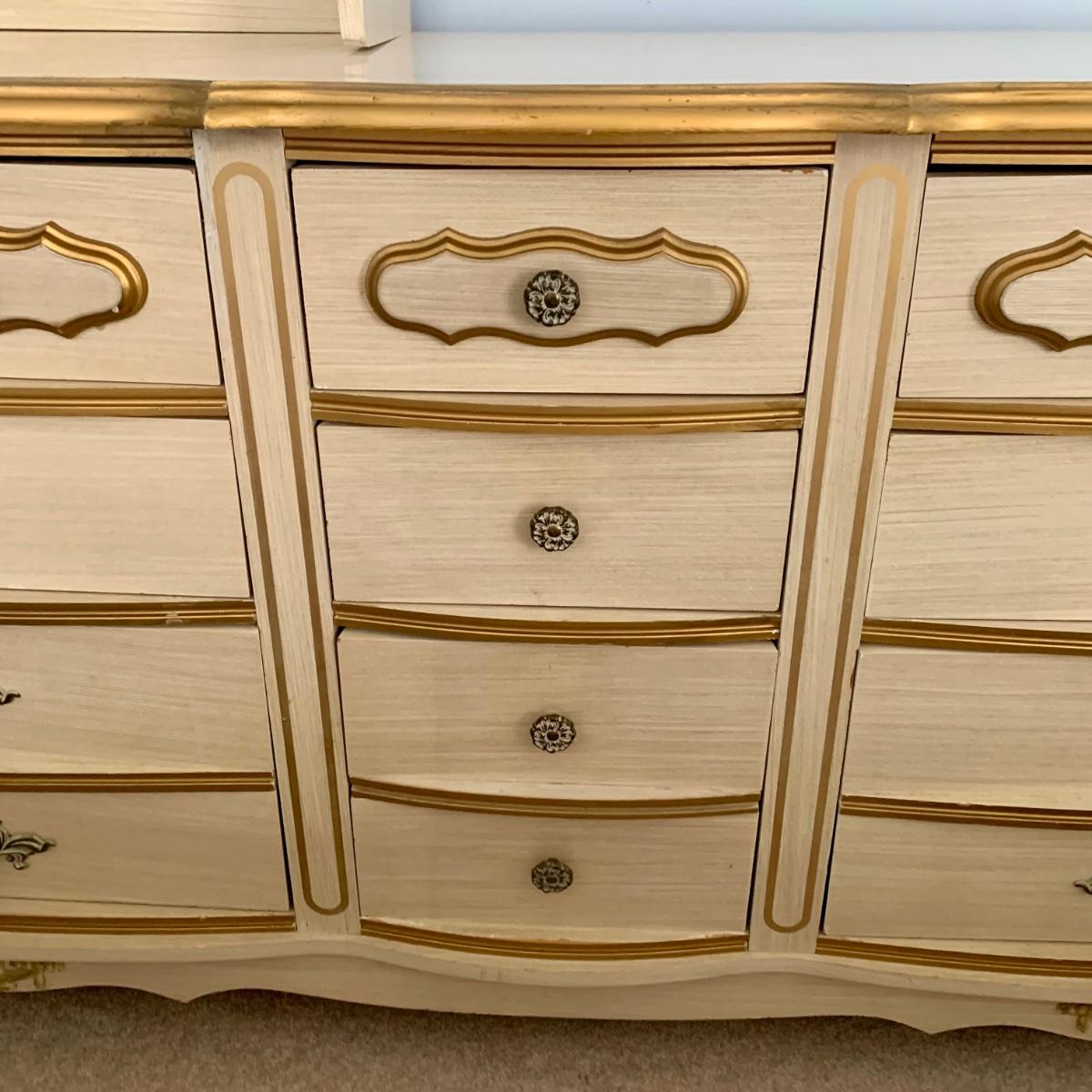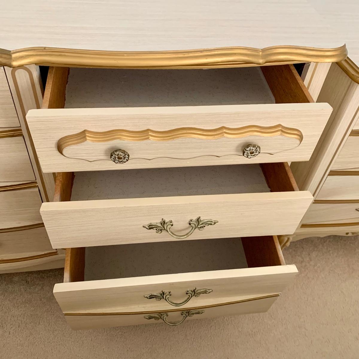 LOT 53 B: Sears "Bonnet" French Provincial Bedroom Set: 9 Drawer Dresser, Unattached 3 Tier Shelving Unit topper gor desk, 4 Drawer Desk w/ Chair, & 2 Drawer & 3 Drawer Side Tables/ Nightstands