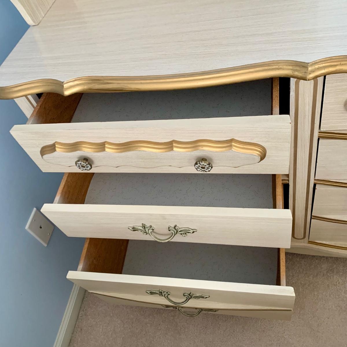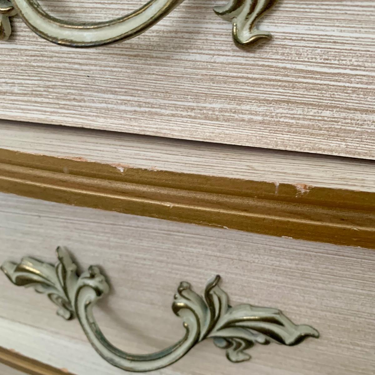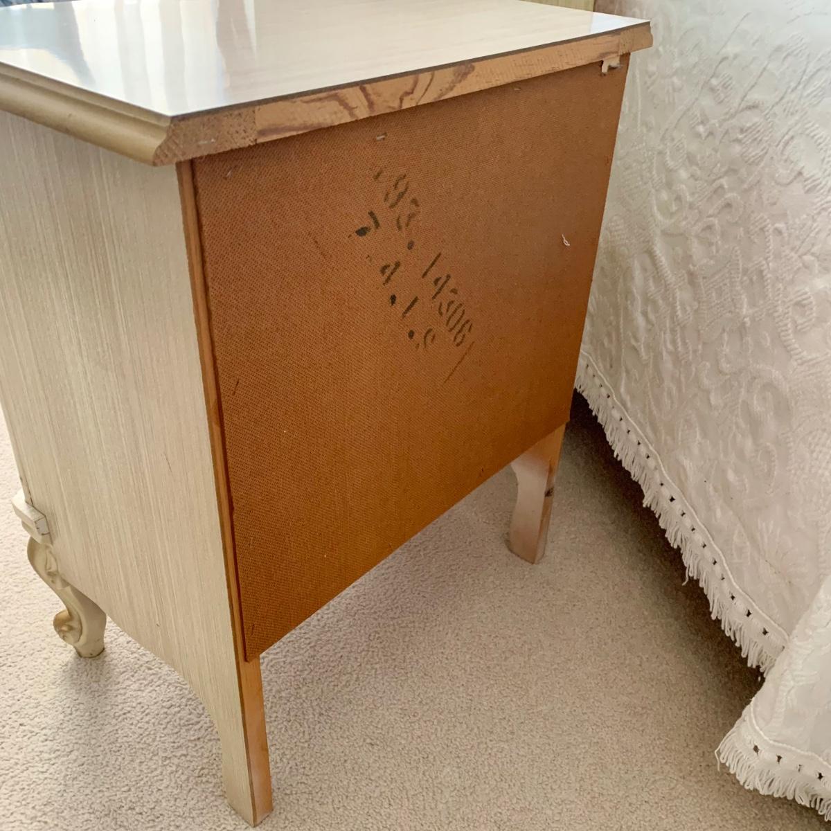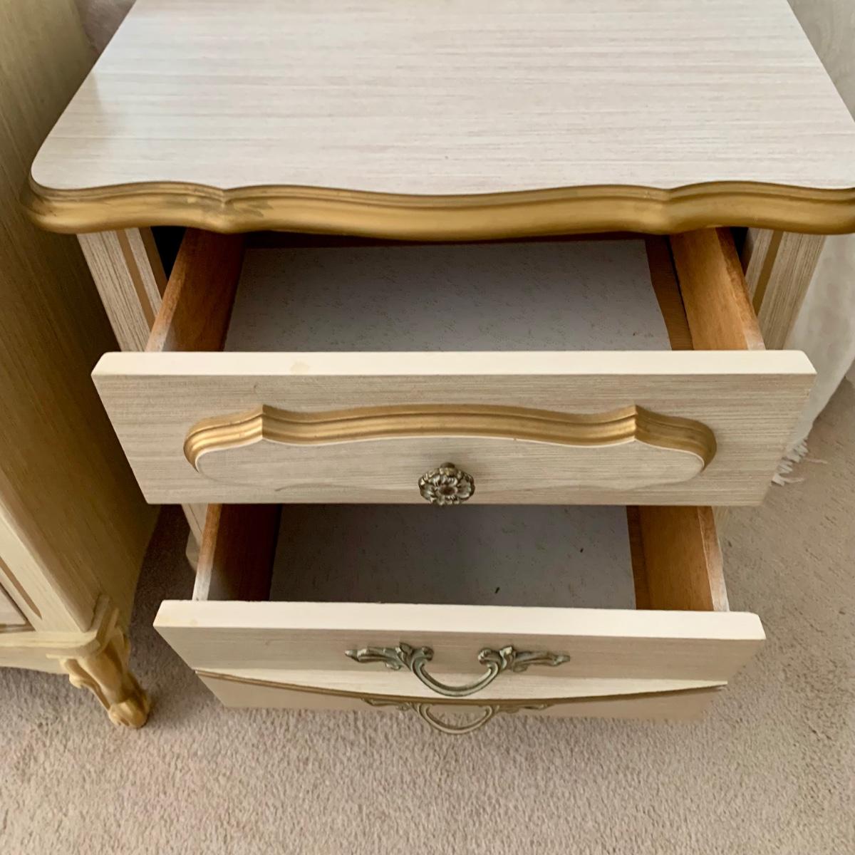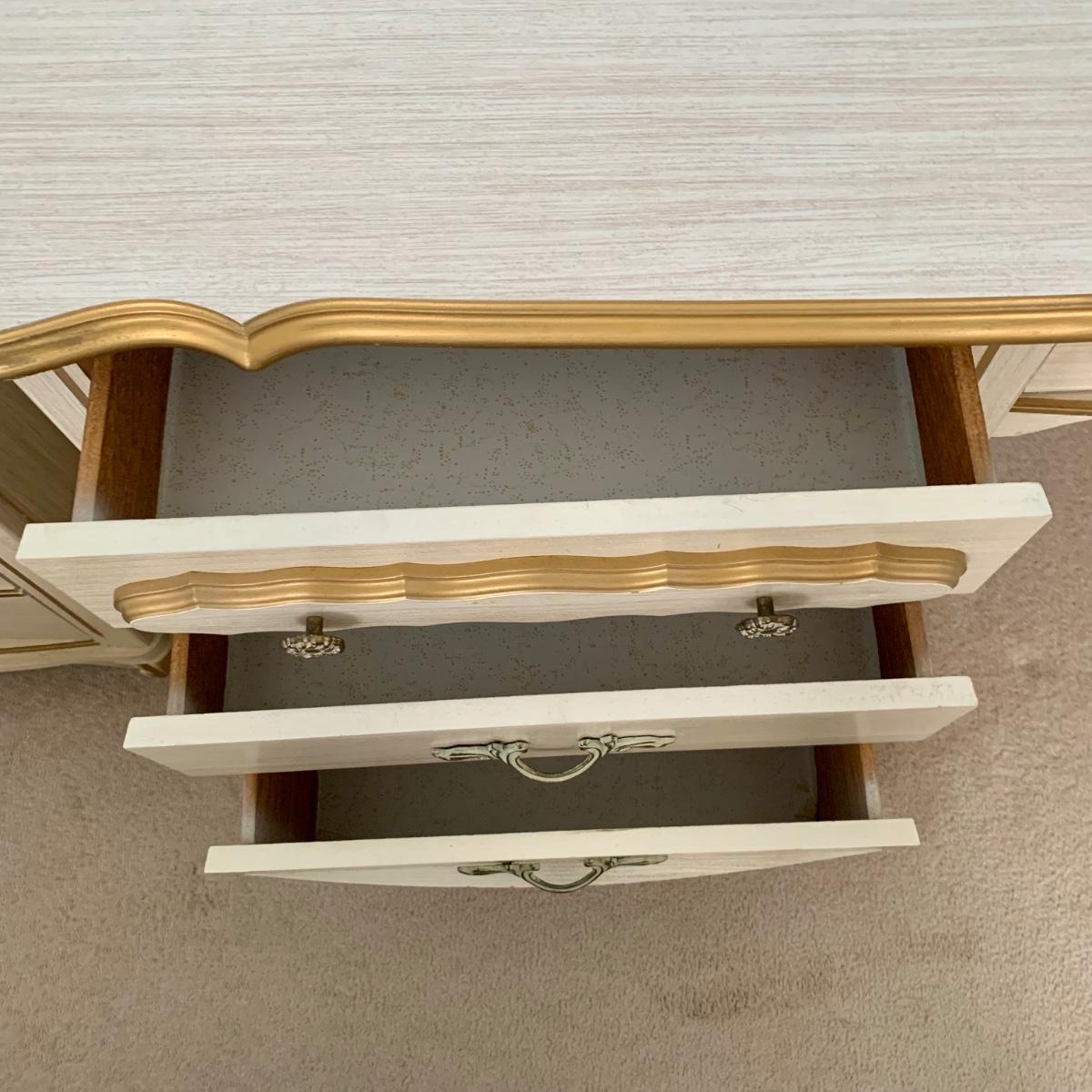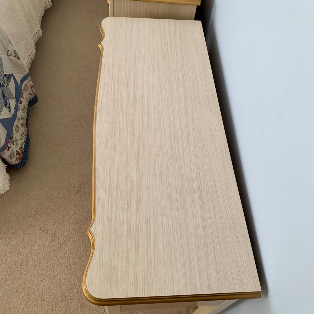 LOT 53 B: Sears "Bonnet" French Provincial Bedroom Set: 9 Drawer Dresser, Unattached 3 Tier Shelving Unit topper gor desk, 4 Drawer Desk w/ Chair, & 2 Drawer & 3 Drawer Side Tables/ Nightstands