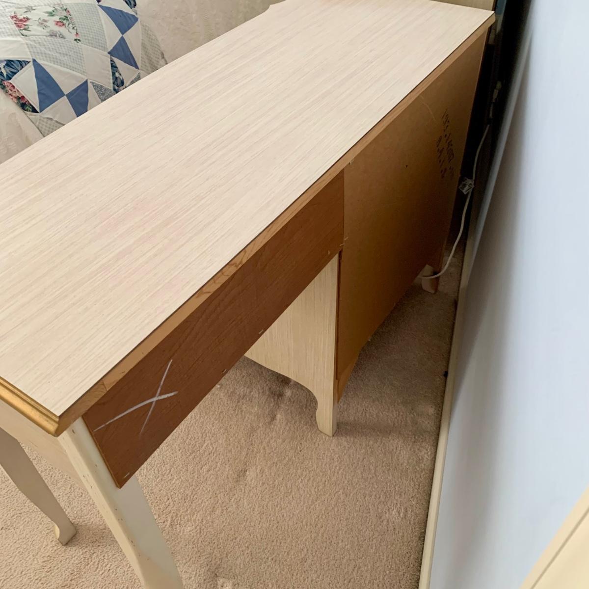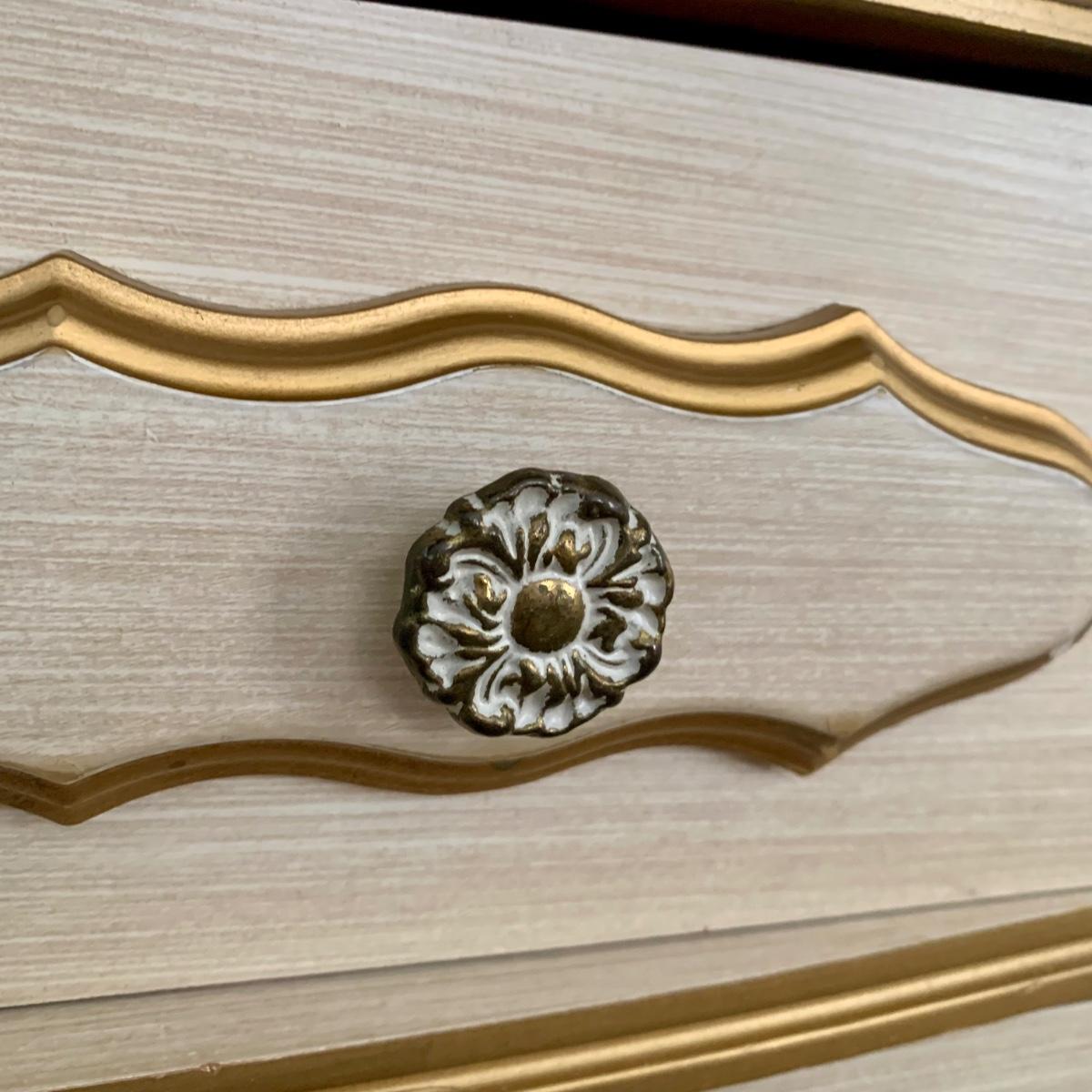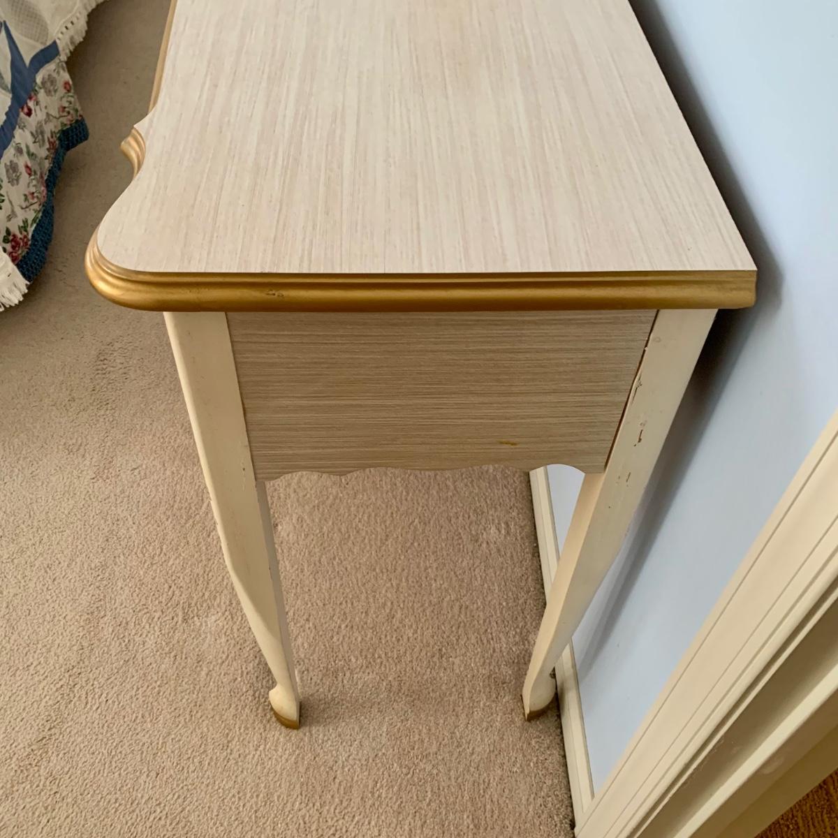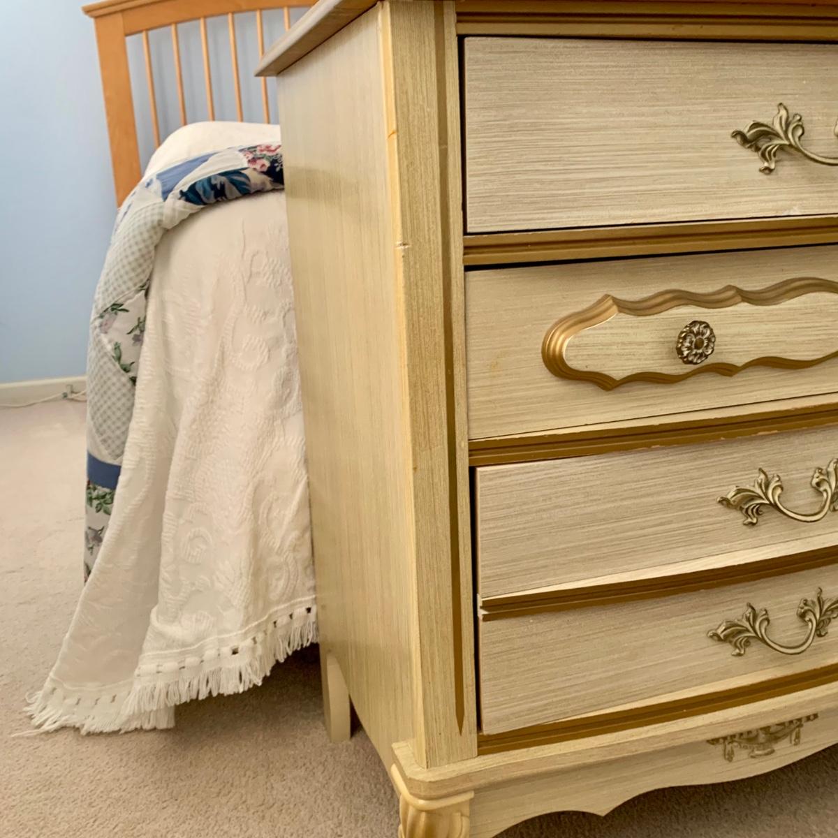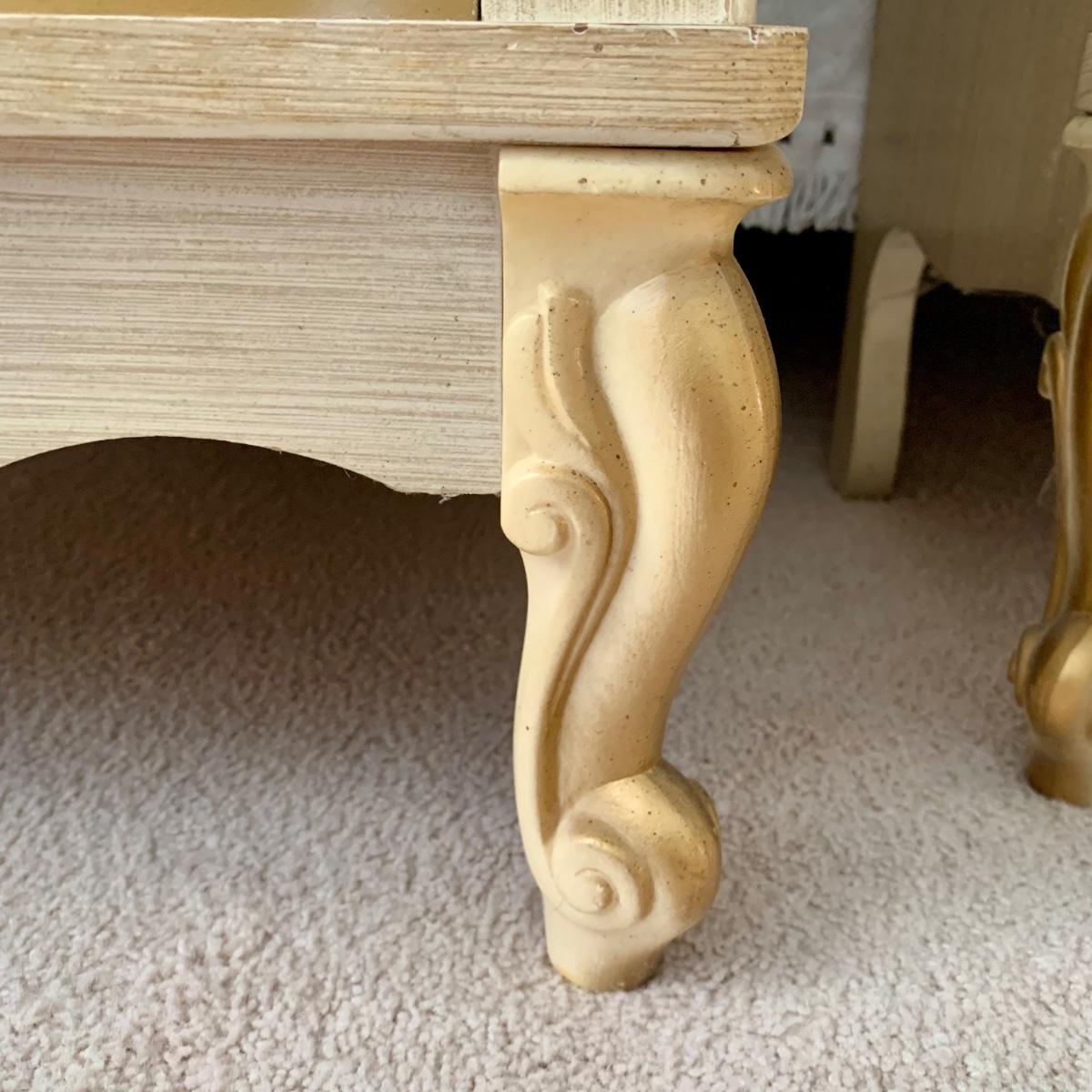 LOT 53 B: Sears "Bonnet" French Provincial Bedroom Set: 9 Drawer Dresser, Unattached 3 Tier Shelving Unit topper gor desk, 4 Drawer Desk w/ Chair, & 2 Drawer & 3 Drawer Side Tables/ Nightstands