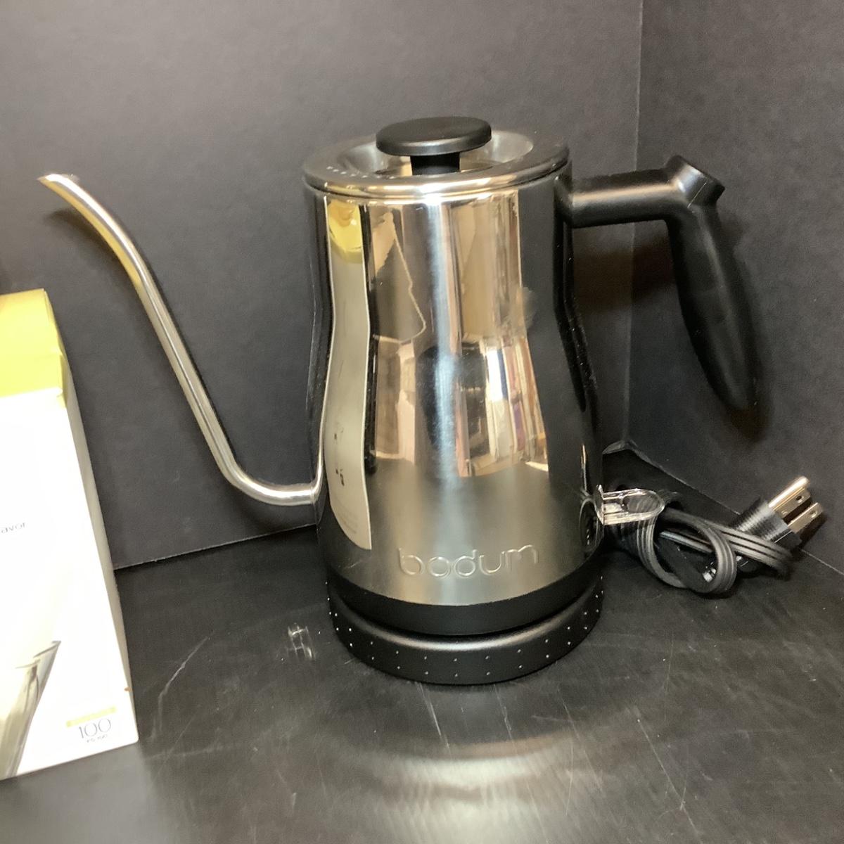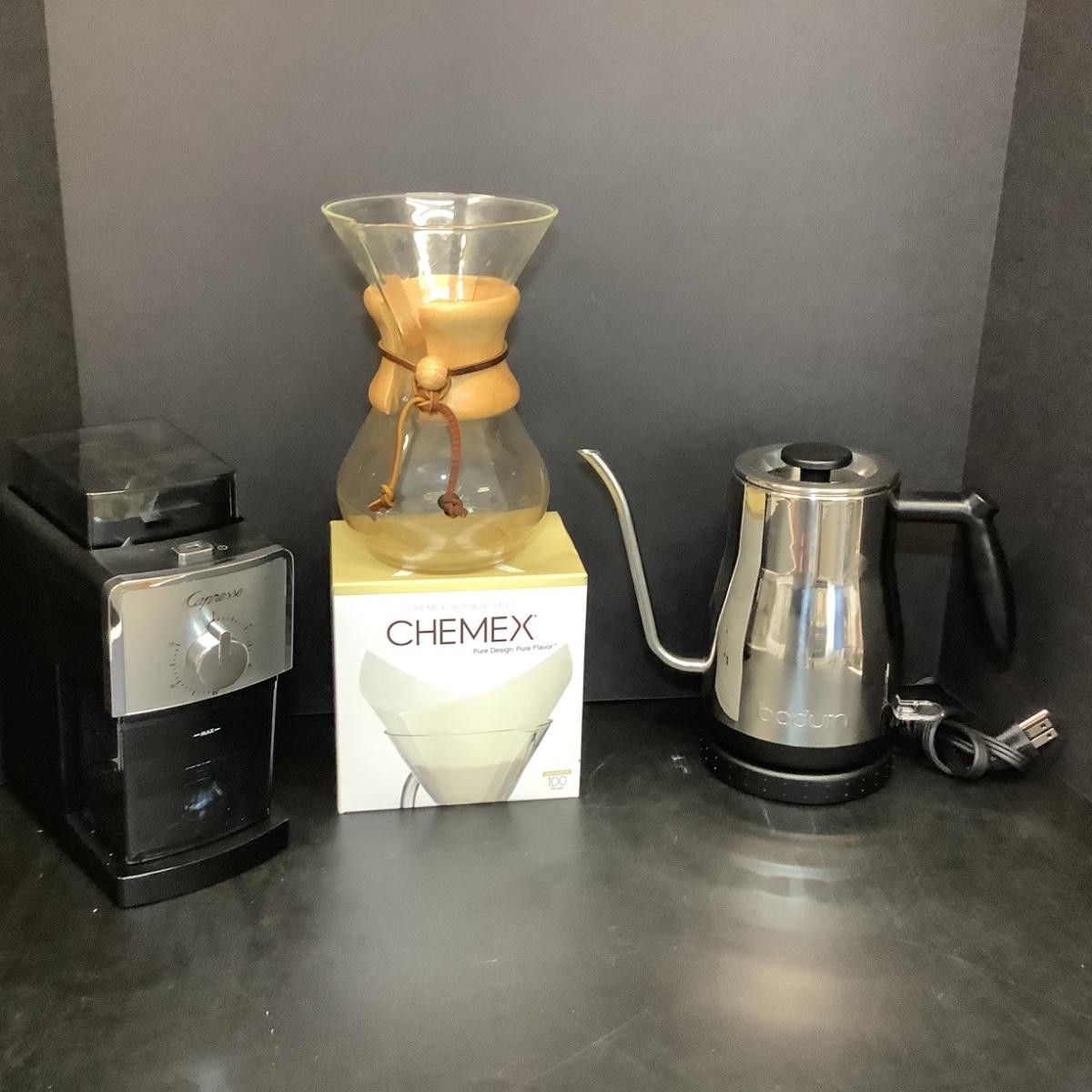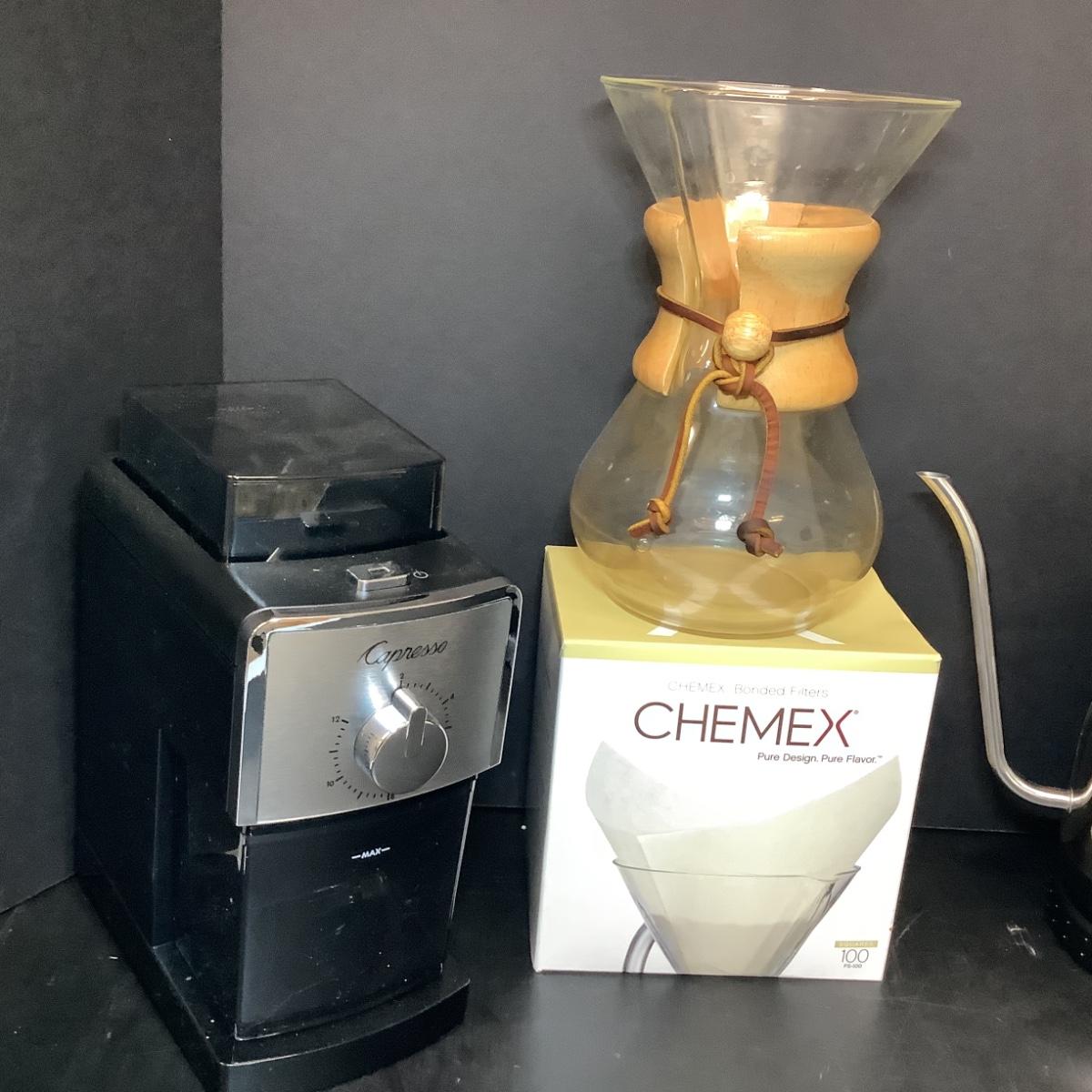 Lot 1082. Chemex Carafe Coffee Maker, Coffee Grinder, Bodum Bistro Gooseneck Water Kettle