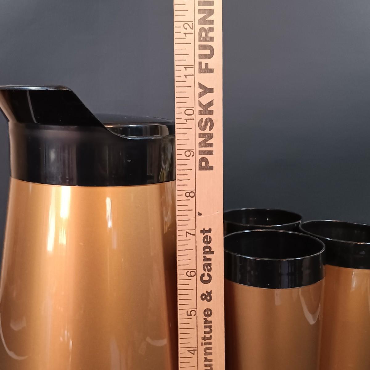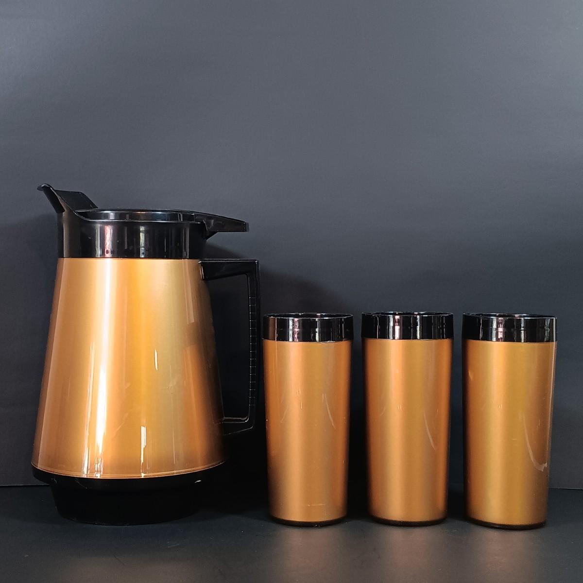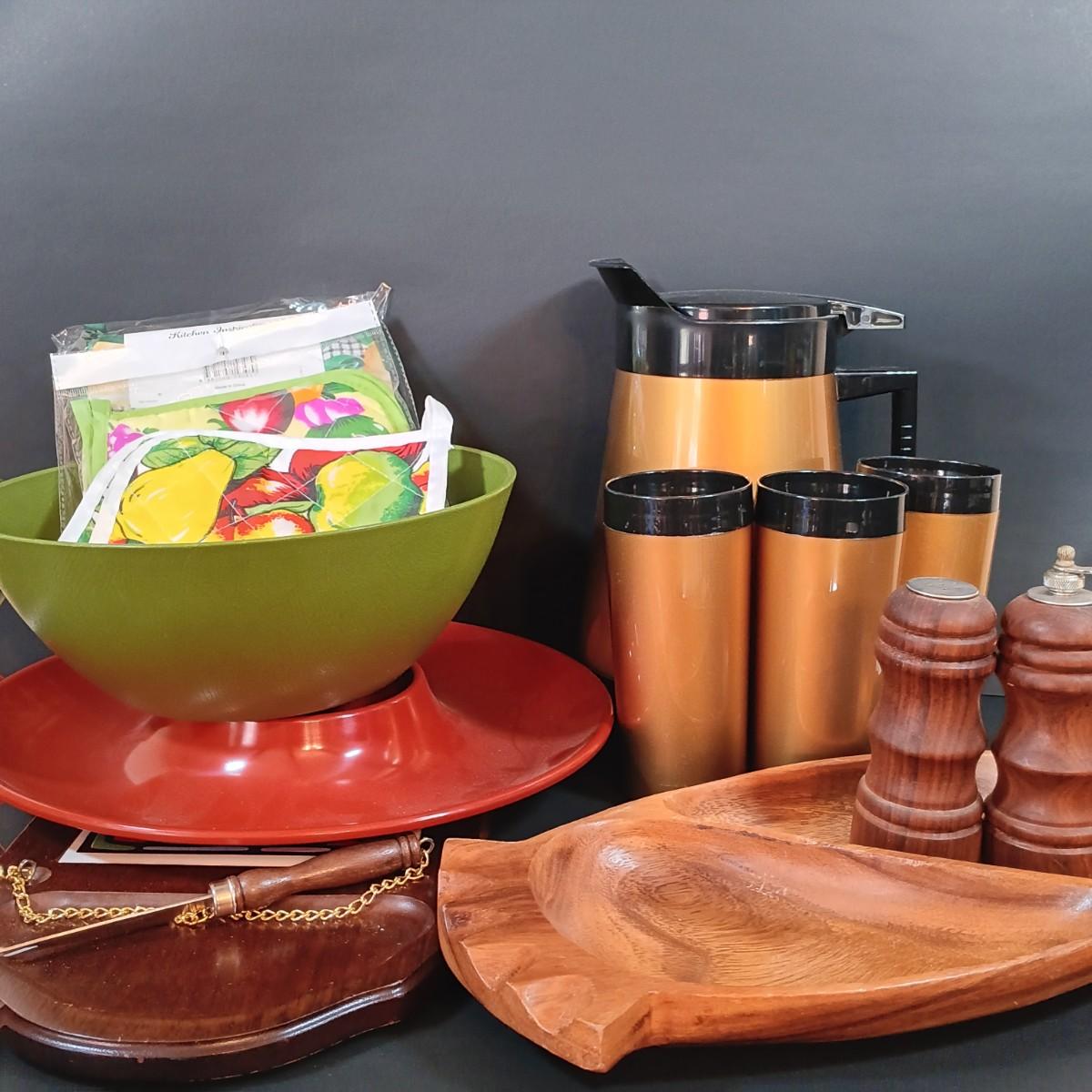 LOT 21: MCM Vintage ThermoServ Insulated Carafe and Cups, Tundra Cheese Board and Knife, Monkey Pod Serving Bowl & More